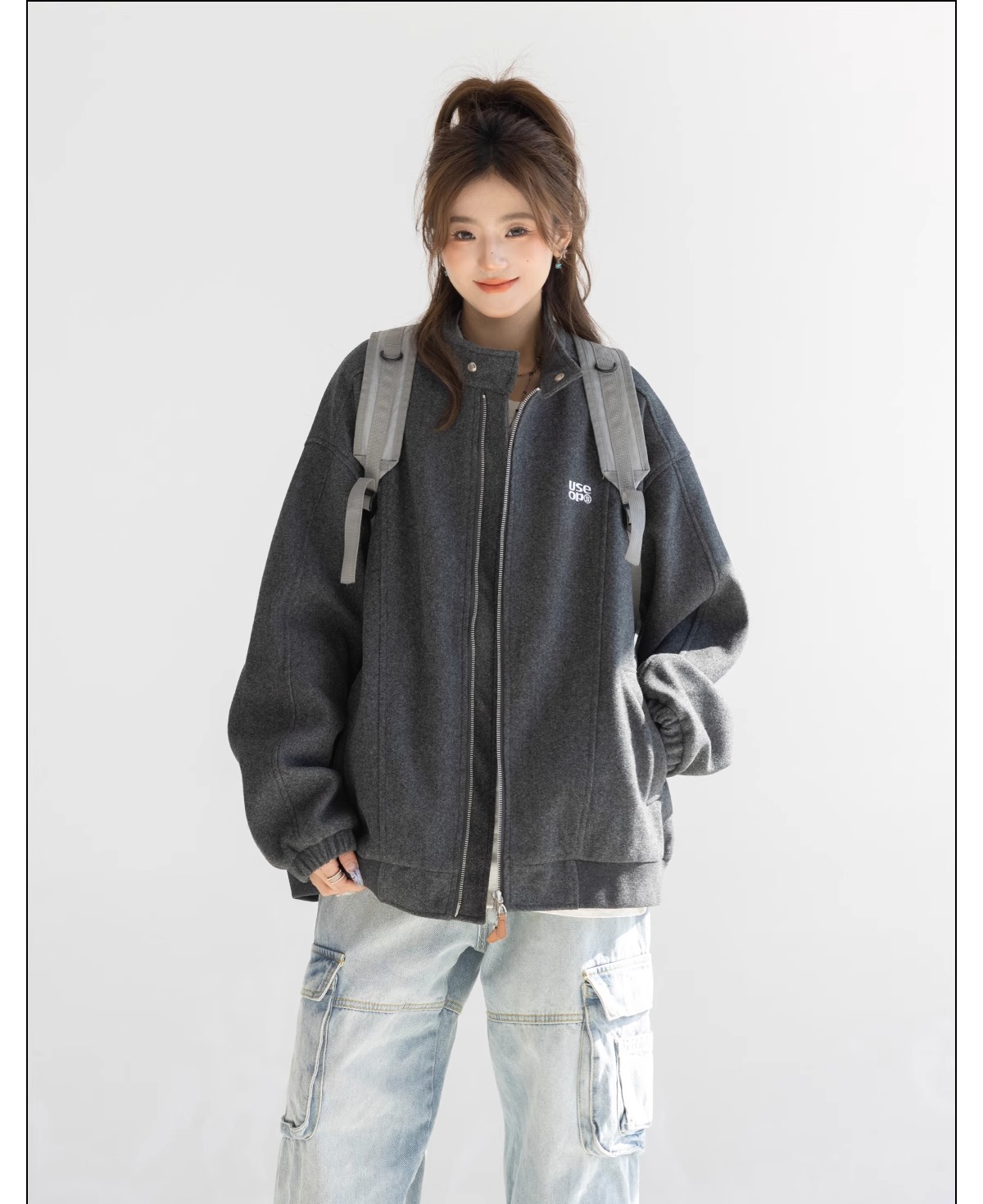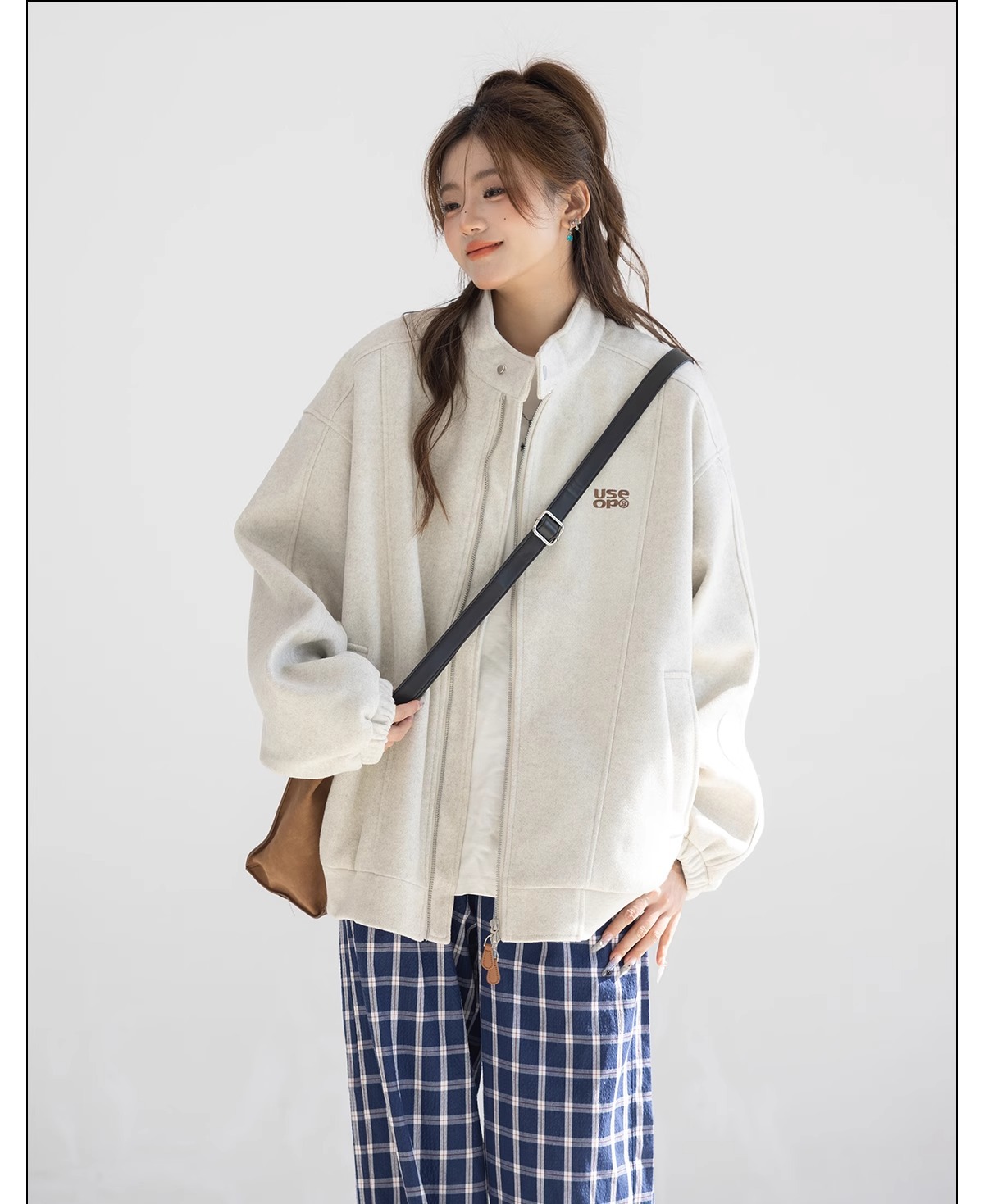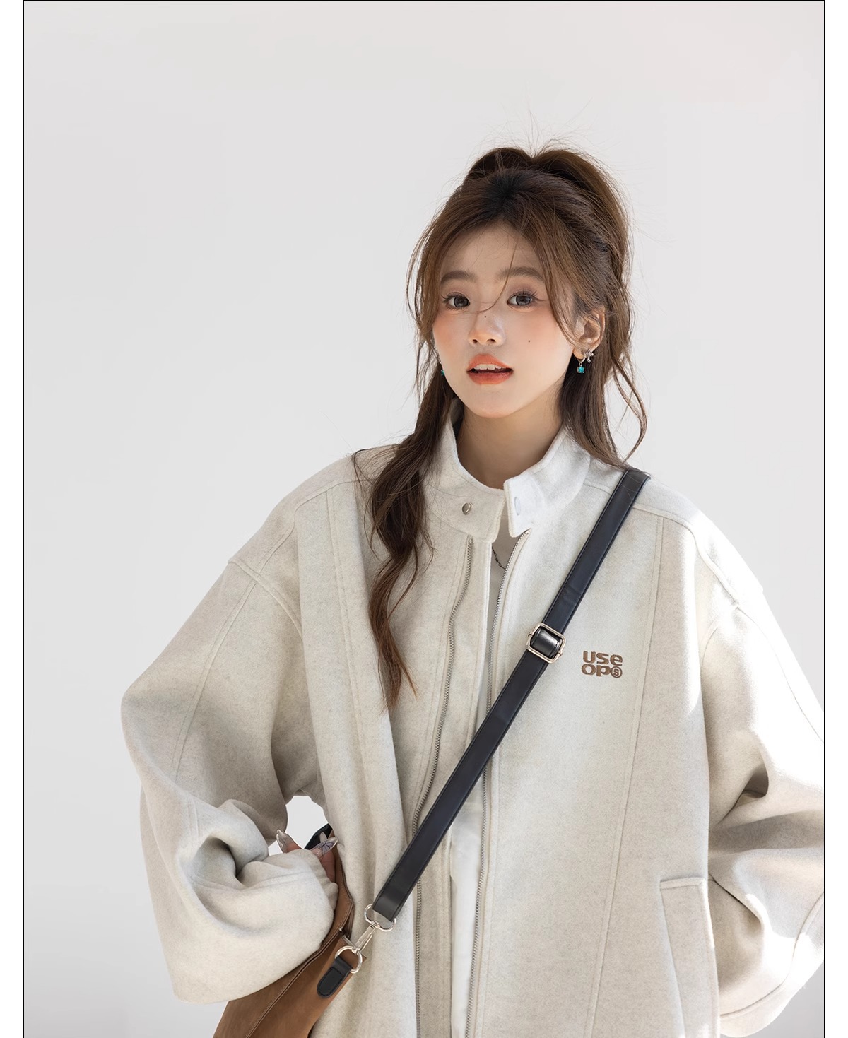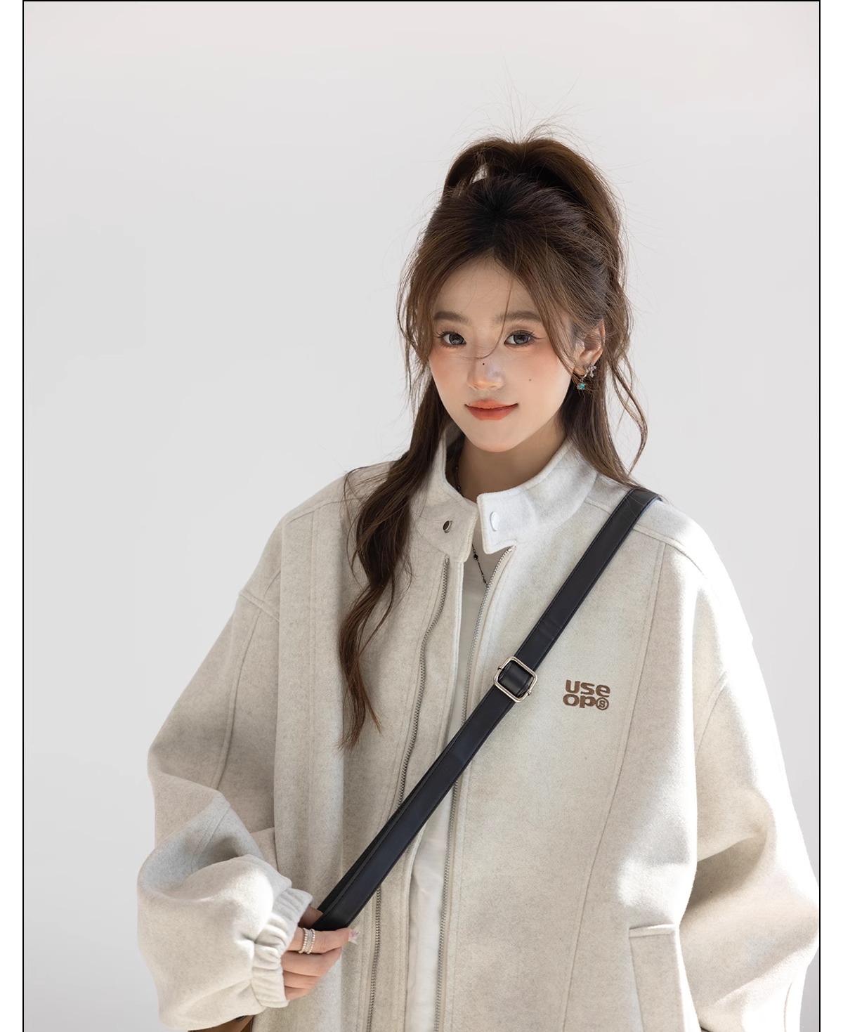 "CHANT2nd" 미국 스타일 게으른 세련된 모직 코트 여성의 봄과 가을 편지 자수 탑 스탠드 칼라 재킷스토어 가기