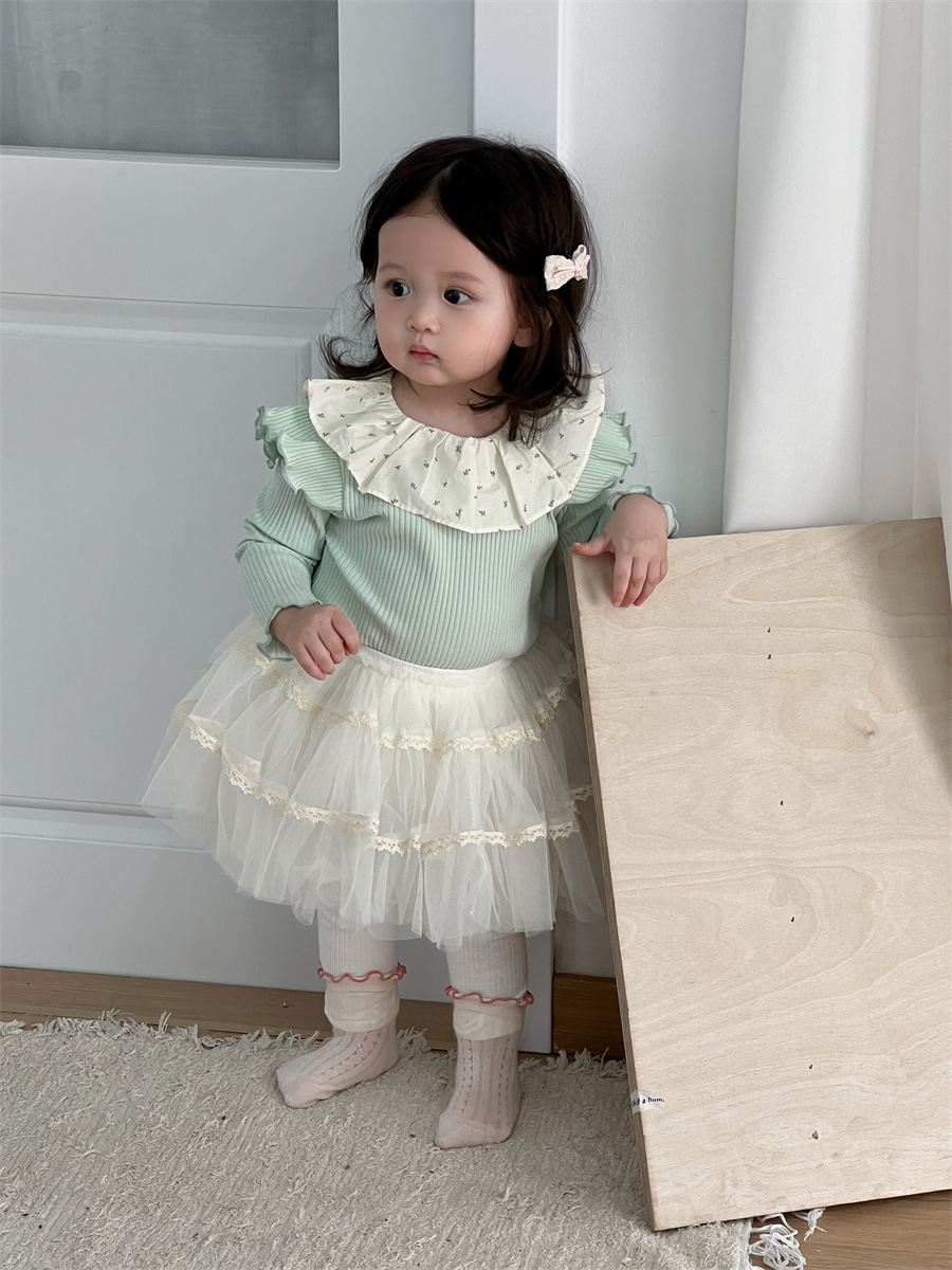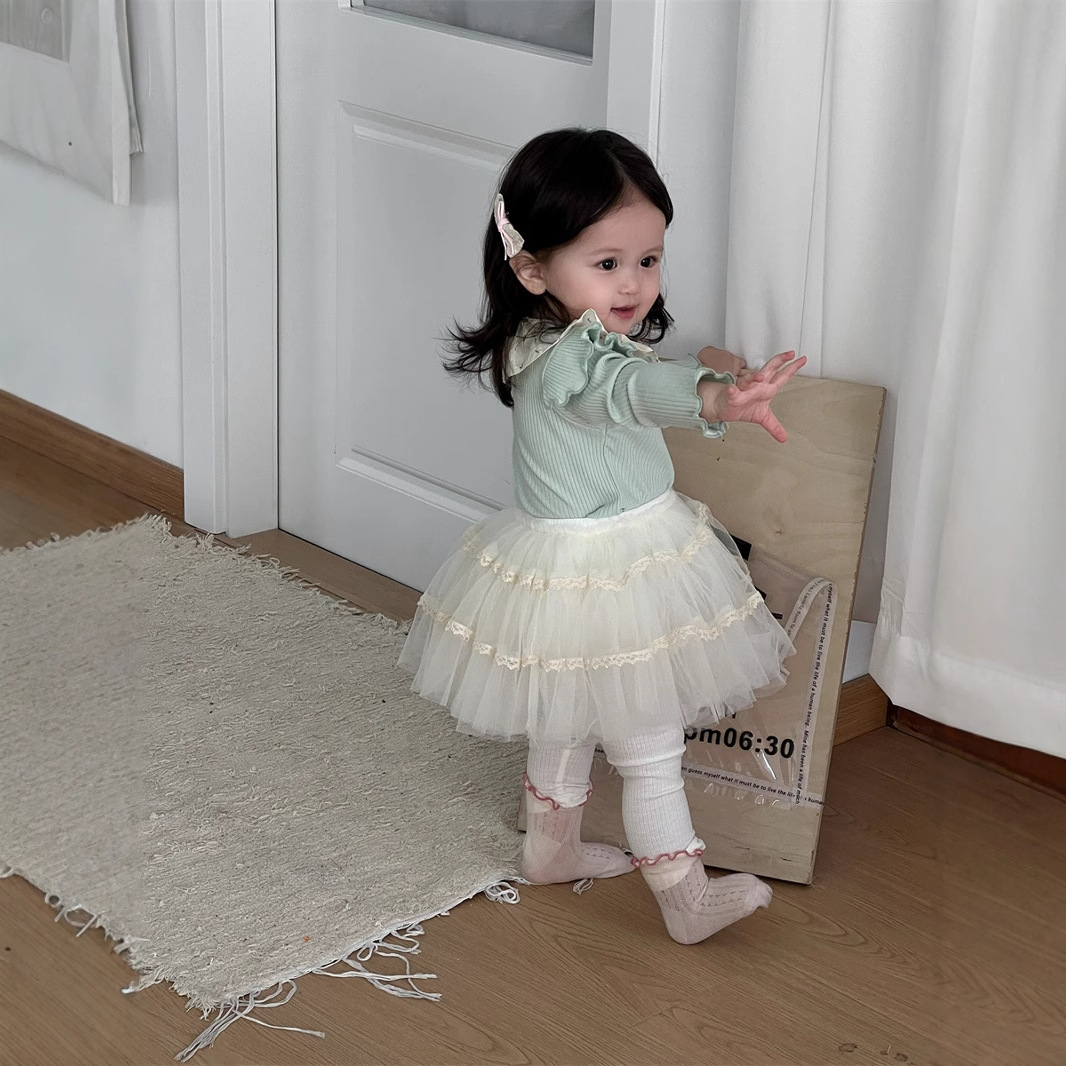 여아 2025 가을 신상 레이스 라펠 밑단 셔츠, 거즈 스커트 및 레깅스 세트, 한국 스타일 아동복, 유아 가을 의류스토어 가기