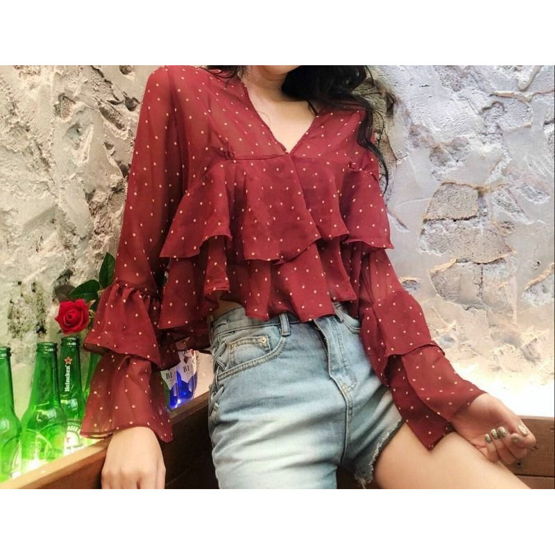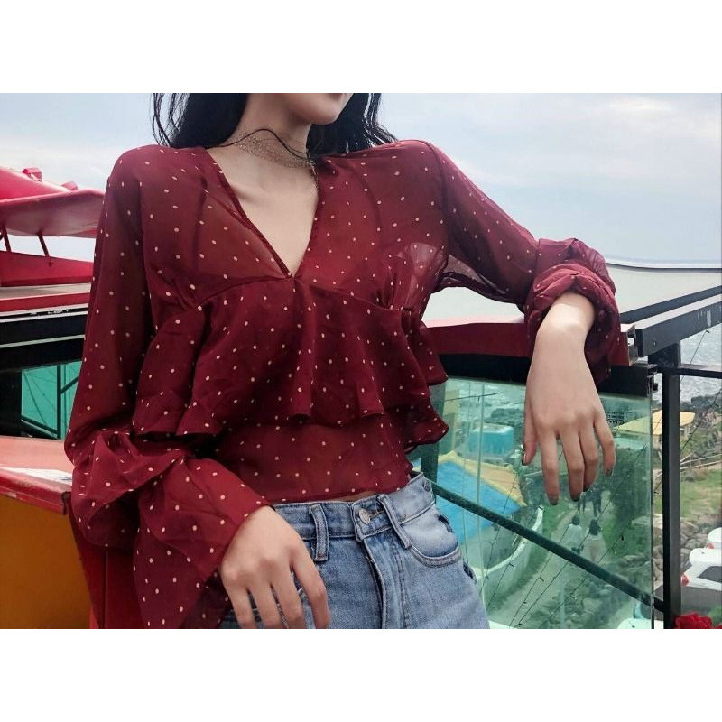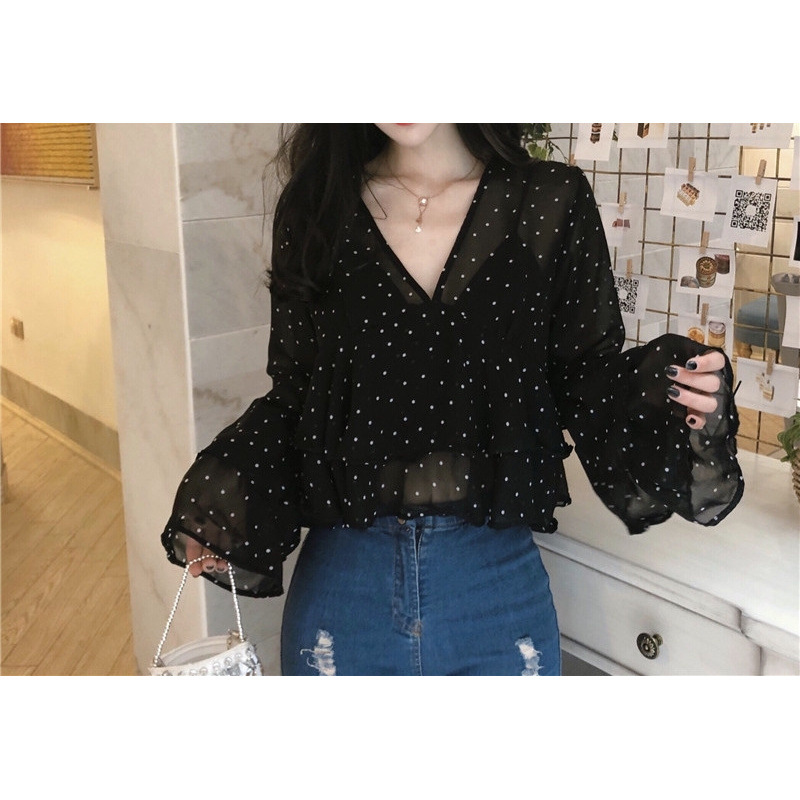 좋은 품질 한풍 세련된 달콤한 러플 웨이브 도트 마이크로 투명 쉬폰 셔츠 여성의 V 넥 느슨한 뿔 슬리브 탑 여름스토어 가기