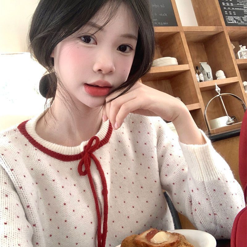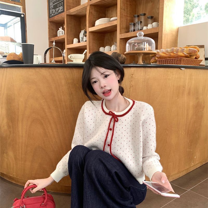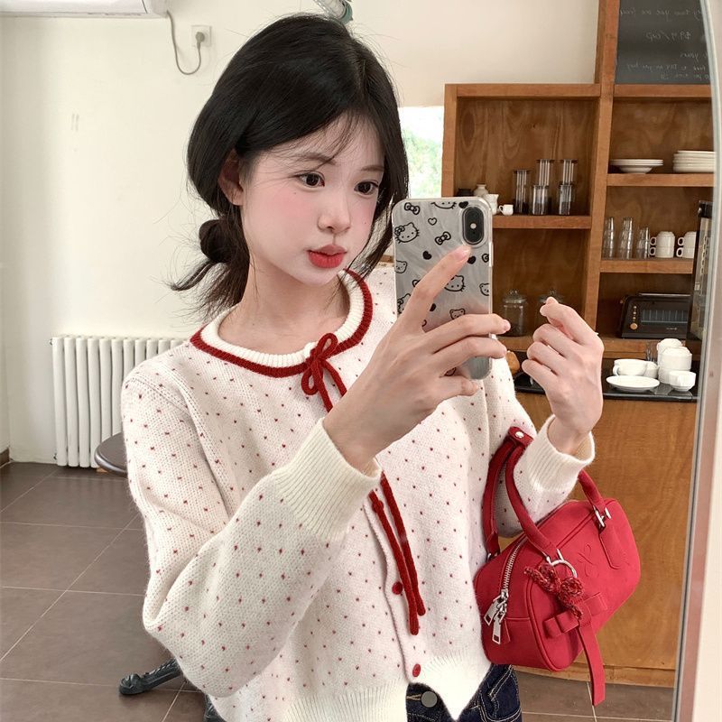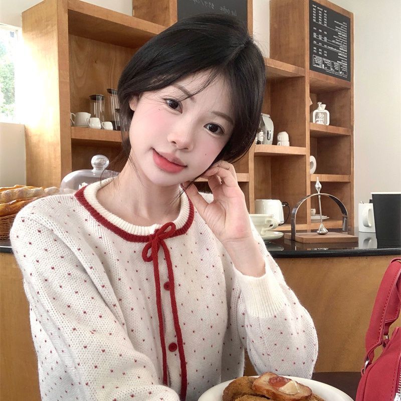 사랑 자카드 활 레이스 짧은 스웨터 코트 여성의 가을과 겨울 달콤한 기질 우아한 느슨한 니트 카디건스토어 가기