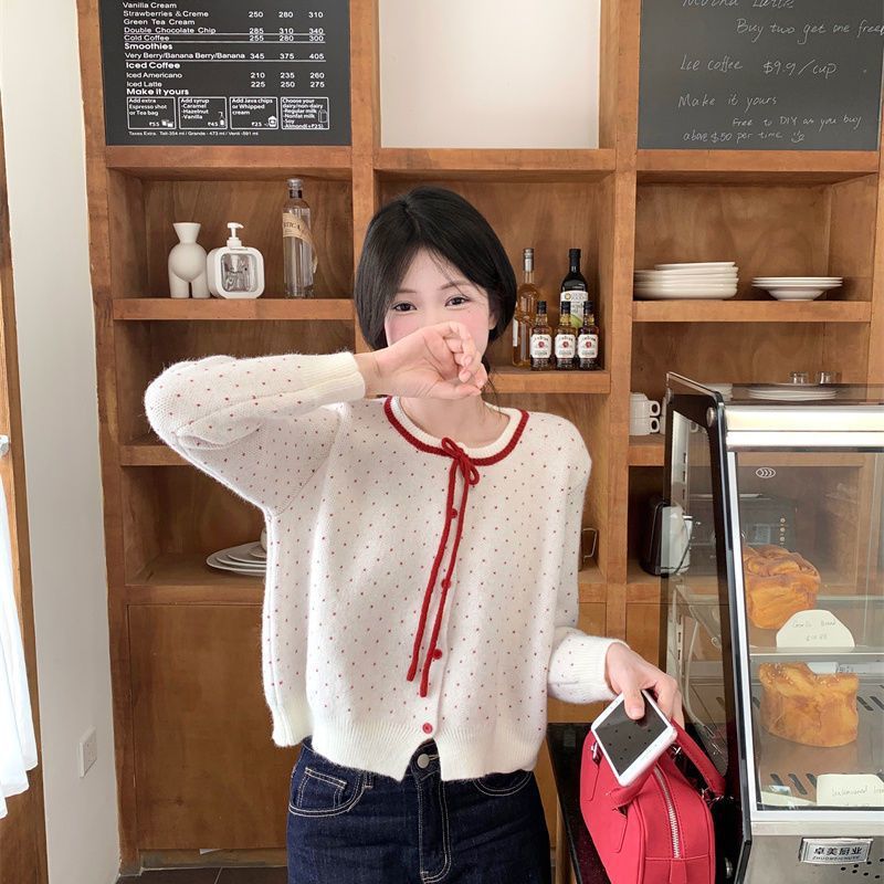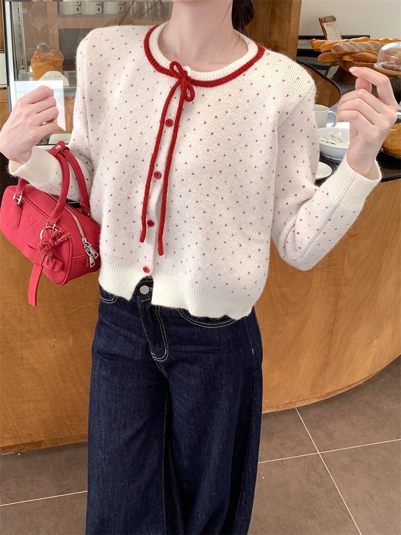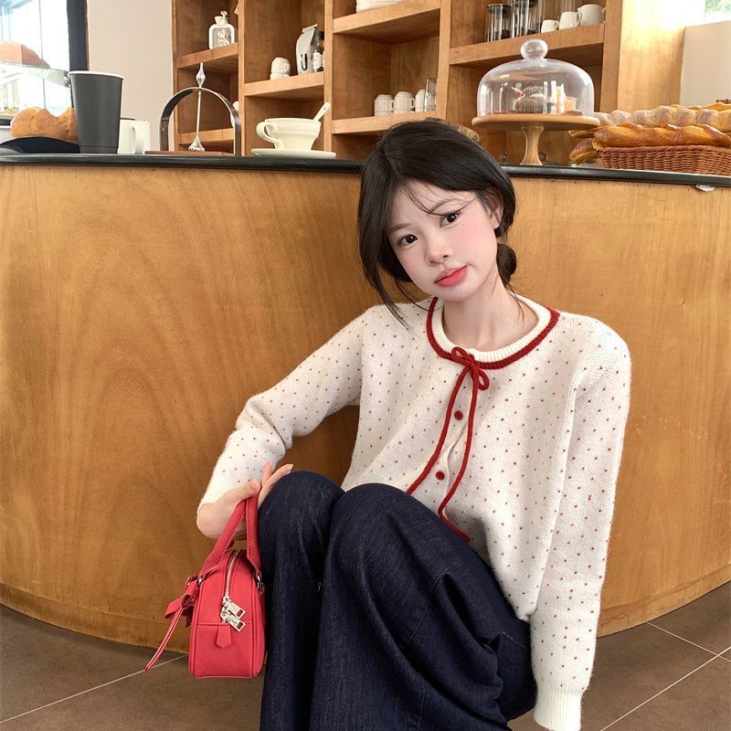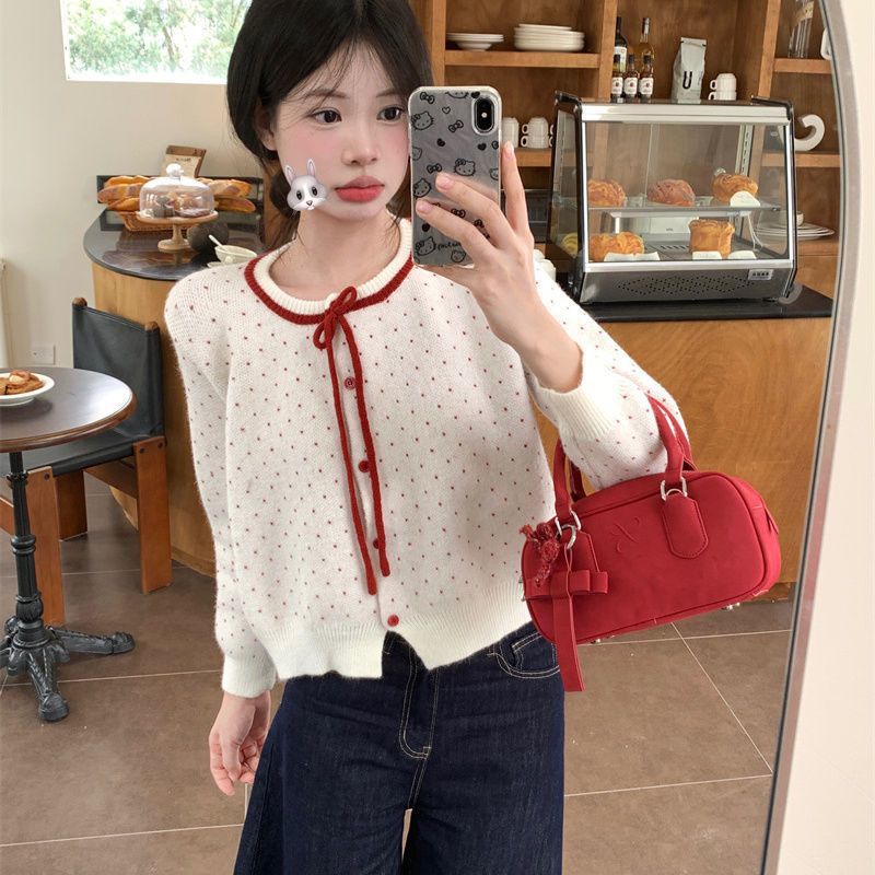 사랑 자카드 활 레이스 짧은 스웨터 코트 여성의 가을과 겨울 달콤한 기질 우아한 느슨한 니트 카디건