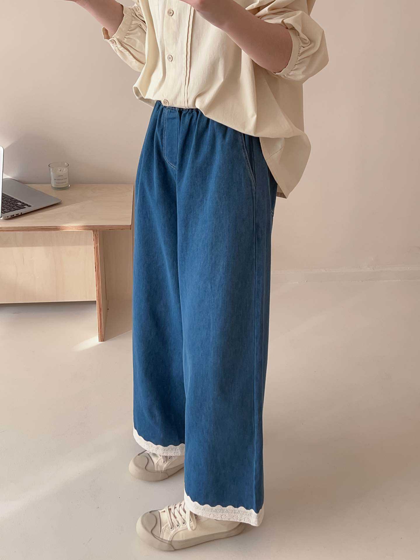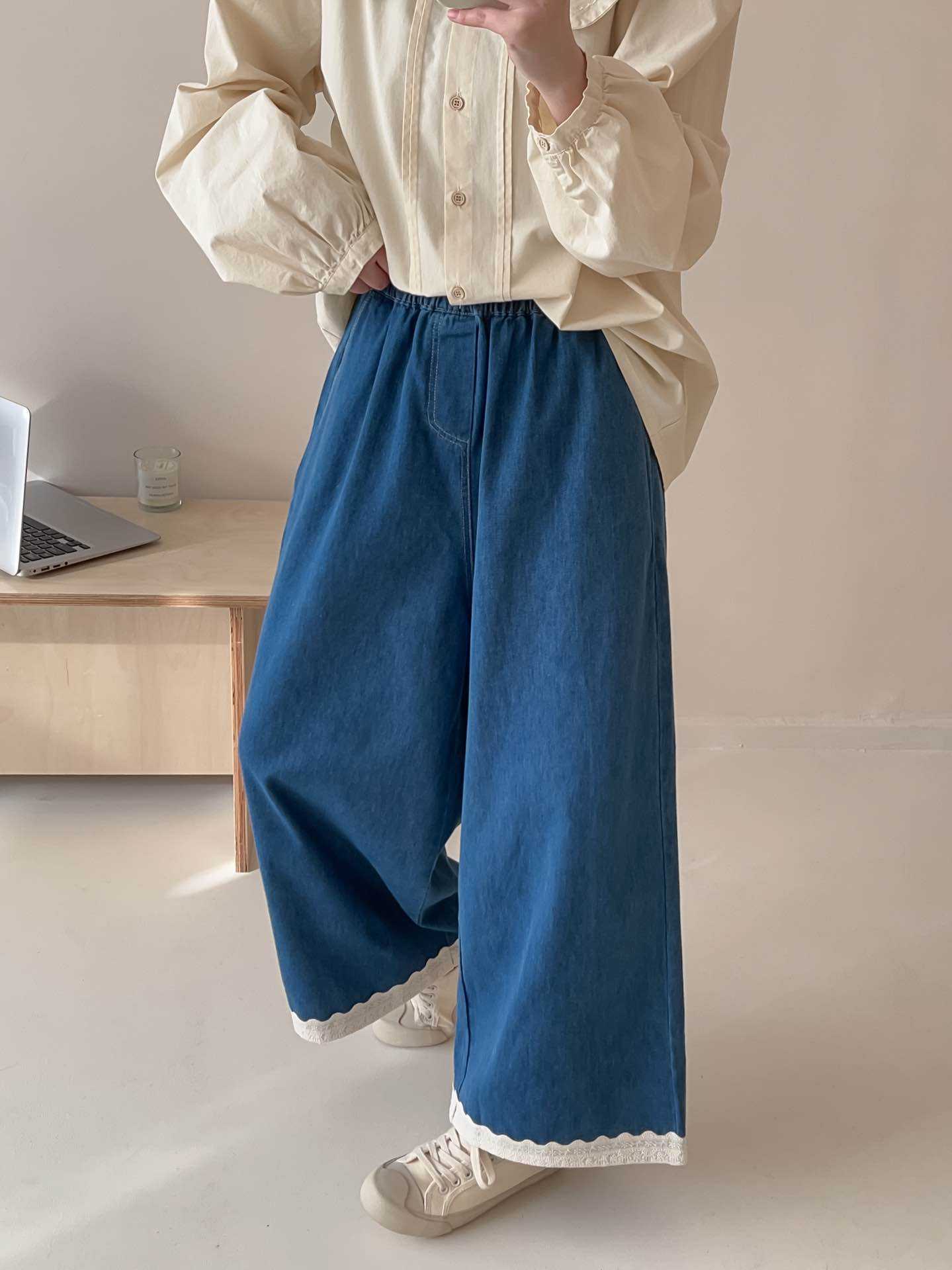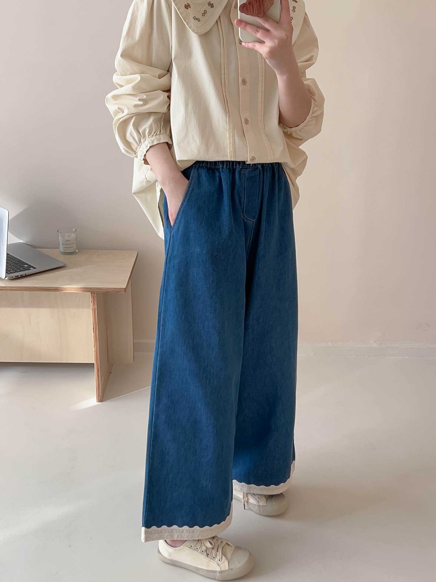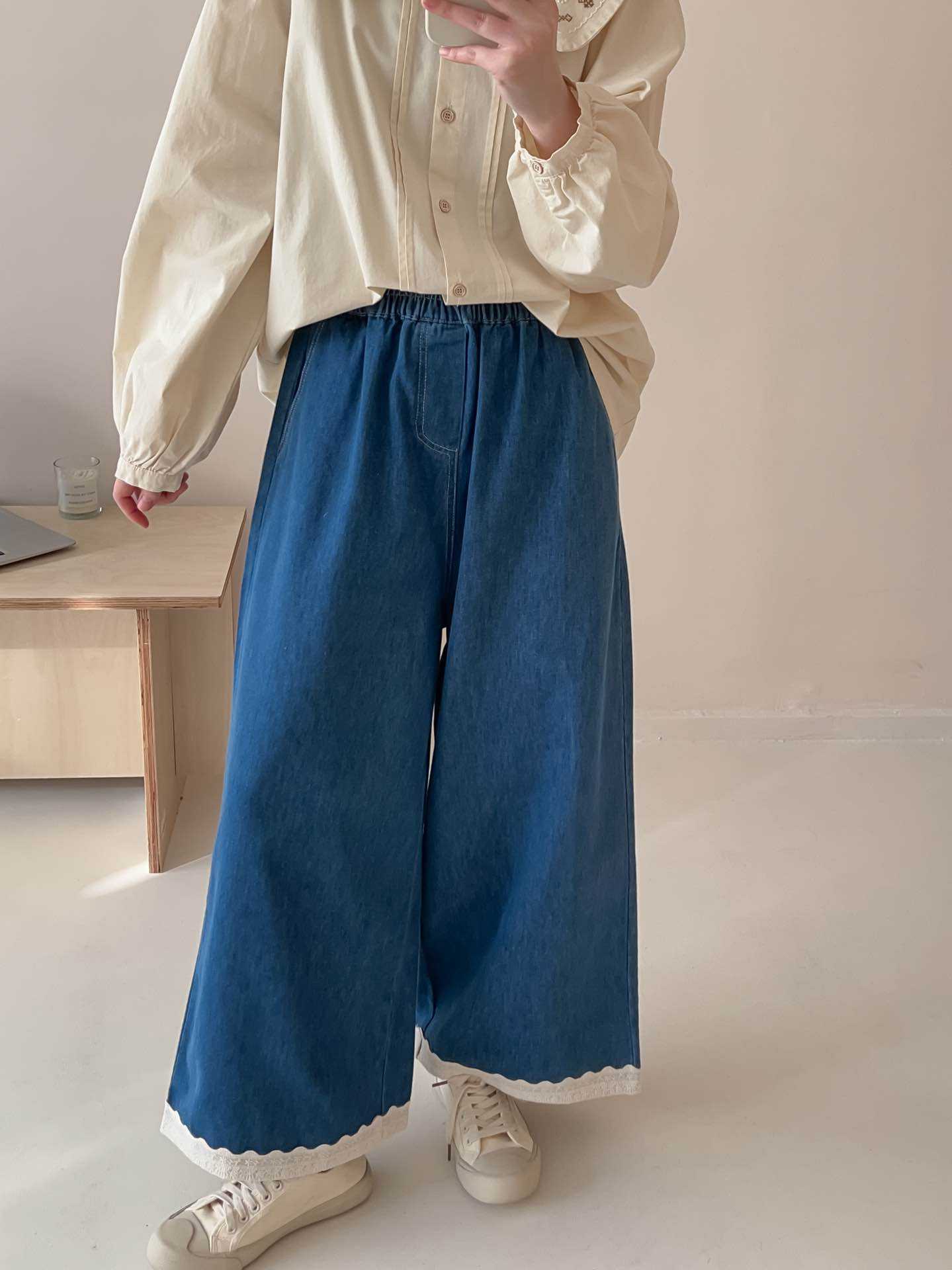 일본식 스티칭 레이스 레이스 청바지 2025 봄 루즈 캐주얼 하이 허리 올매치 와이드 레그 바지스토어 가기