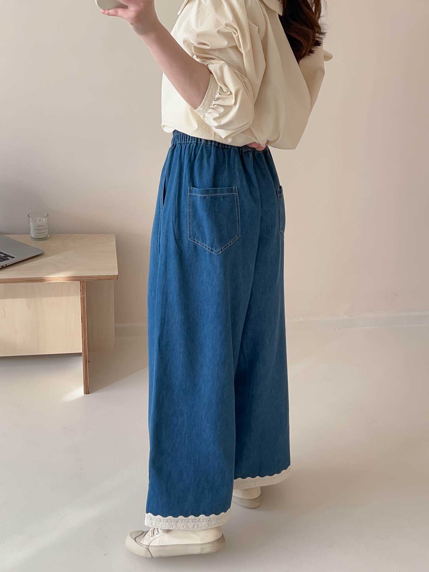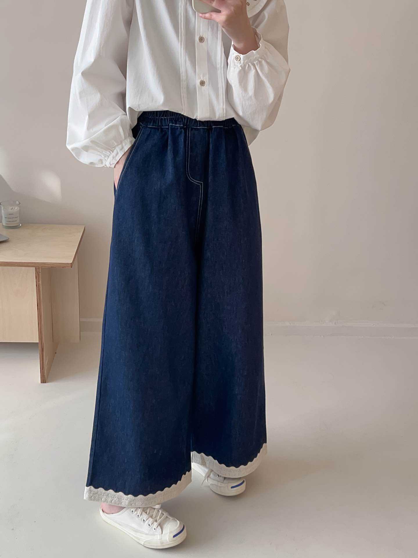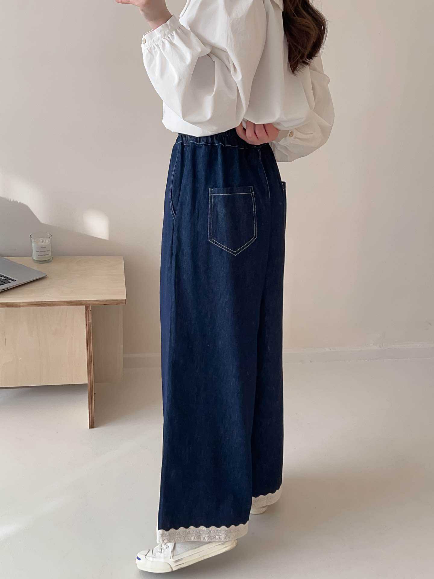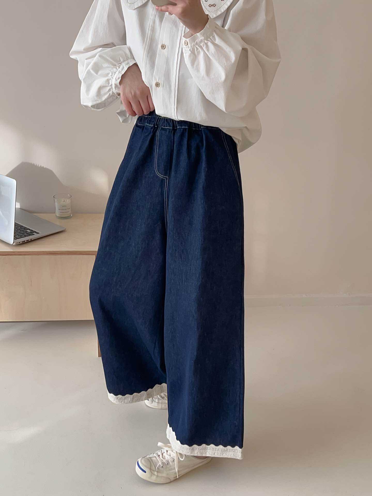 일본식 스티칭 레이스 레이스 청바지 2025 봄 루즈 캐주얼 하이 허리 올매치 와이드 레그 바지스토어 가기