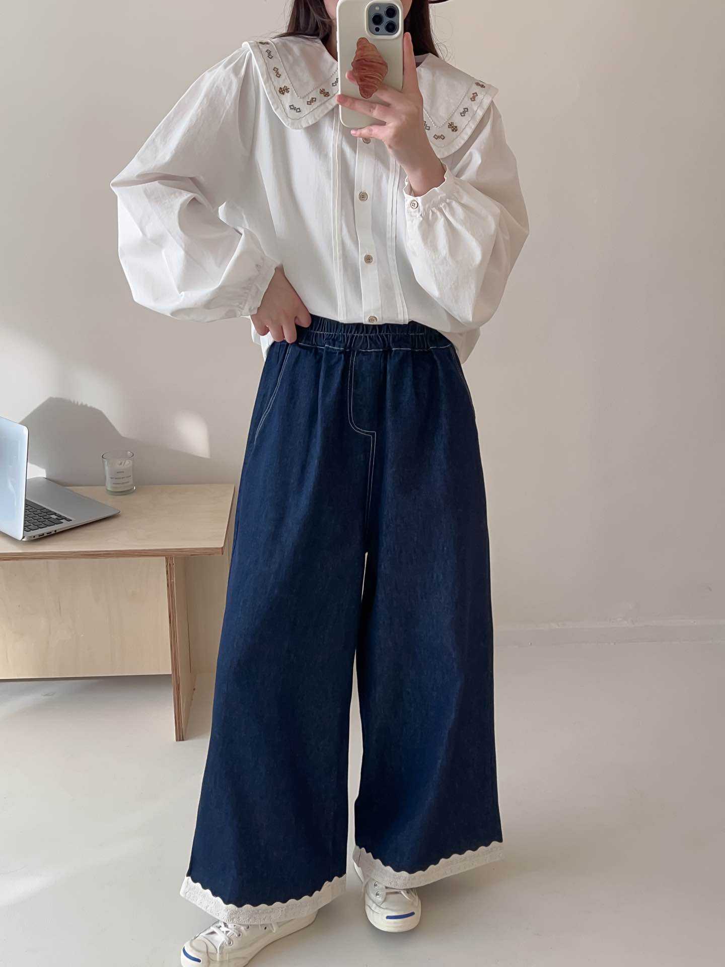 일본식 스티칭 레이스 레이스 청바지 2025 봄 루즈 캐주얼 하이 허리 올매치 와이드 레그 바지
