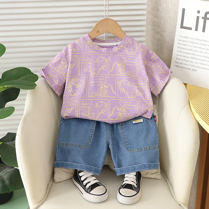 어린이 의류 도매 여름 어린이 세트 2025 새로운 만화 전체 인쇄 공룡 짧은 소매 티셔츠 소년 여름 세트
