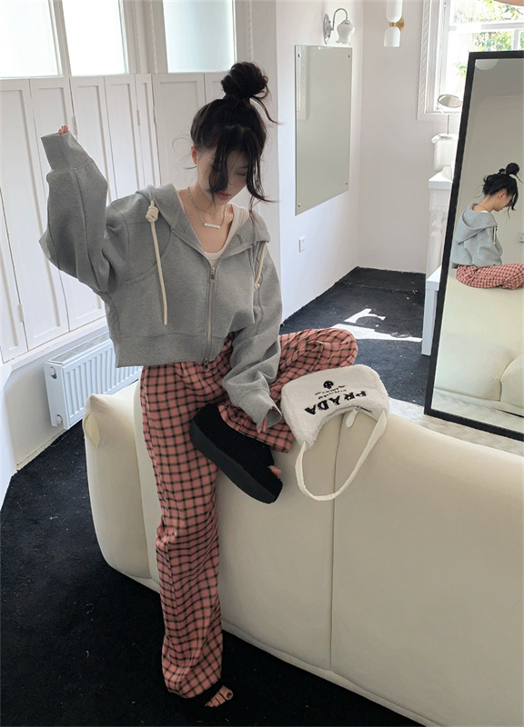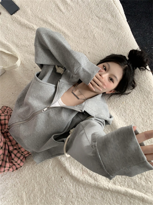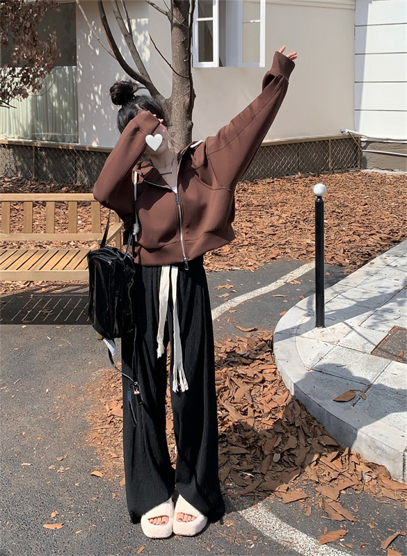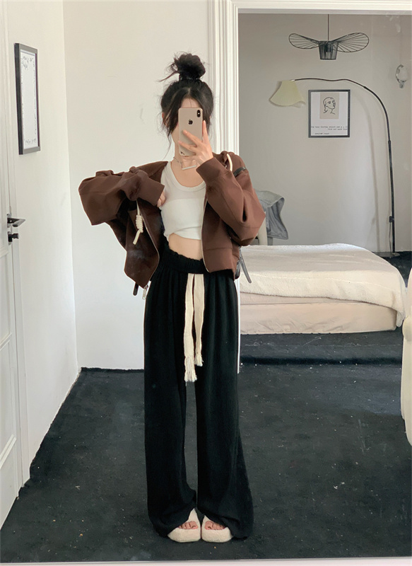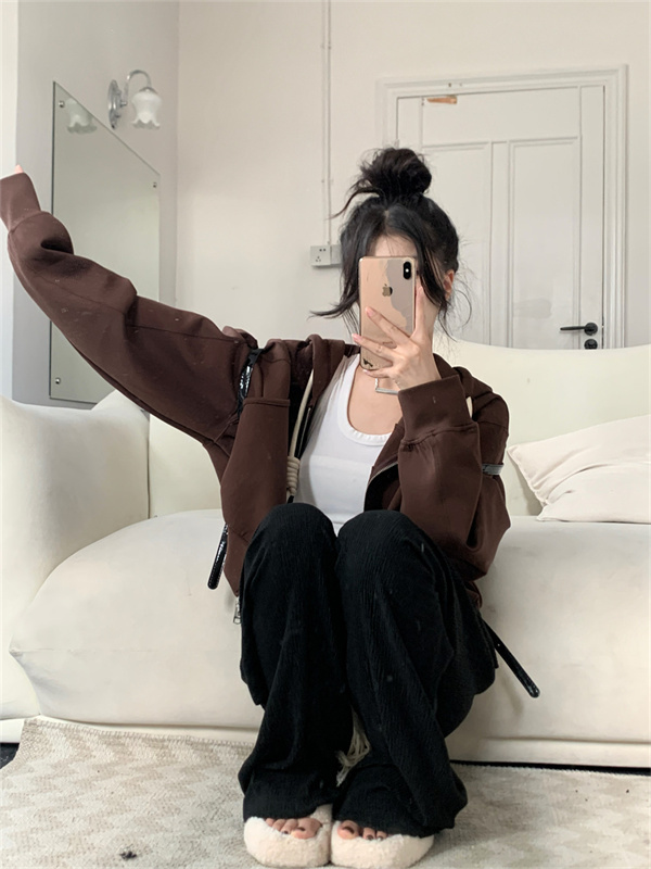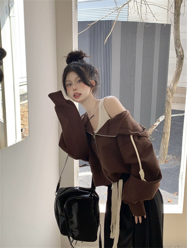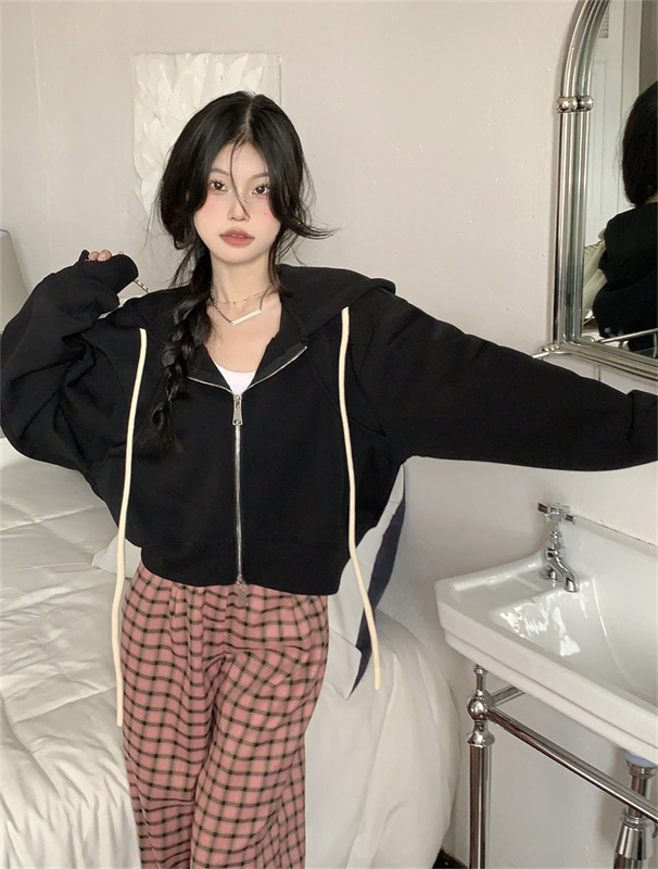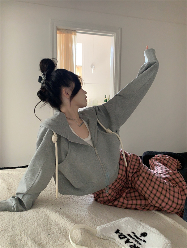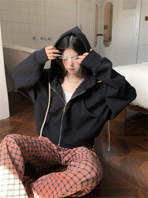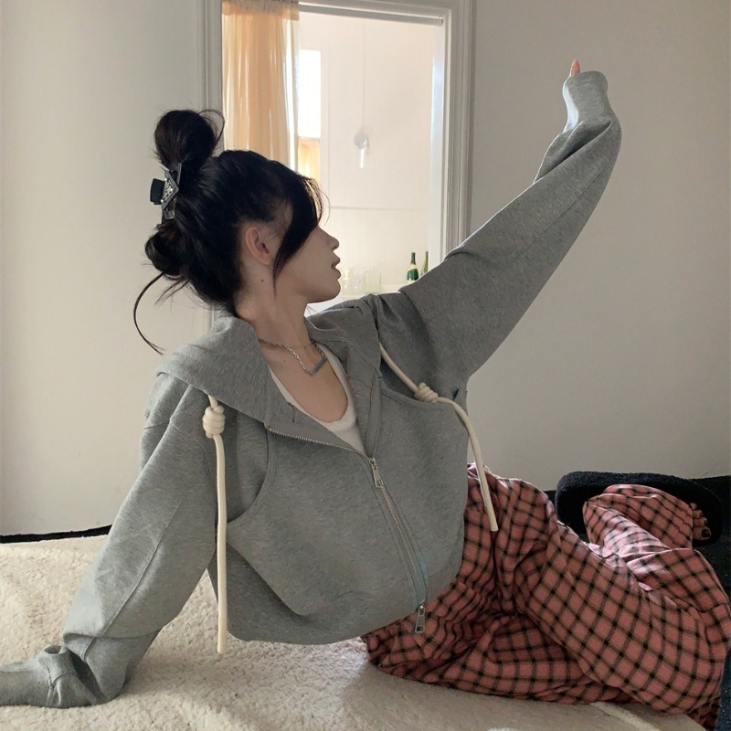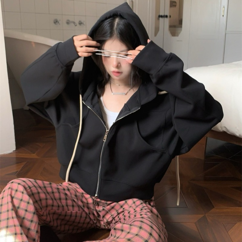 짧은 후드 스웨트 코트 여성의 봄과 가을 얇은 한국 스타일 2025 새로운 뜨거운 소녀 디자인 감각 느슨한 끈 긴 소매