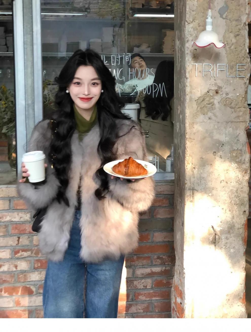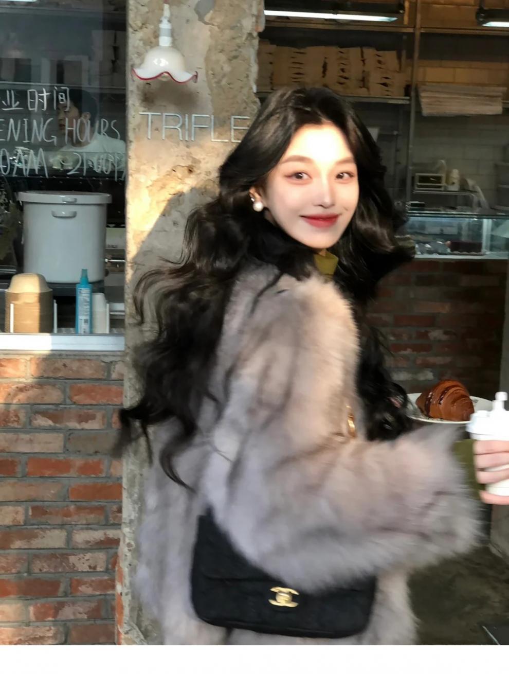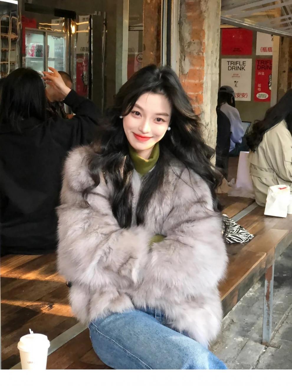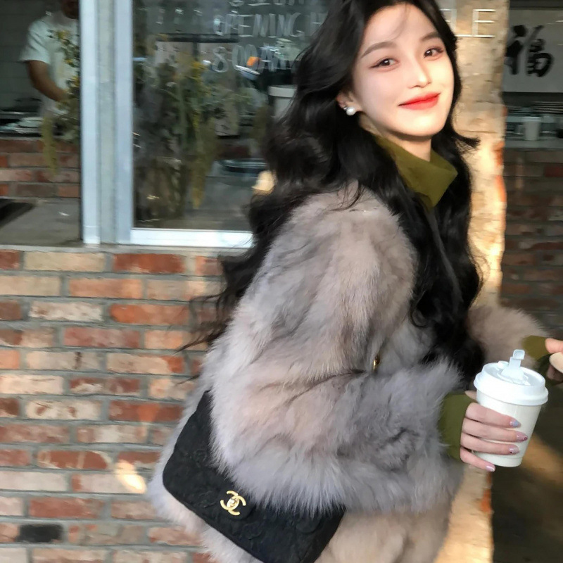 여성을위한 회색 모피 원피스 모피 짧은 코트 2024 겨울 새로운 스타일 하이 엔드 패션 다목적 패션 캐주얼스토어 가기