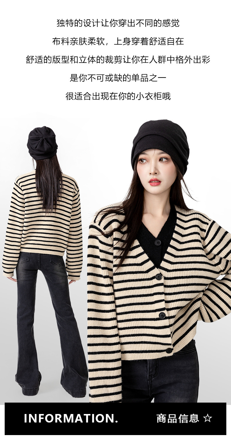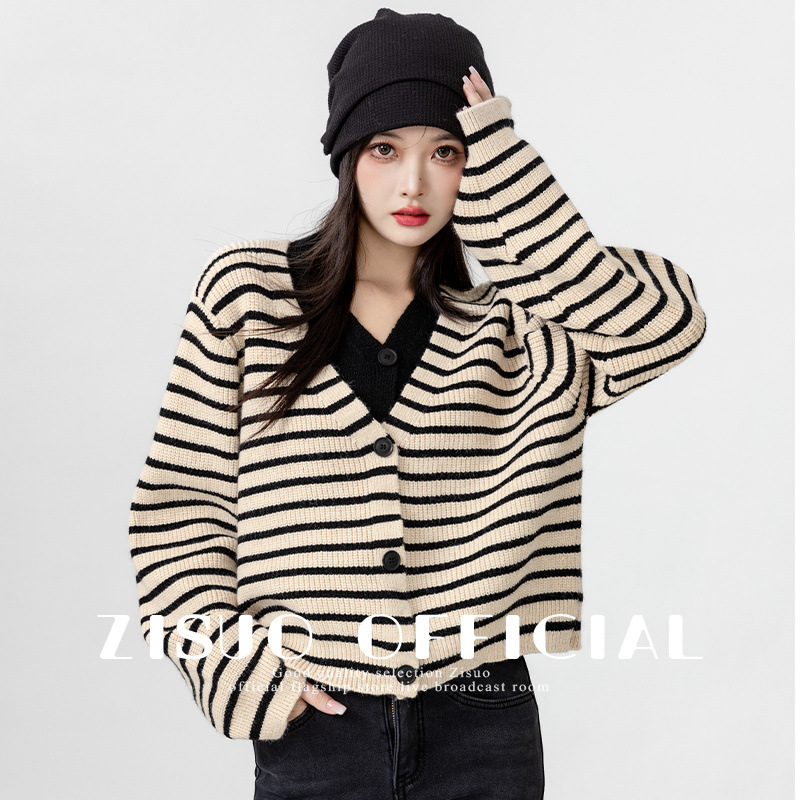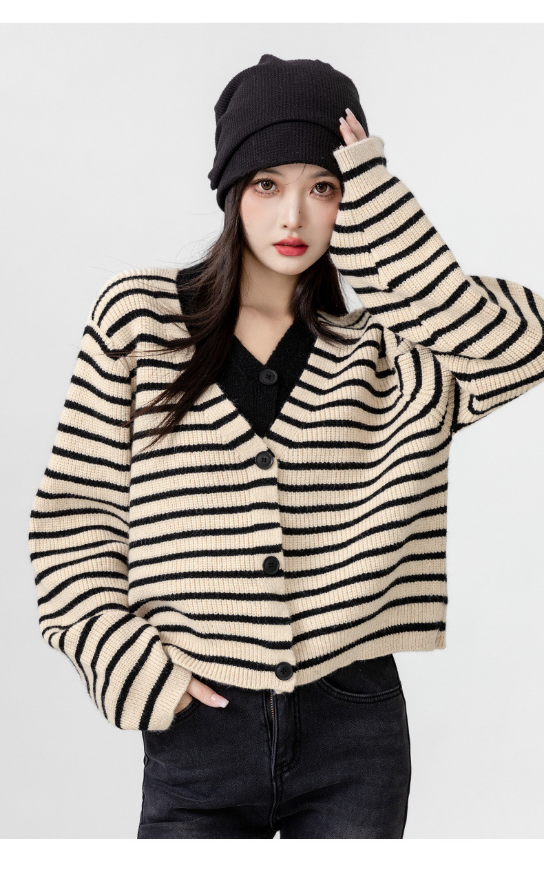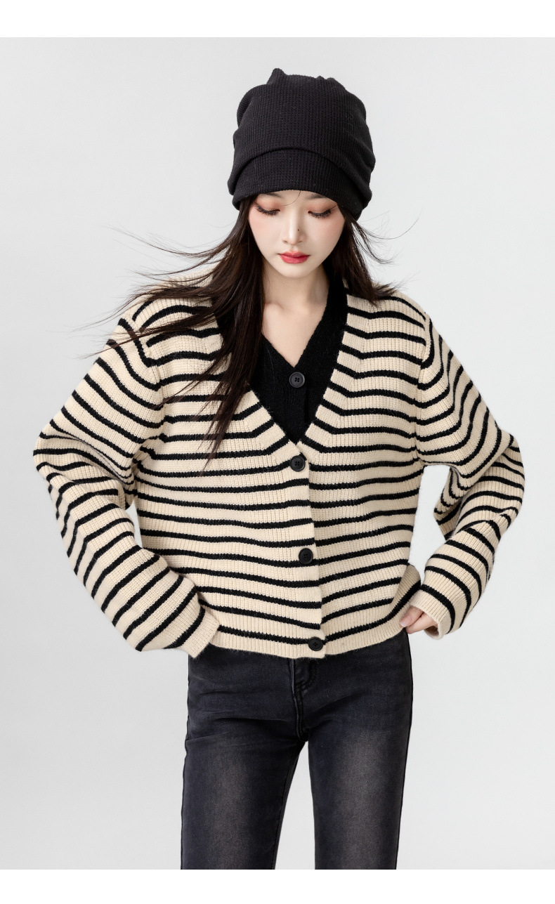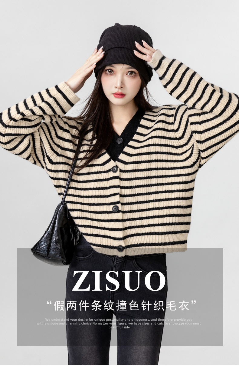 빈티지 스웨터 코트 여성의 봄과 가을 2025 새로운 도착 바느질 가짜 투피스 스트라이프 니트 카디건 외부 쇼트 탑