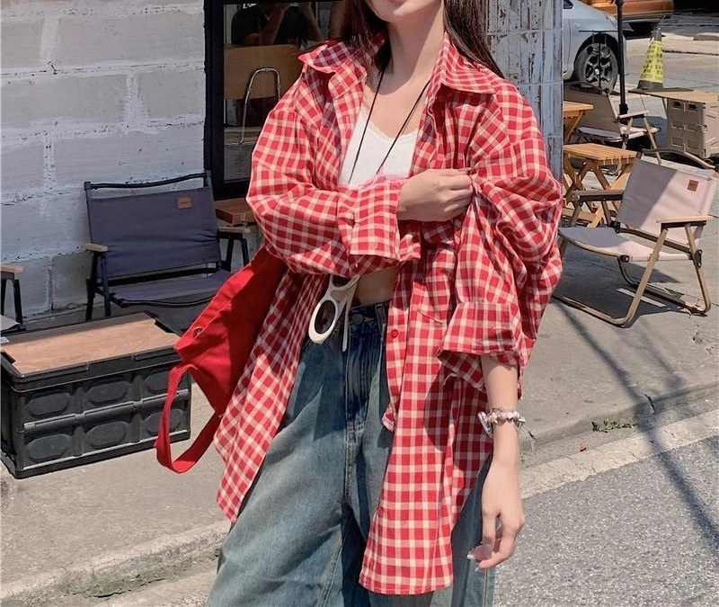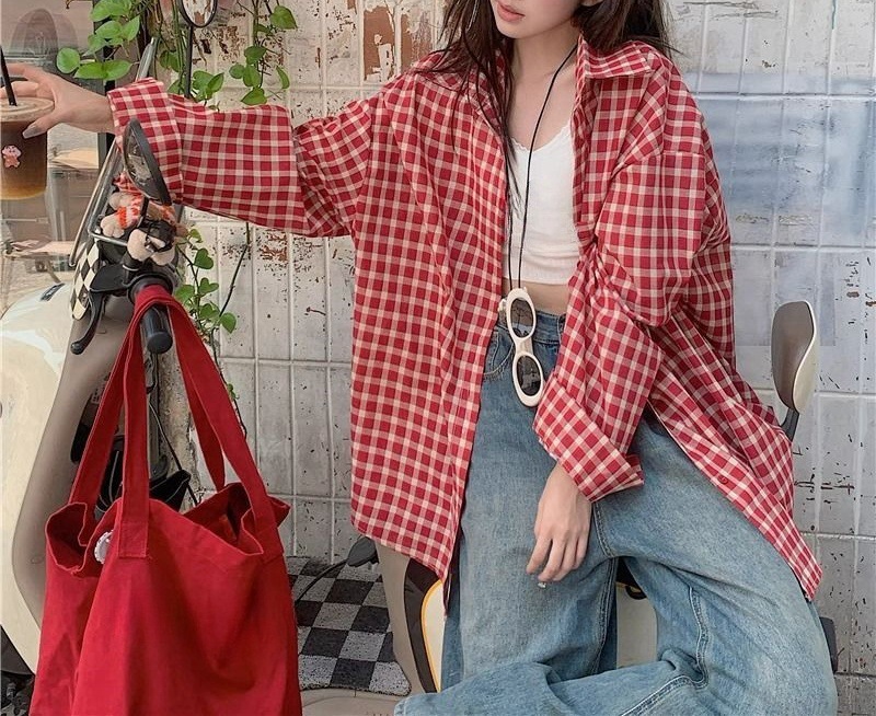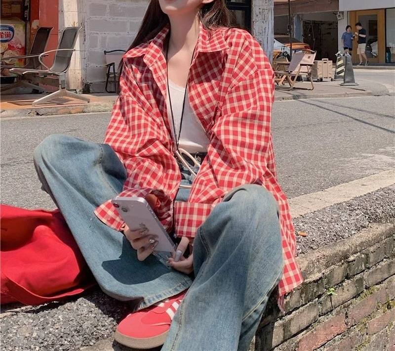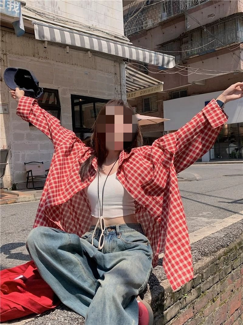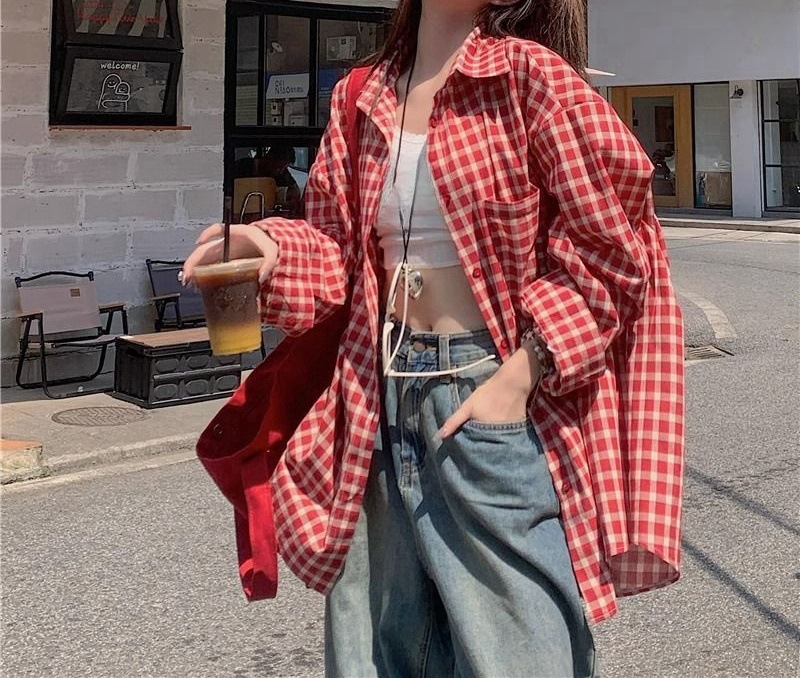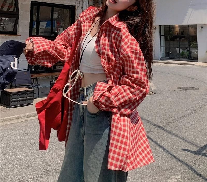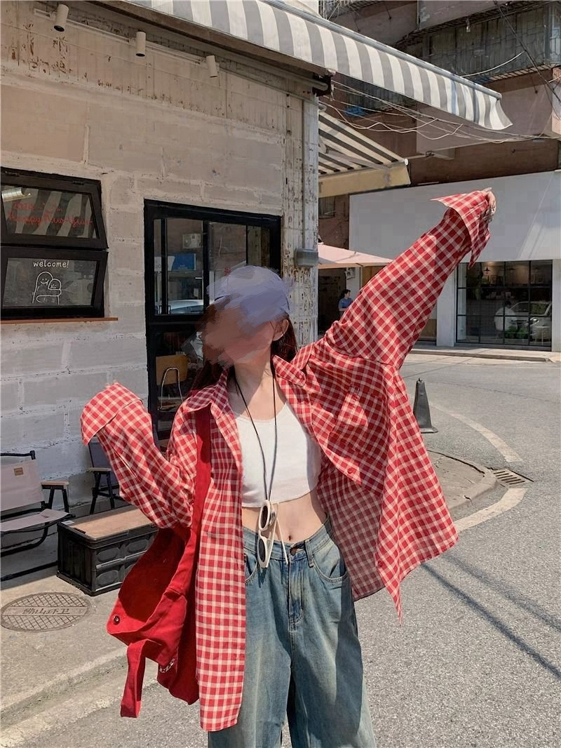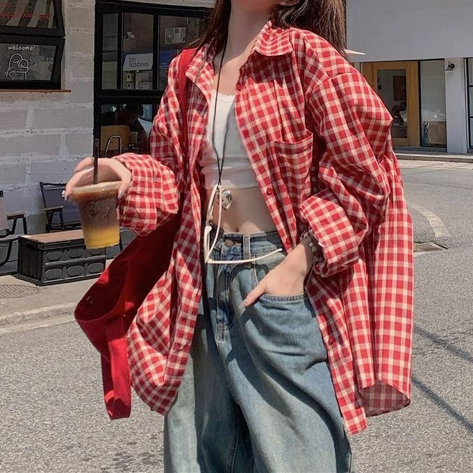 빈티지 빨간 격자 무늬 셔츠 긴팔 폴로 칼라 셔츠 여성의 이른 봄 틈새 디자인 느슨한 슬리밍 카디건스토어 가기