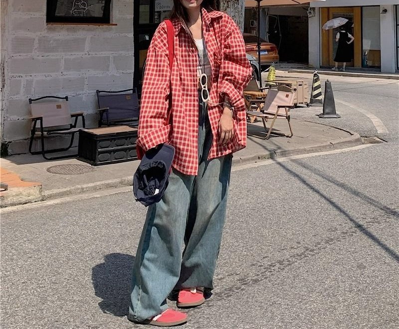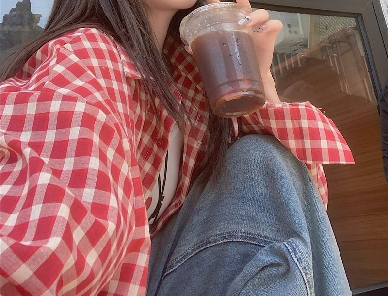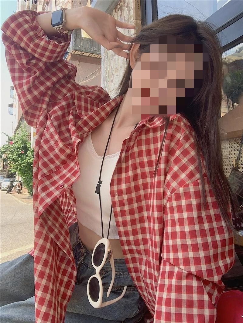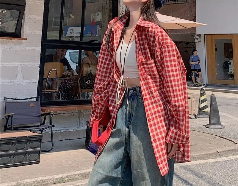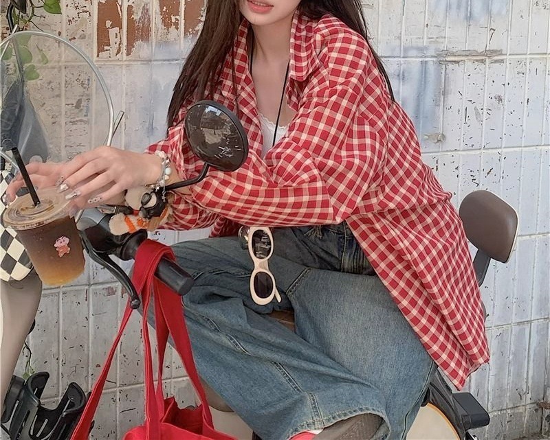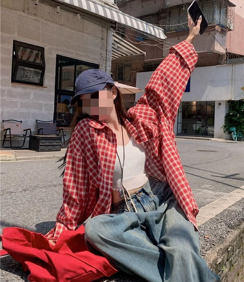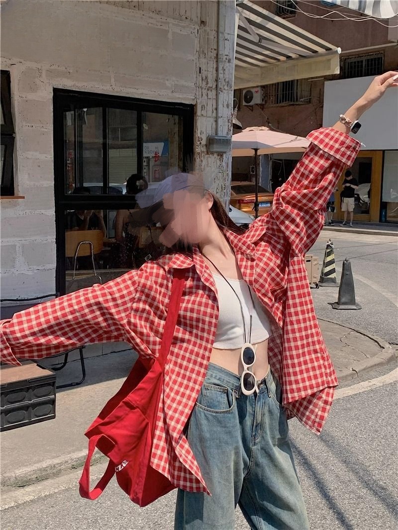 빈티지 빨간 격자 무늬 셔츠 긴팔 폴로 칼라 셔츠 여성의 이른 봄 틈새 디자인 느슨한 슬리밍 카디건스토어 가기