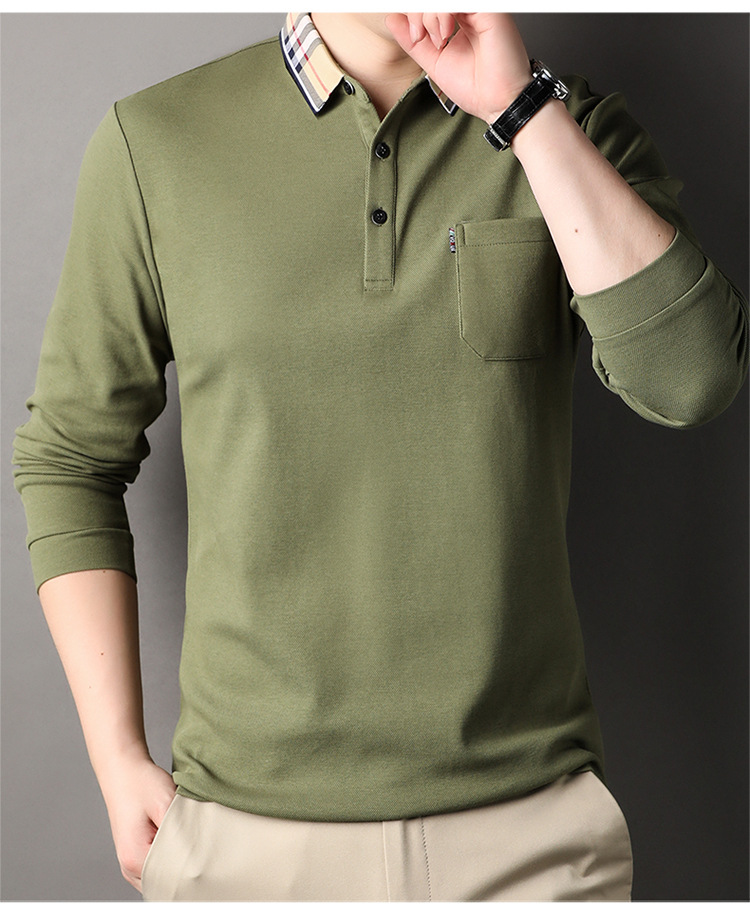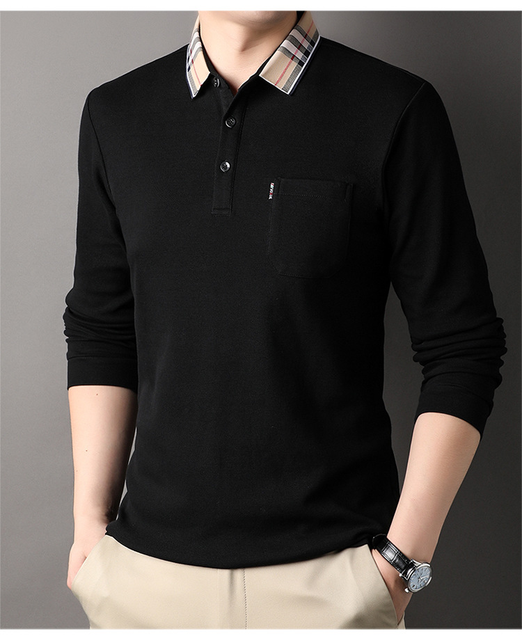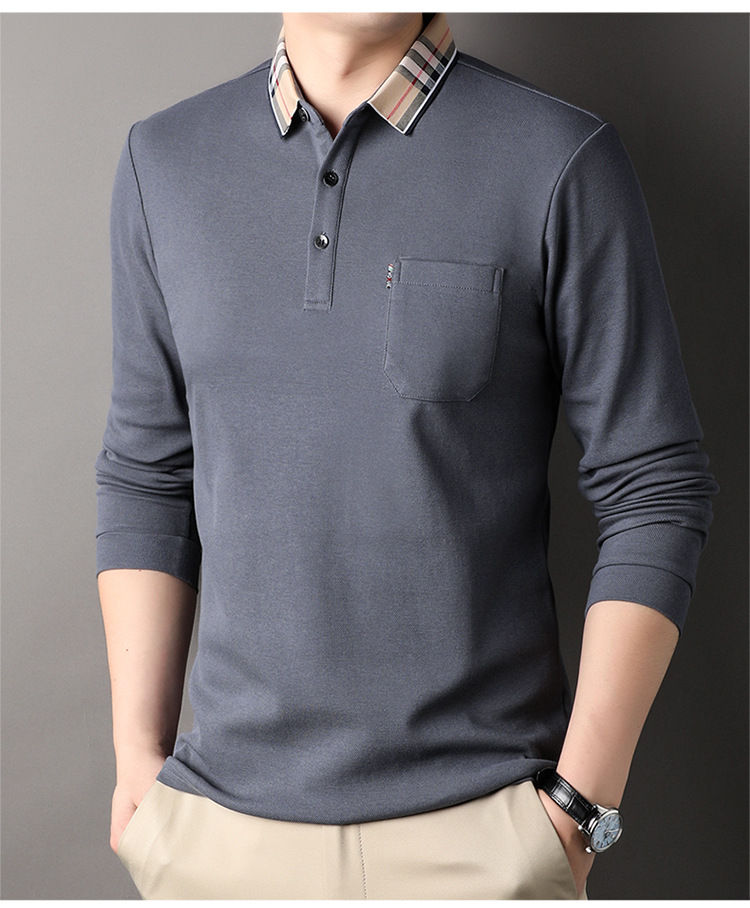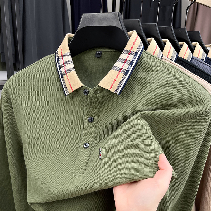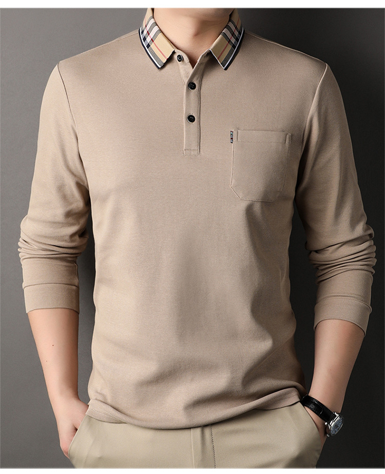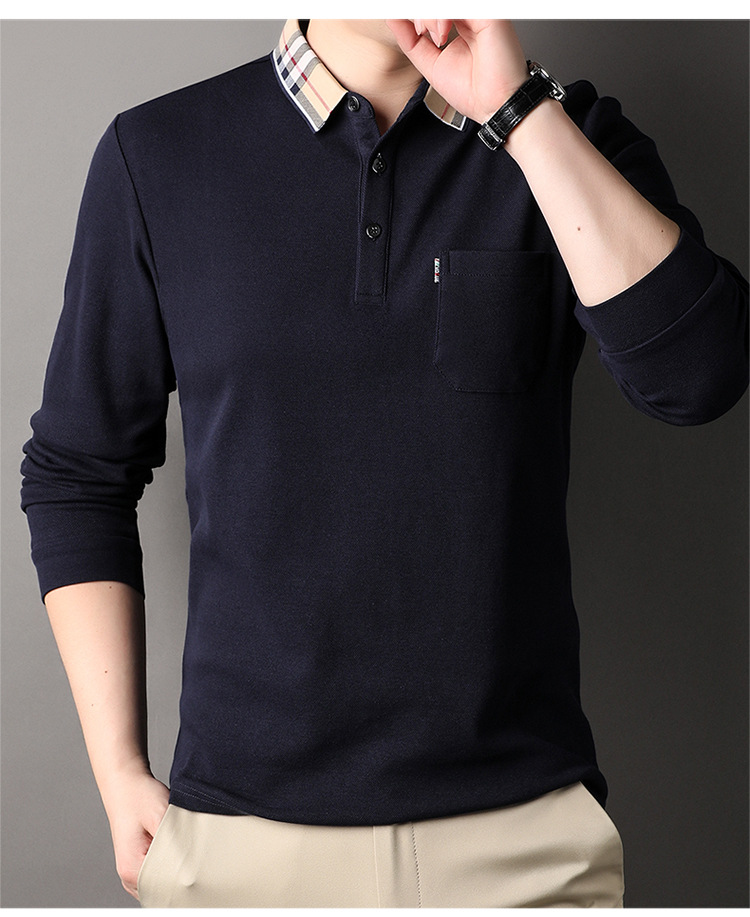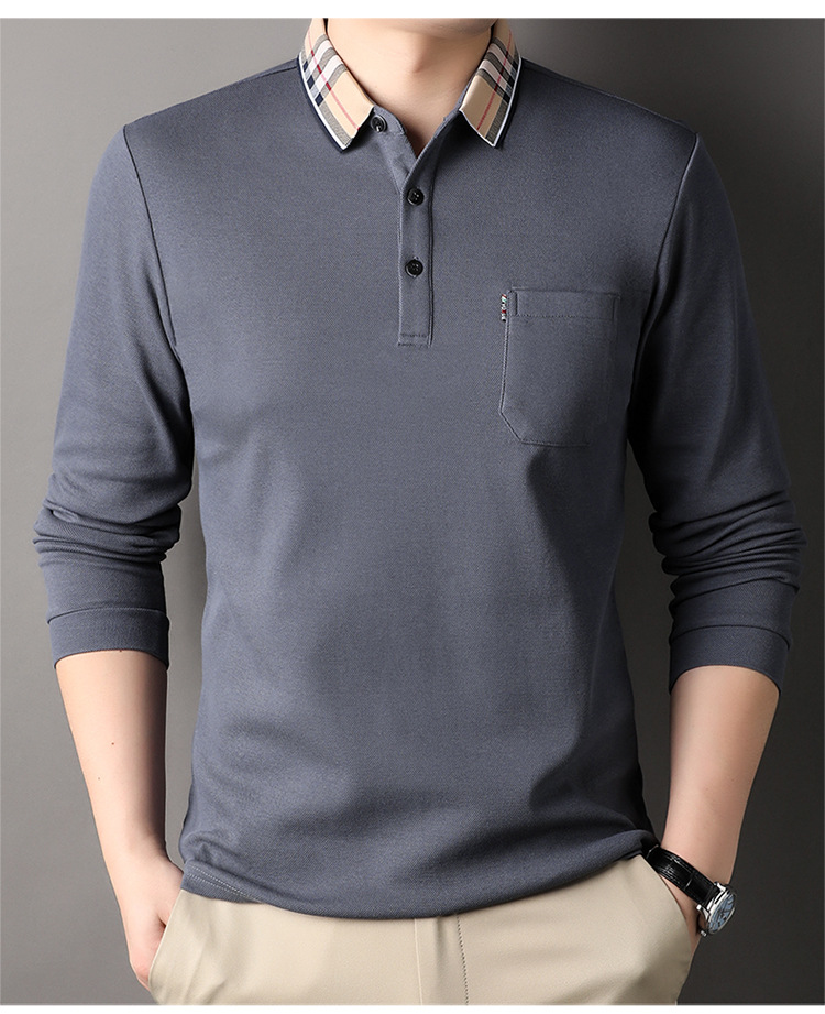 순수 코튼 남성용 긴팔 티셔츠 옷깃 봄과 가을 캐주얼 남성용 루즈베이스 티셔츠 남성용 리얼 포켓 탑
