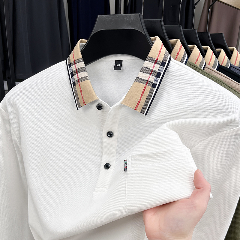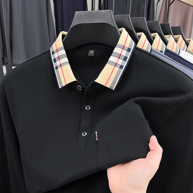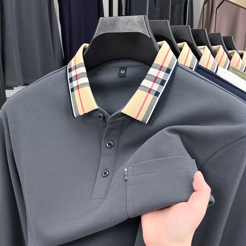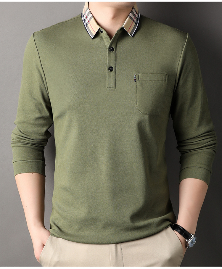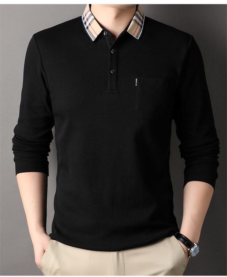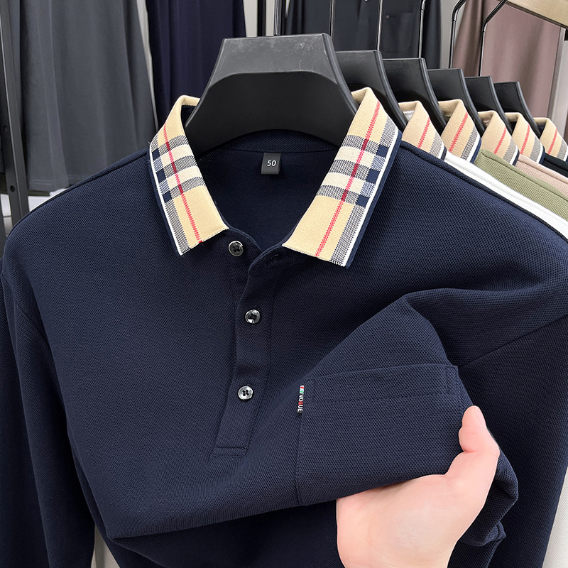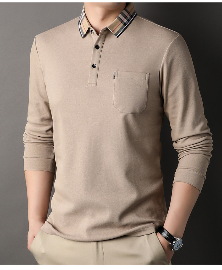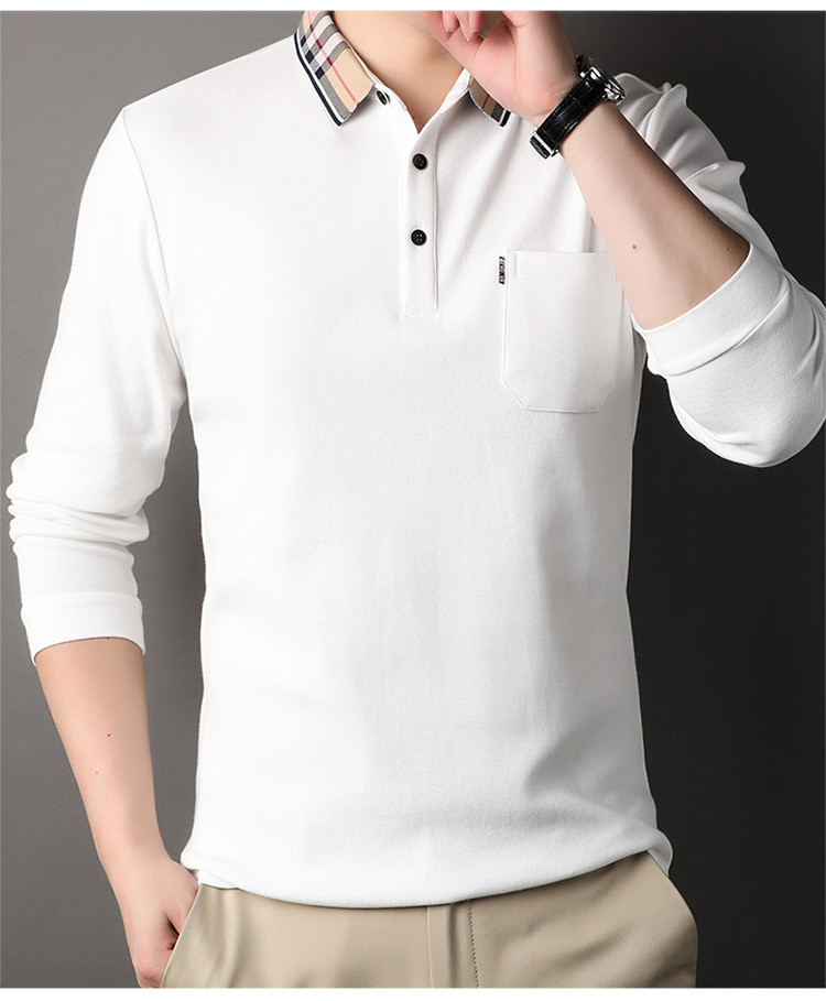 순수 코튼 남성용 긴팔 티셔츠 옷깃 봄과 가을 캐주얼 남성용 루즈베이스 티셔츠 남성용 리얼 포켓 탑