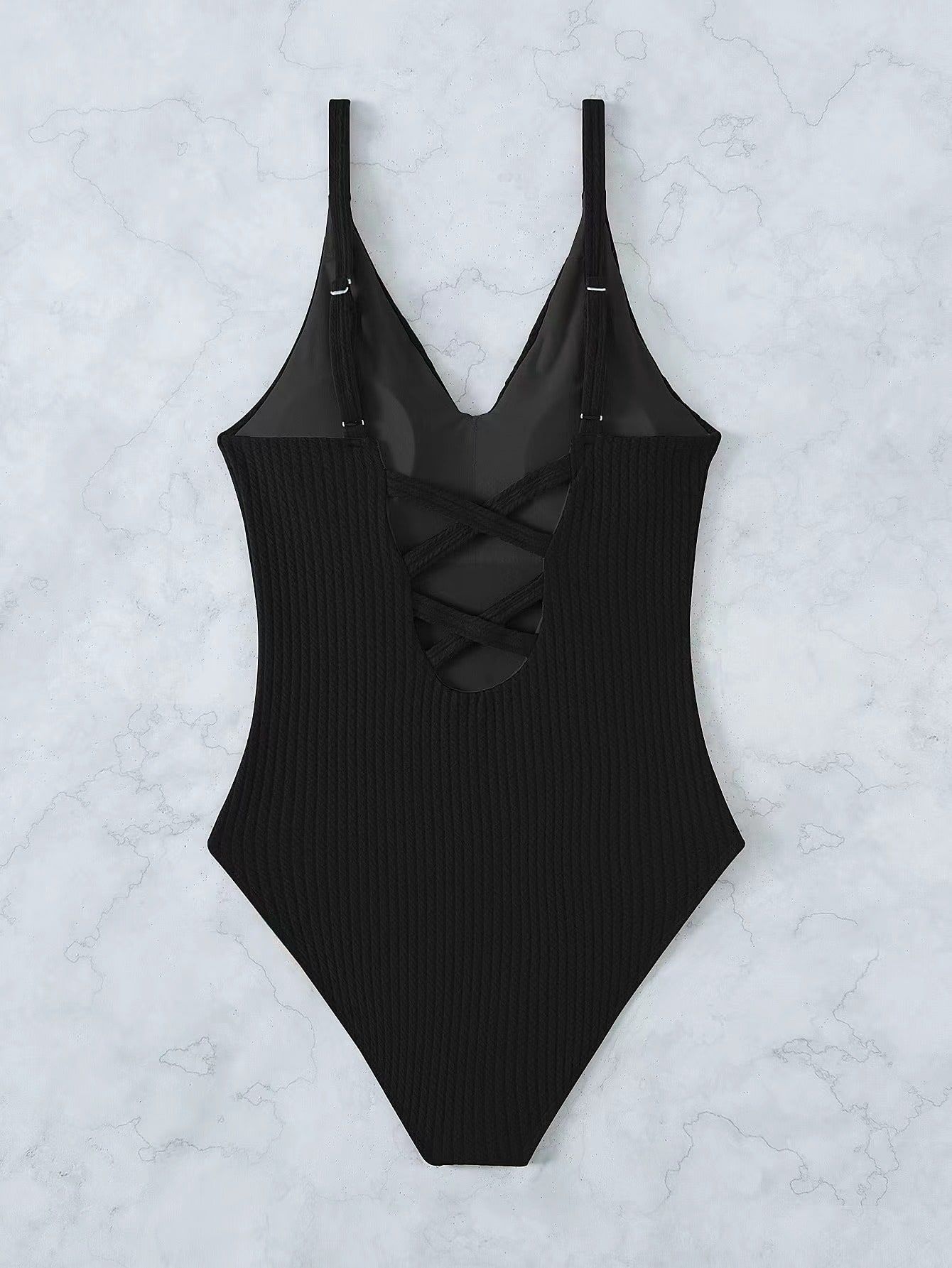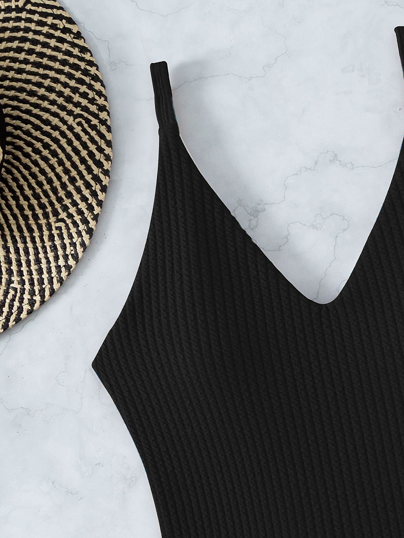 크로스보더 유럽 및 미국 스타일 여성 섹시 딥 브이 원피스 수영복, 골지 질감, 고탄력, 타이트 핏, 휴가 및 온천 수영복
