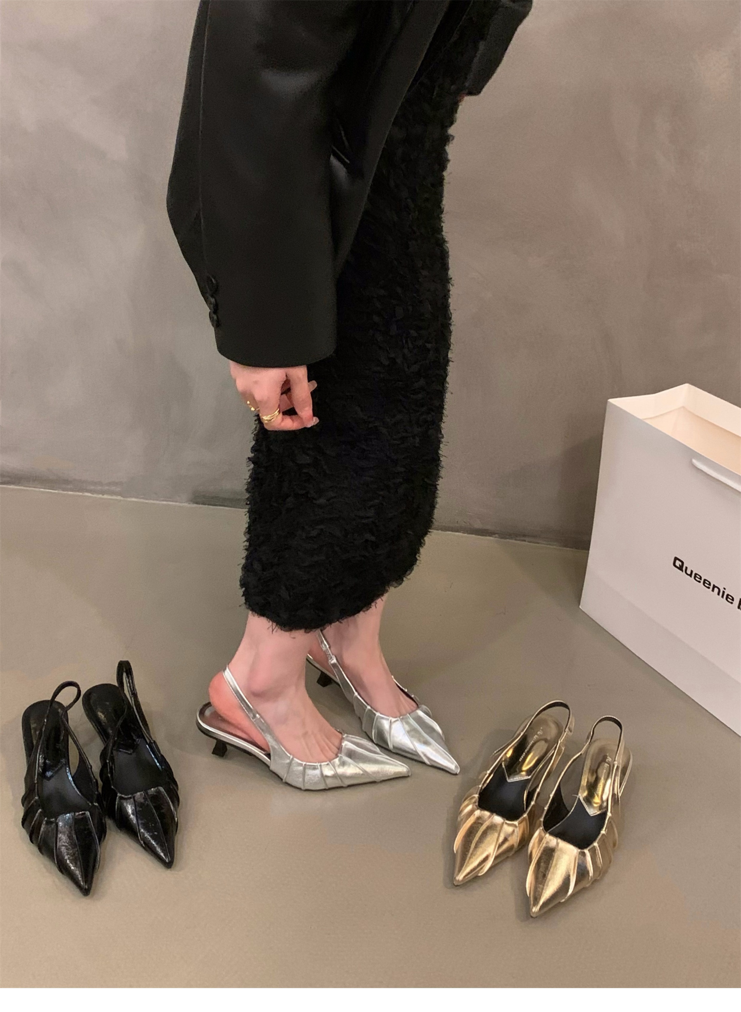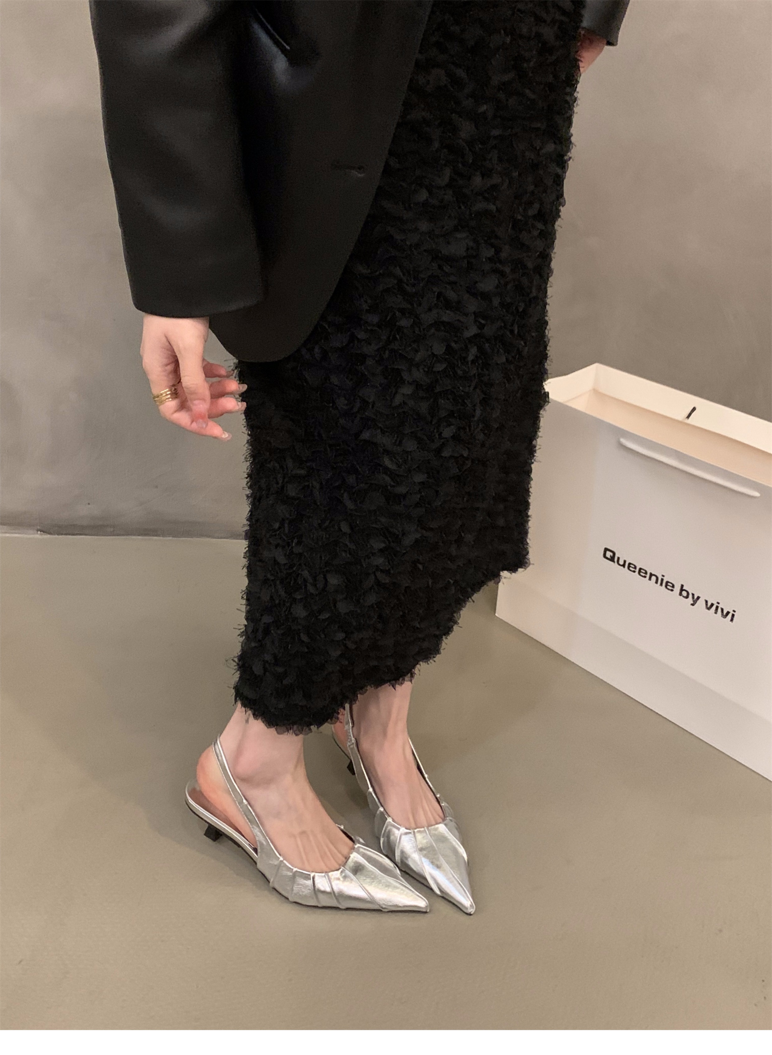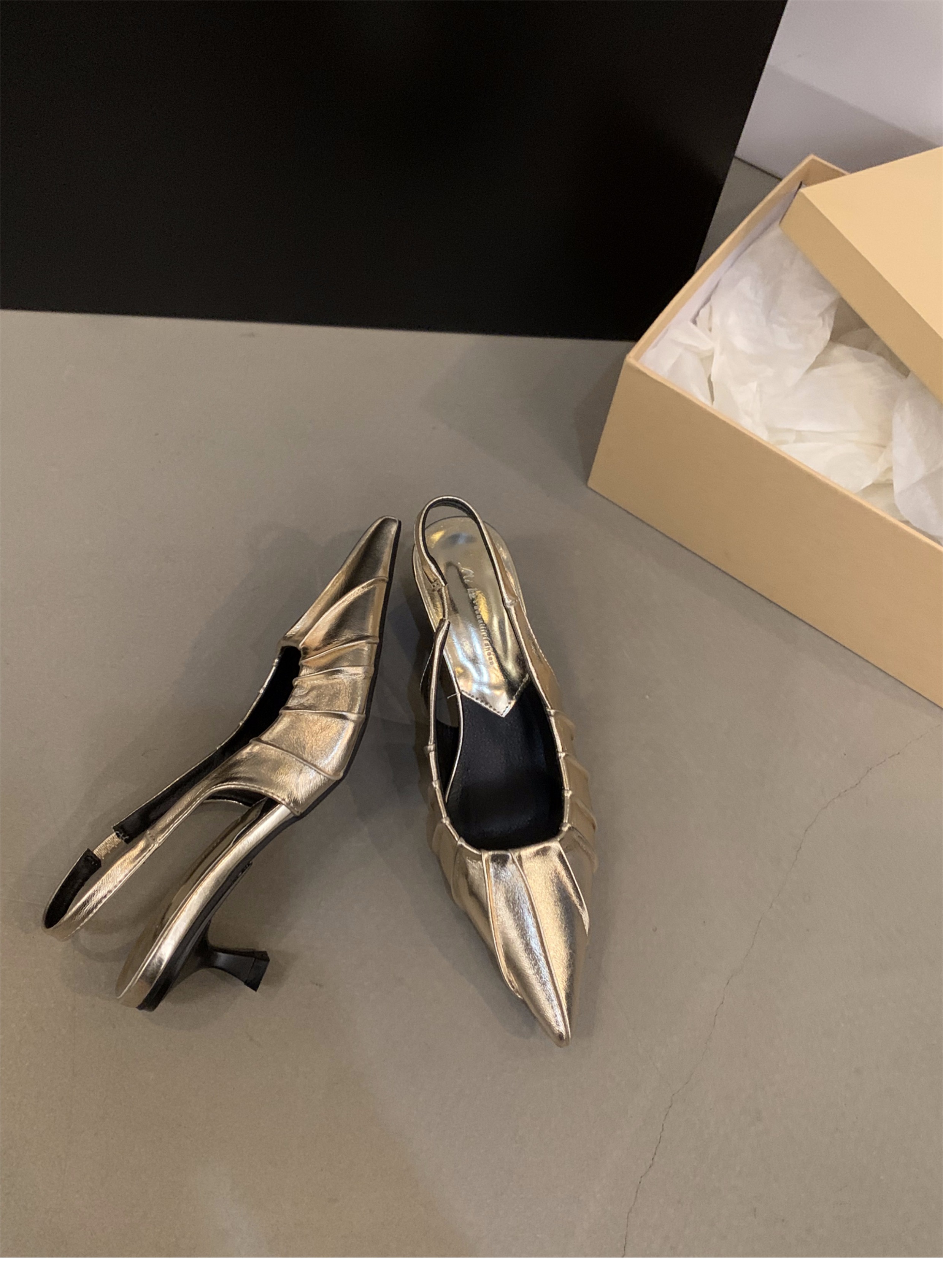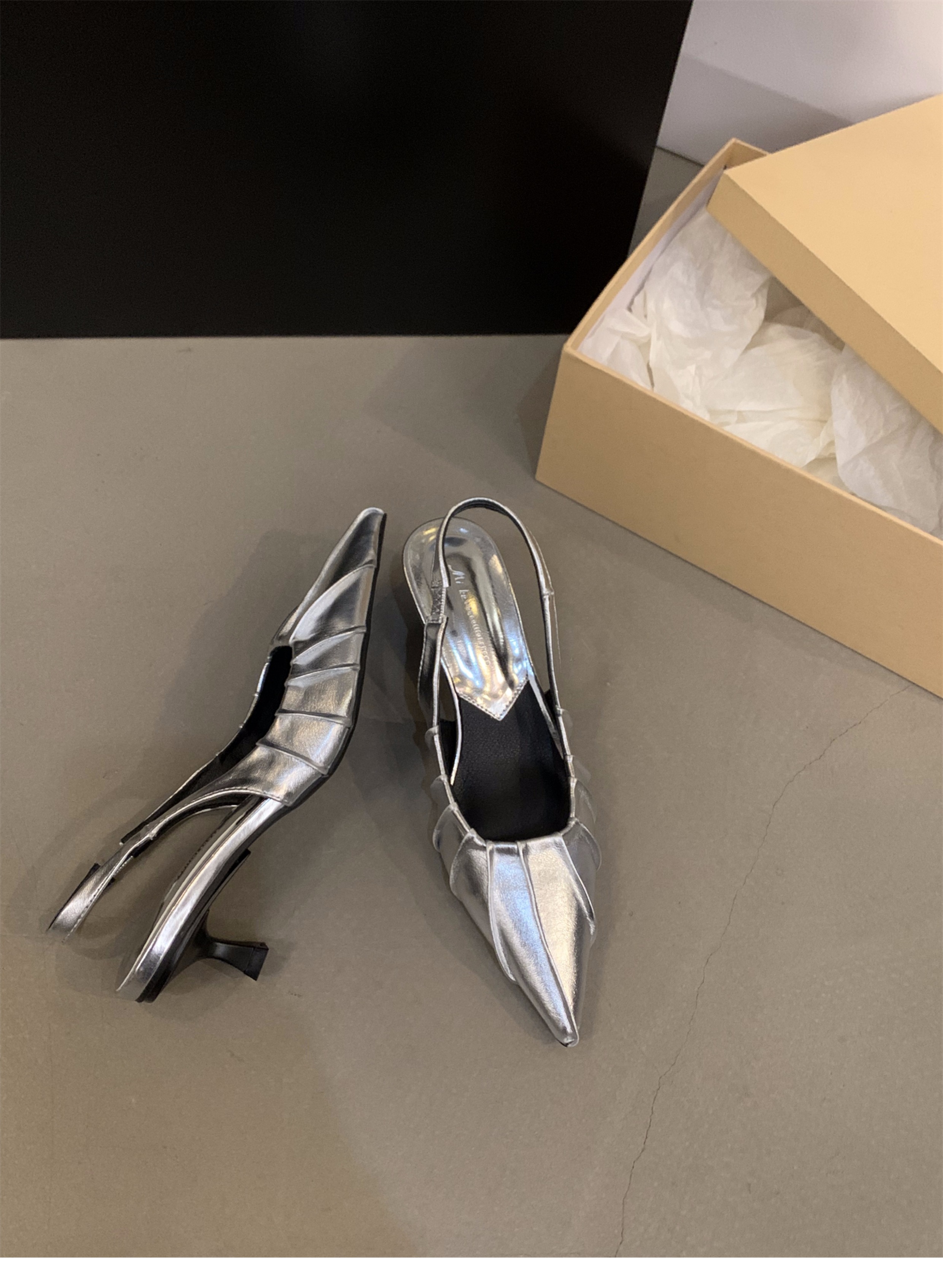 프랑스 실버 새끼 고양이 발 뒤꿈치 하이힐 샌들 여성 신발 2025 새로운 여름 우아한 치마 뾰족한 발가락 신발스토어 가기