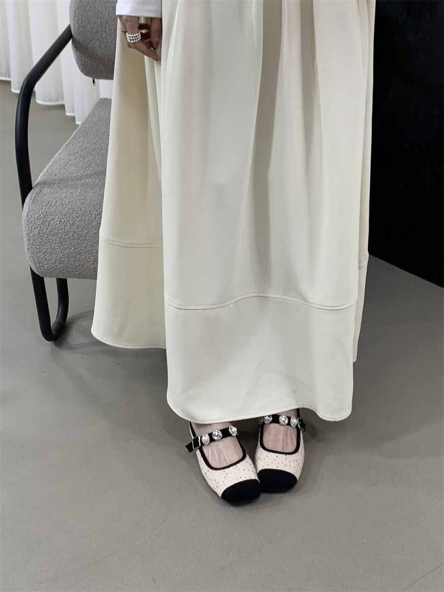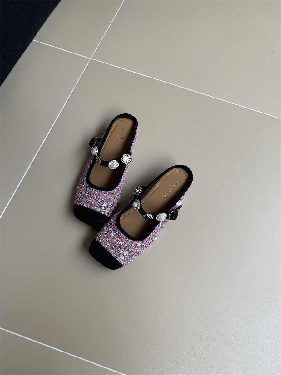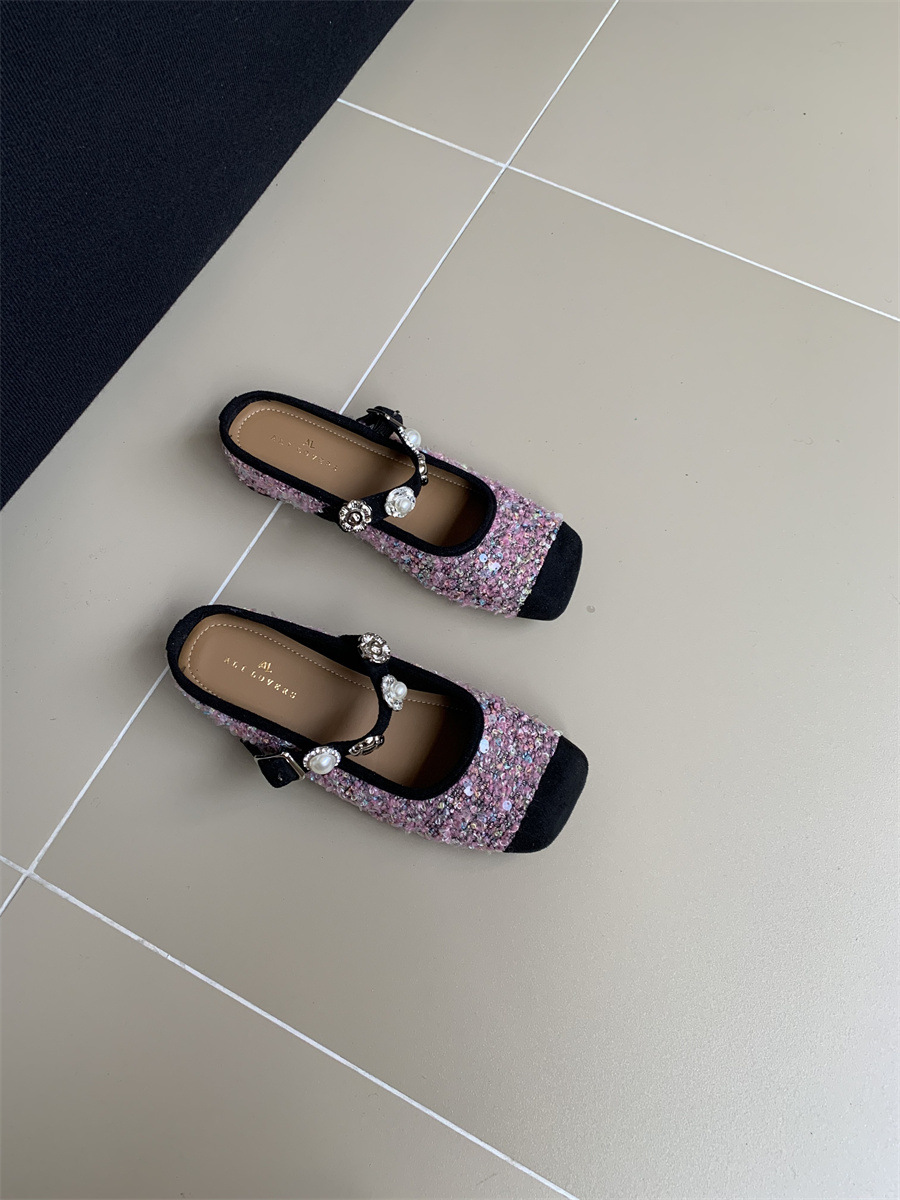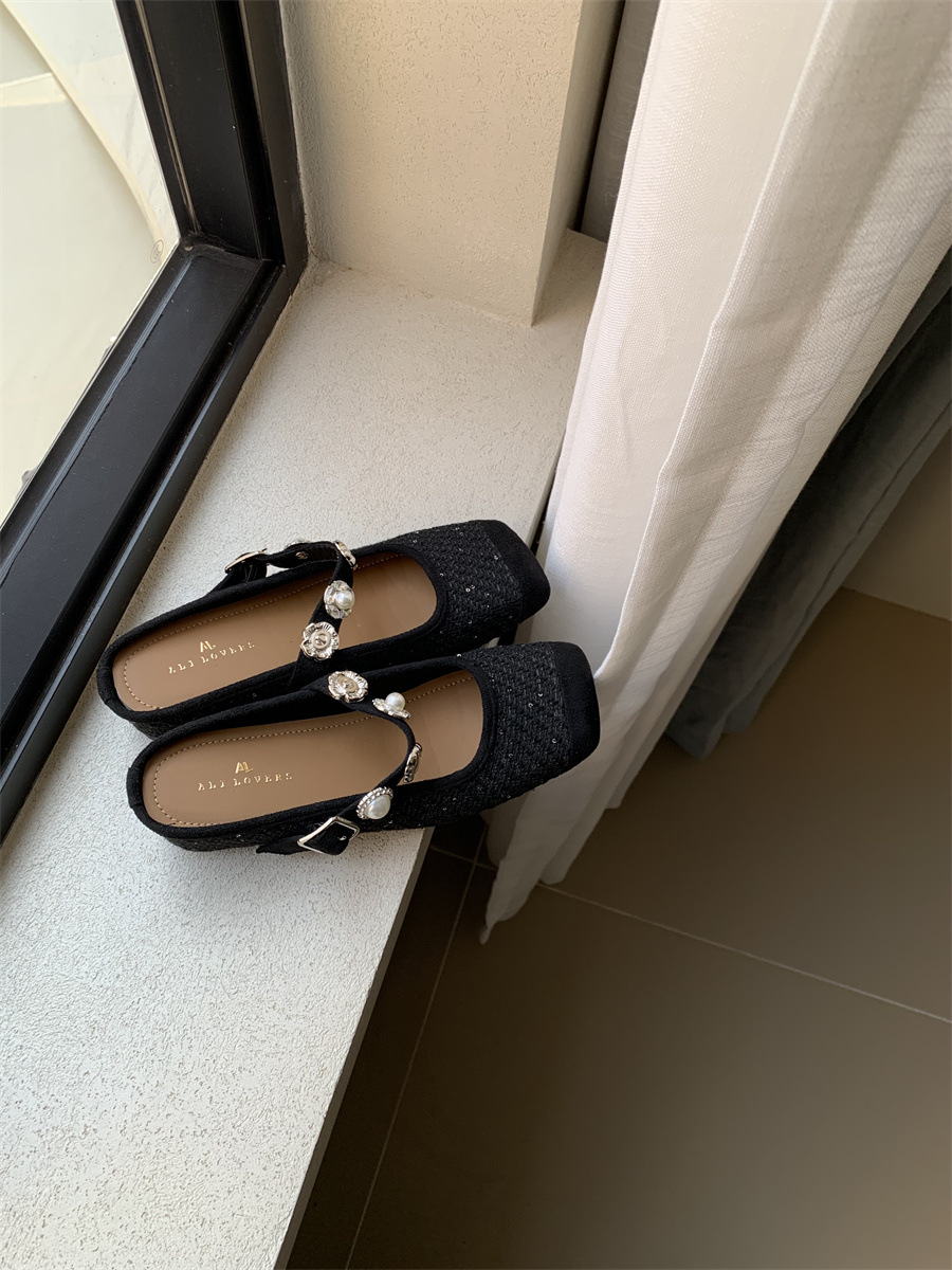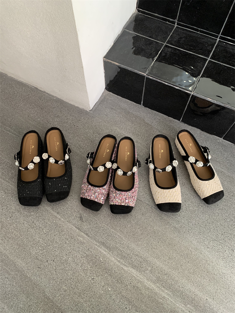 레트로 스타일 스퀘어 헤드 컬러 매칭 라인 스톤 버클 스트랩 래들 신발 여성 2025 년 봄과 가을 새로운 고층 얕은 입 신발