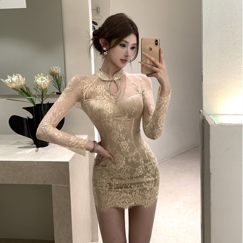 0279 새로운 중국 스타일 국가 스타일 개선 된 청삼 레이스 원피스 여성 하이 엔드 센스 섹시한 슬림 핏 슬림 쉬스 스커트스토어 가기