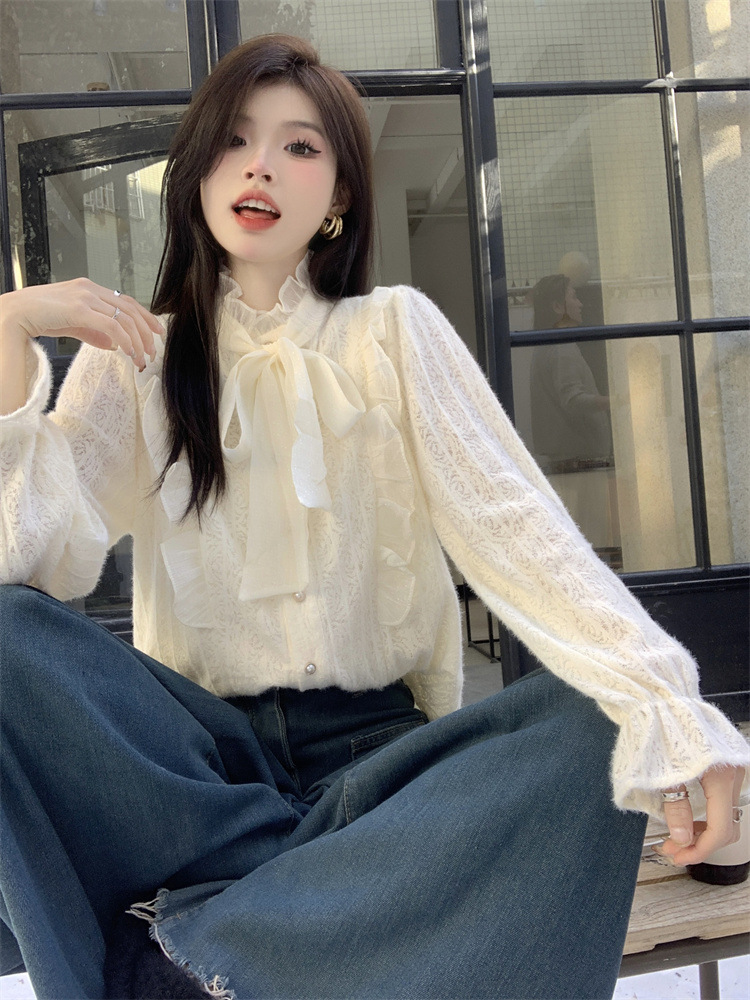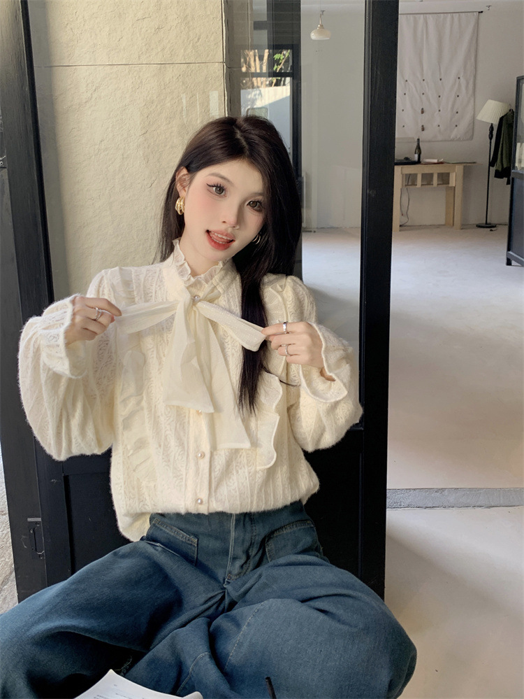 여성의 봄과 가을 디자인 틈새 기모 나비 넥타이업과 우드 이어 레이스 셔츠와 두꺼운 기본 셔츠