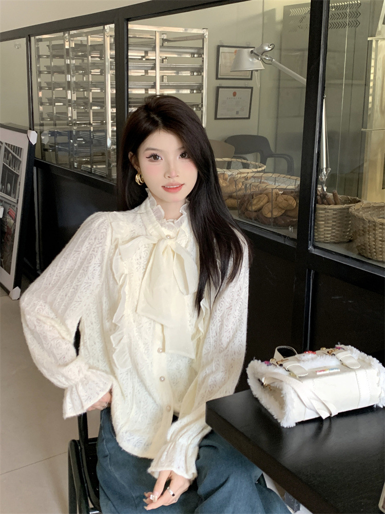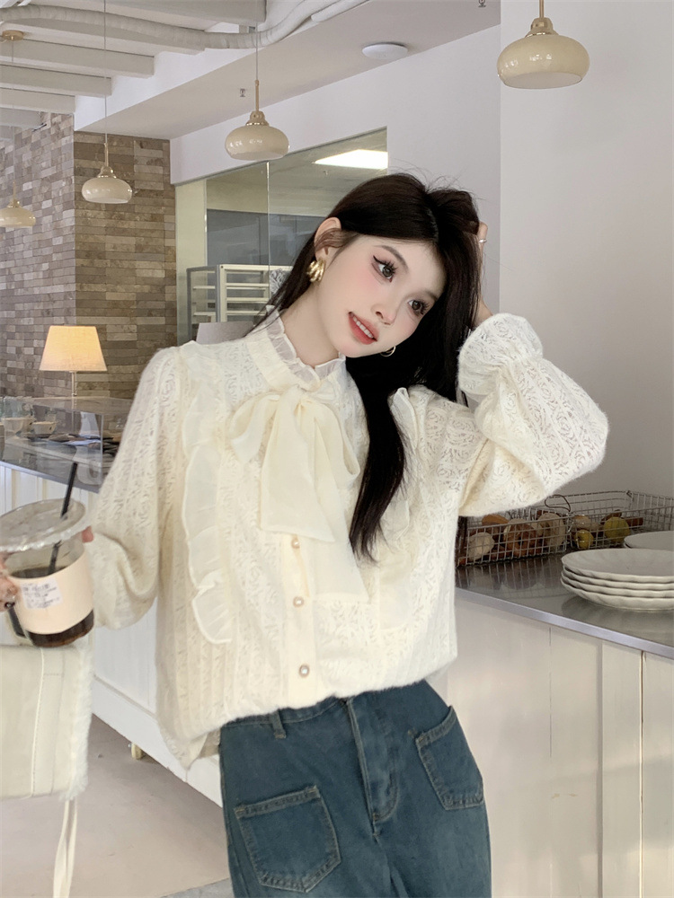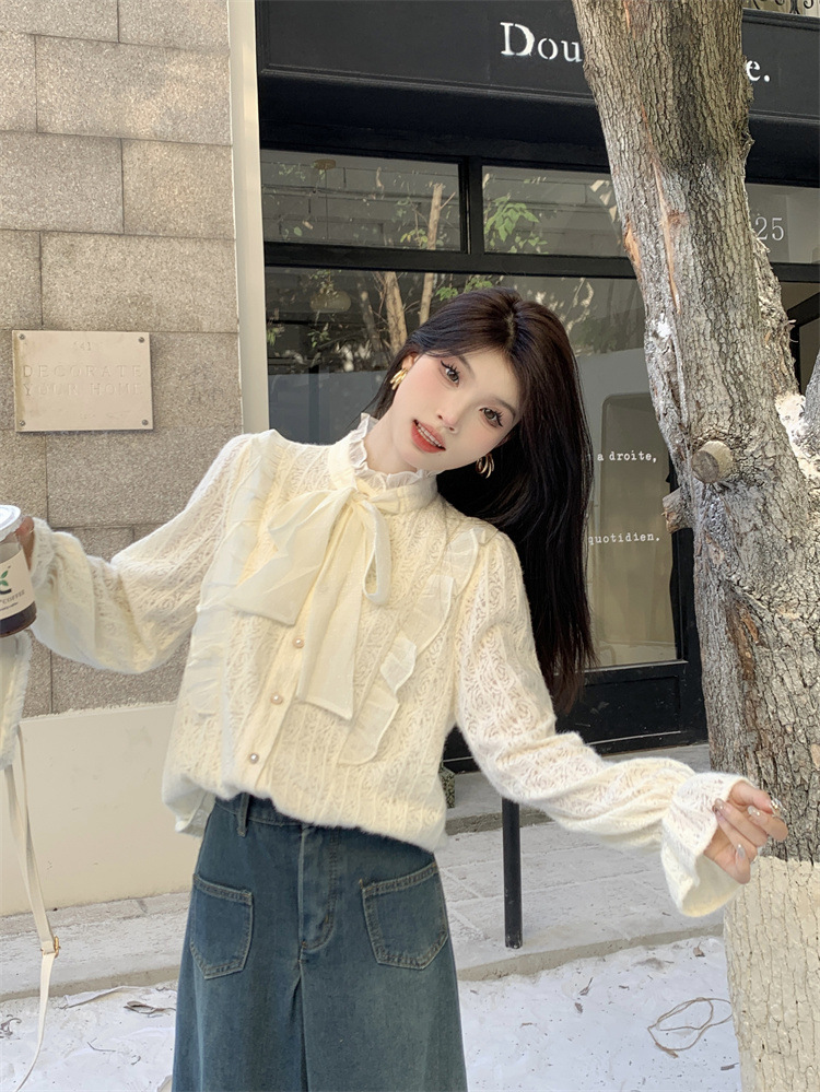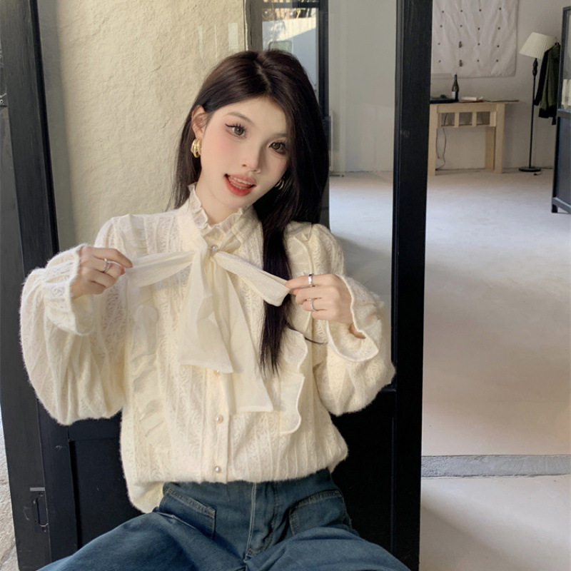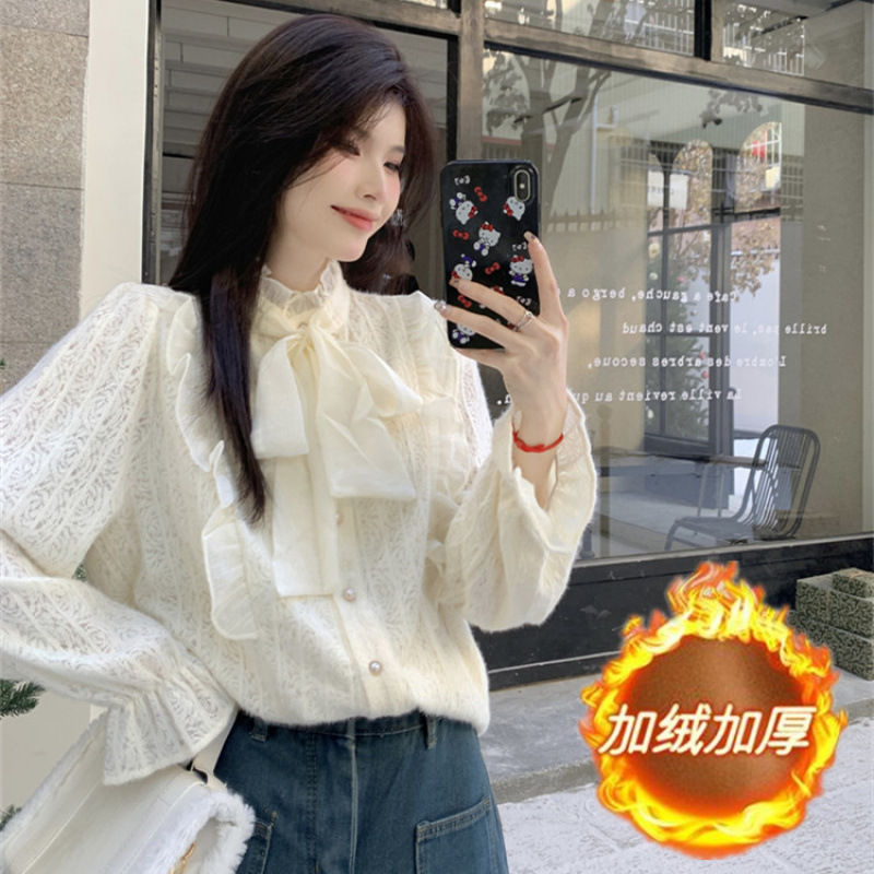 여성의 봄과 가을 디자인 틈새 기모 나비 넥타이업과 우드 이어 레이스 셔츠와 두꺼운 기본 셔츠스토어 가기