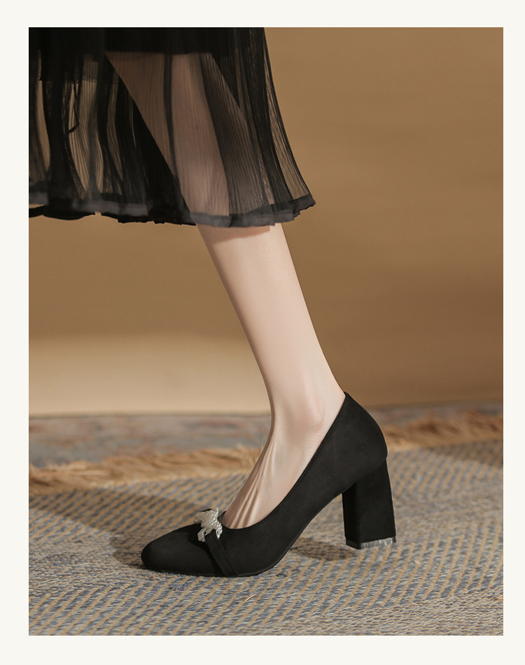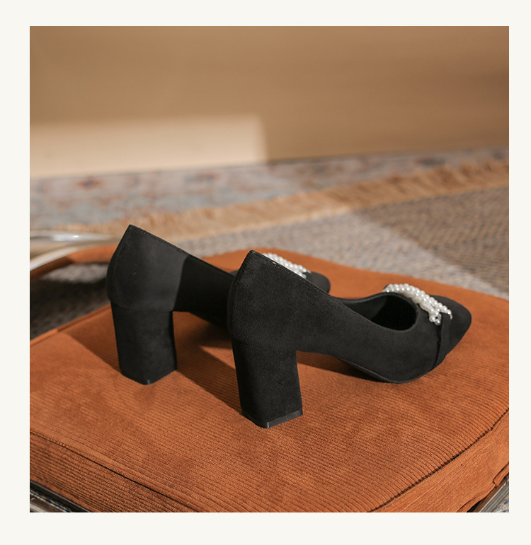 하이힐 신발 여성의 2025 새로운 스퀘어 헤드 두꺼운 뒤꿈치 플러스 사이즈 여성용 단층 신발이 살찌고 통근 신발 진주 여성 신발스토어 가기