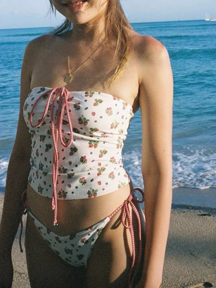 만화 딸기 귀여운 소녀의 끈없는 주름 빈티지 간단한 작은 가슴 분할 순수 분할 수영복 여성 수영복