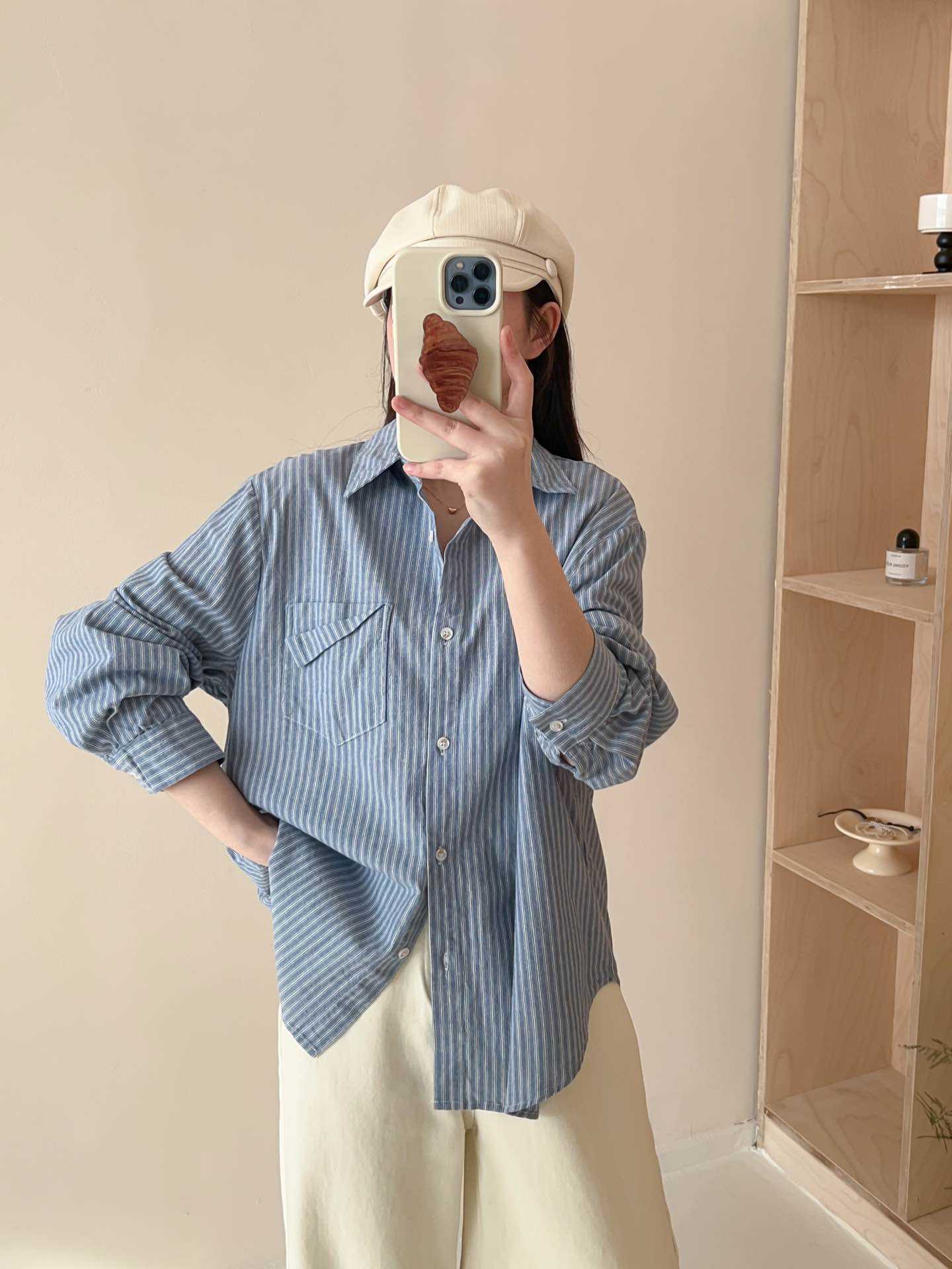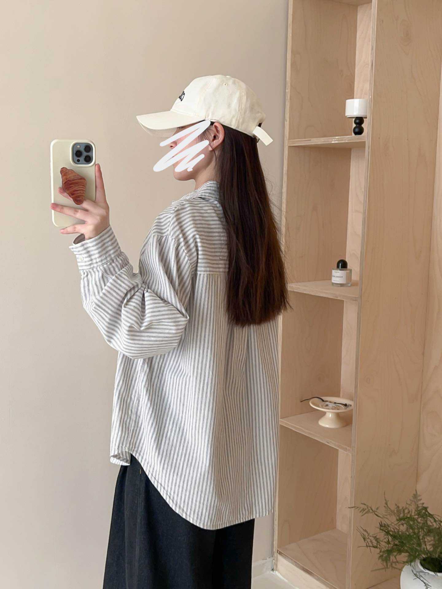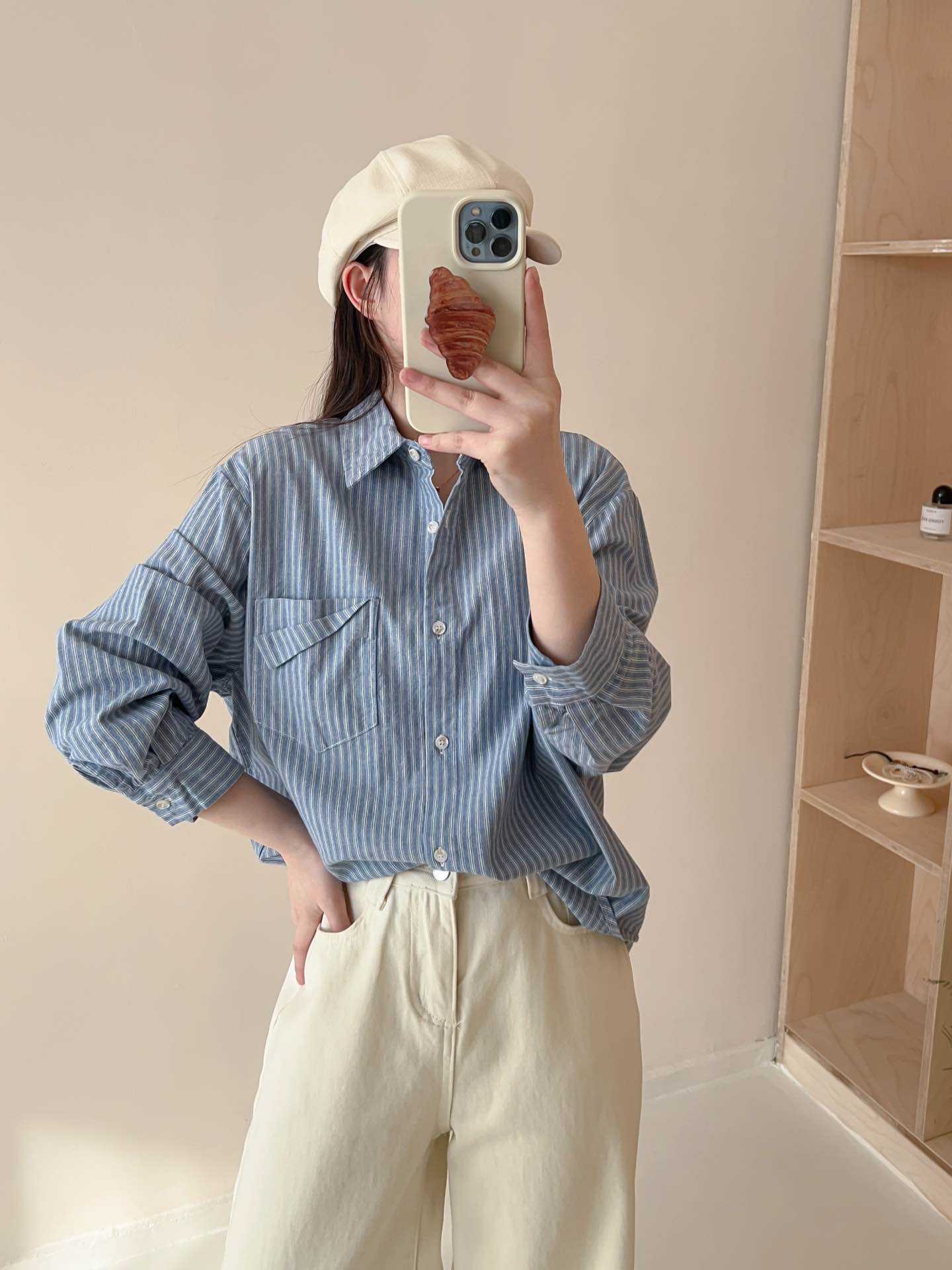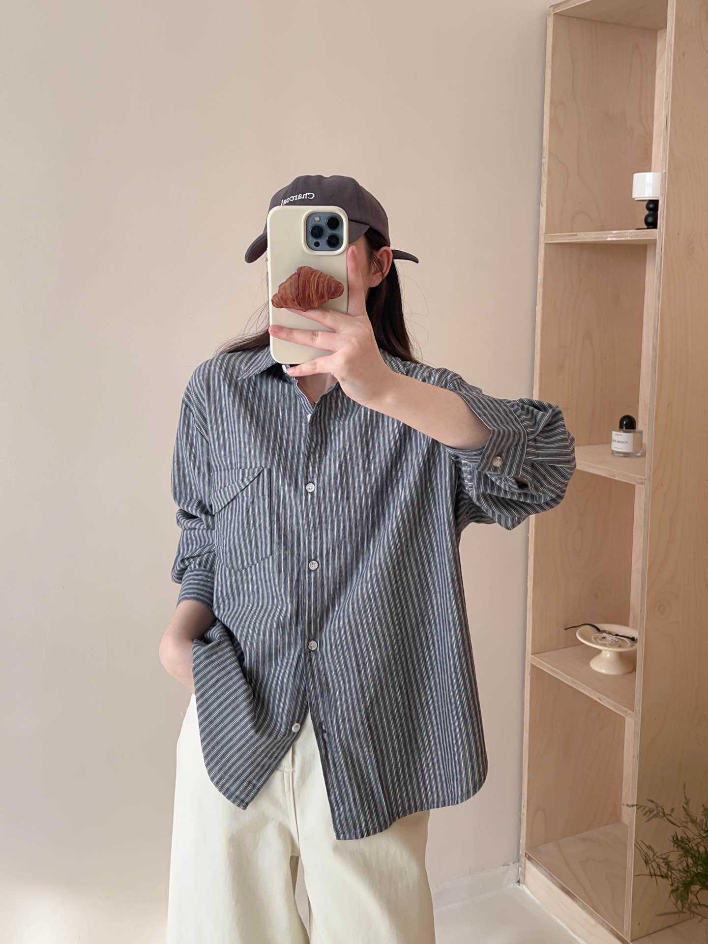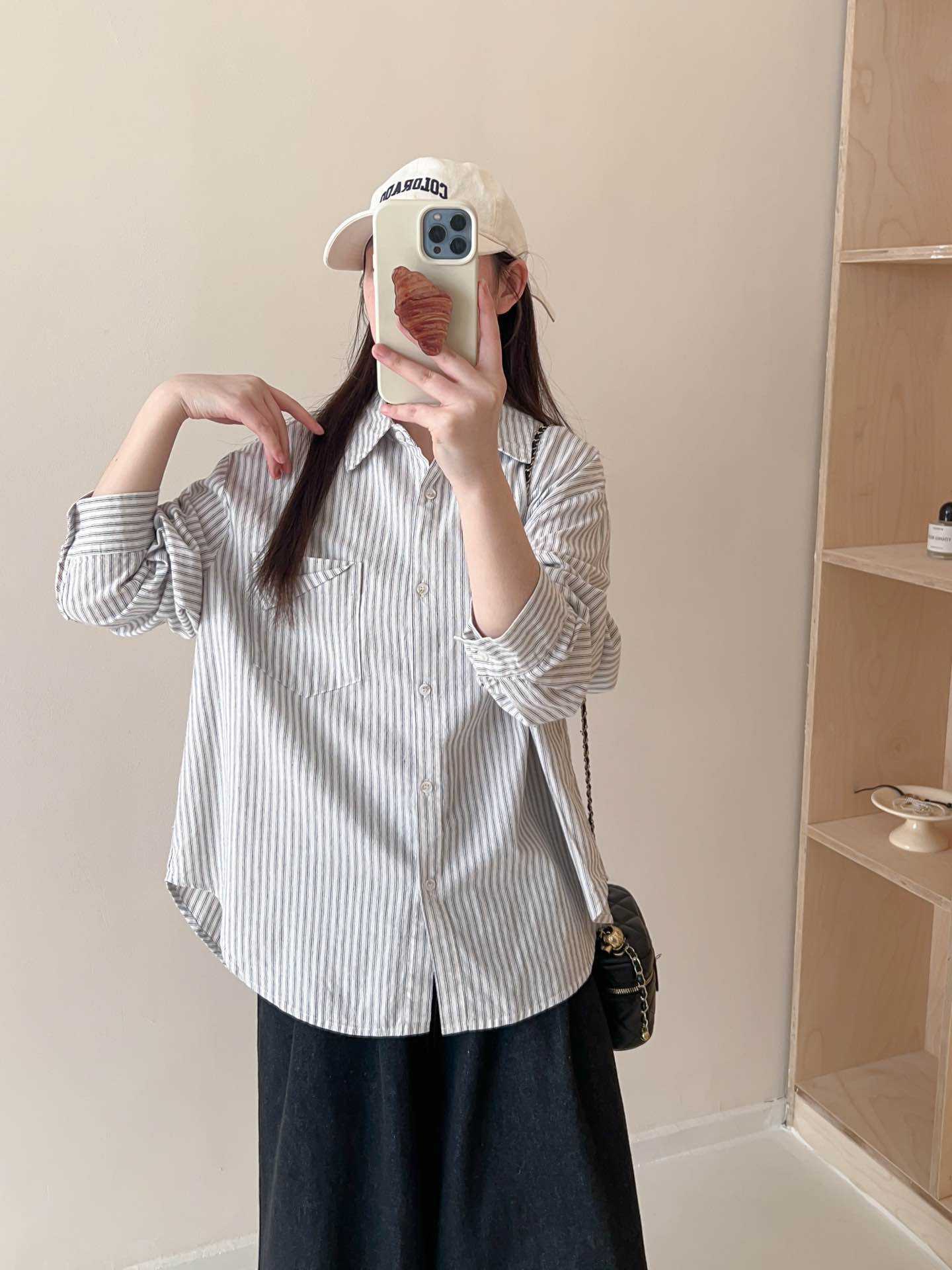 긴 소매 셔츠 2025 봄 새로운 한국 스타일 줄무늬 셔츠 여성 틈새 디자인 센스 포켓 탑스토어 가기