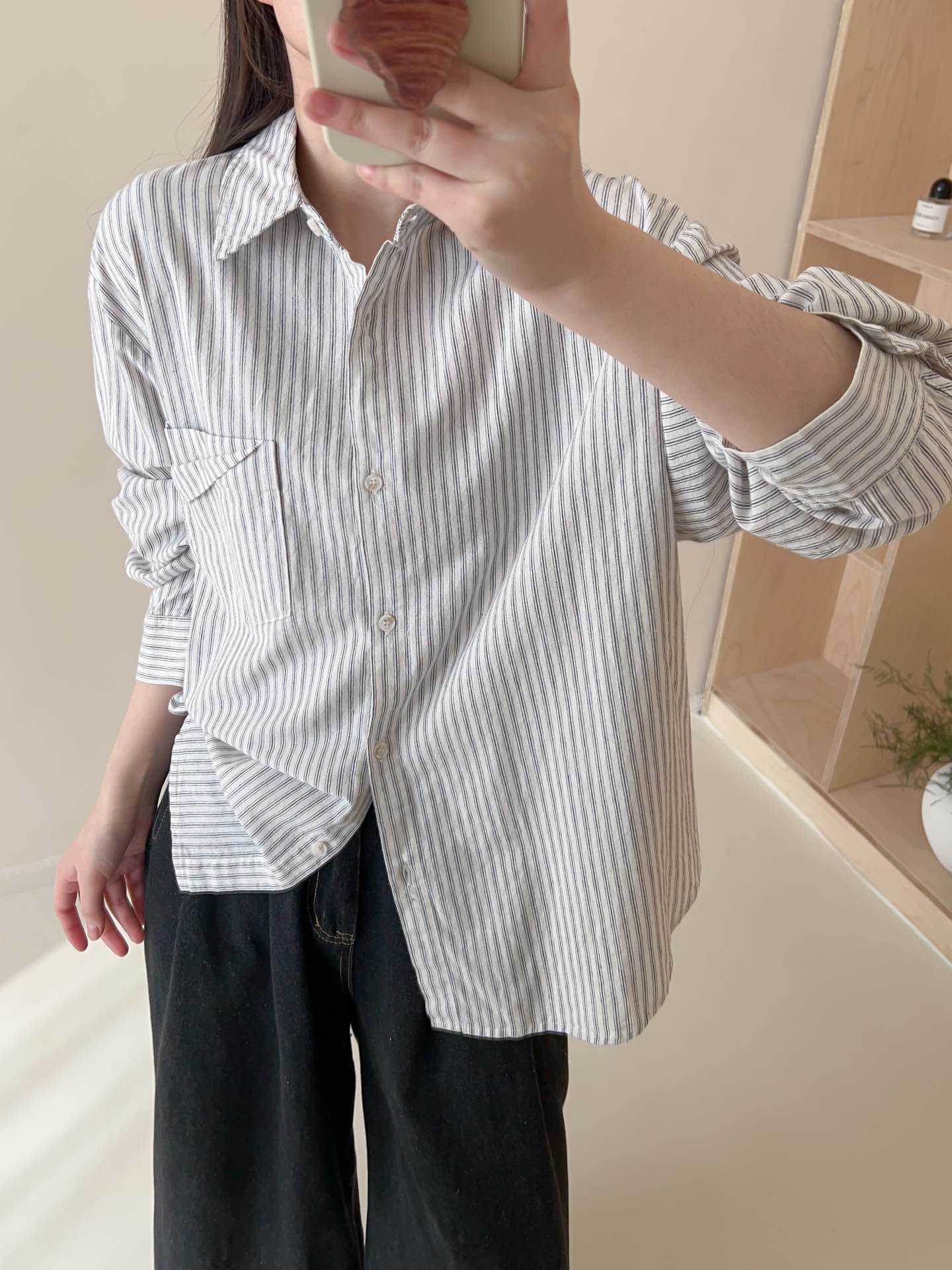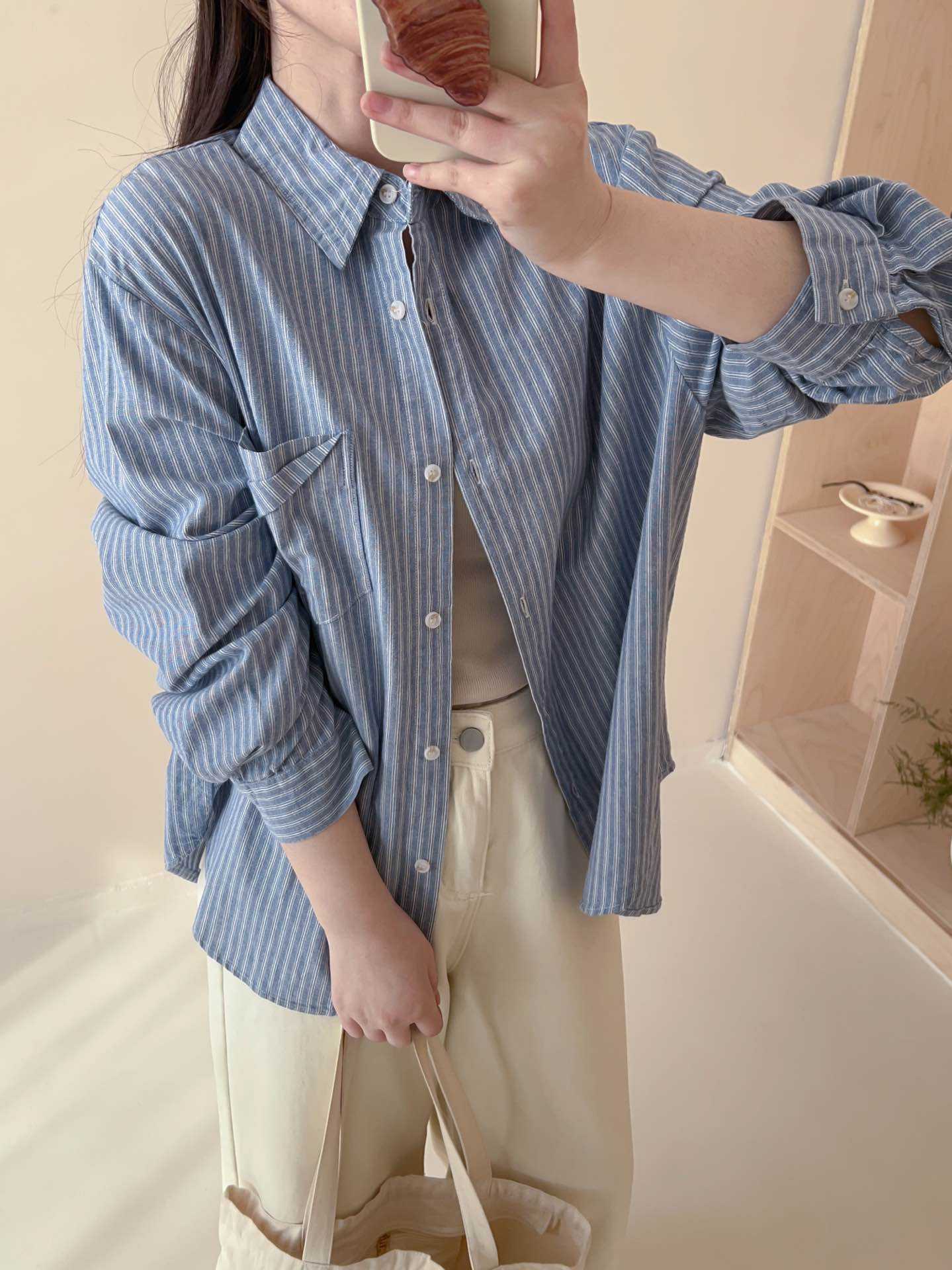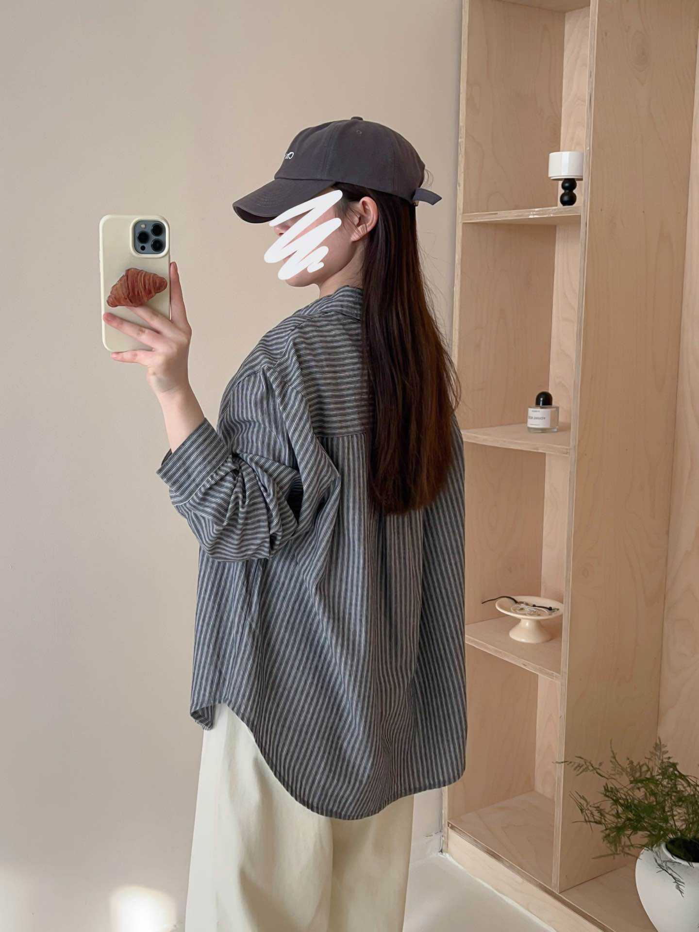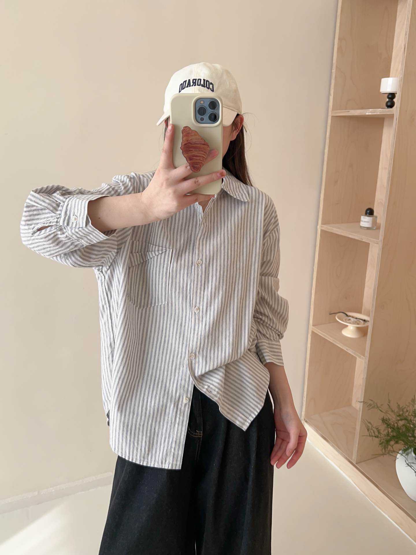 긴 소매 셔츠 2025 봄 새로운 한국 스타일 줄무늬 셔츠 여성 틈새 디자인 센스 포켓 탑스토어 가기