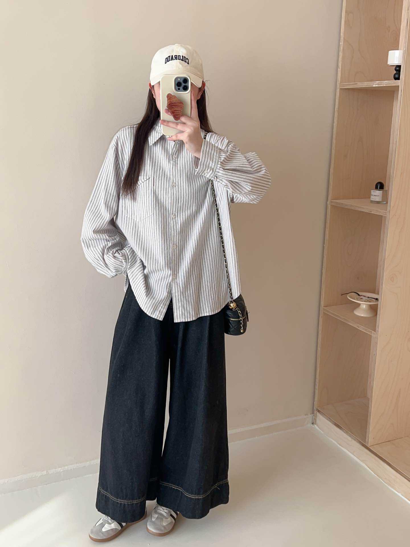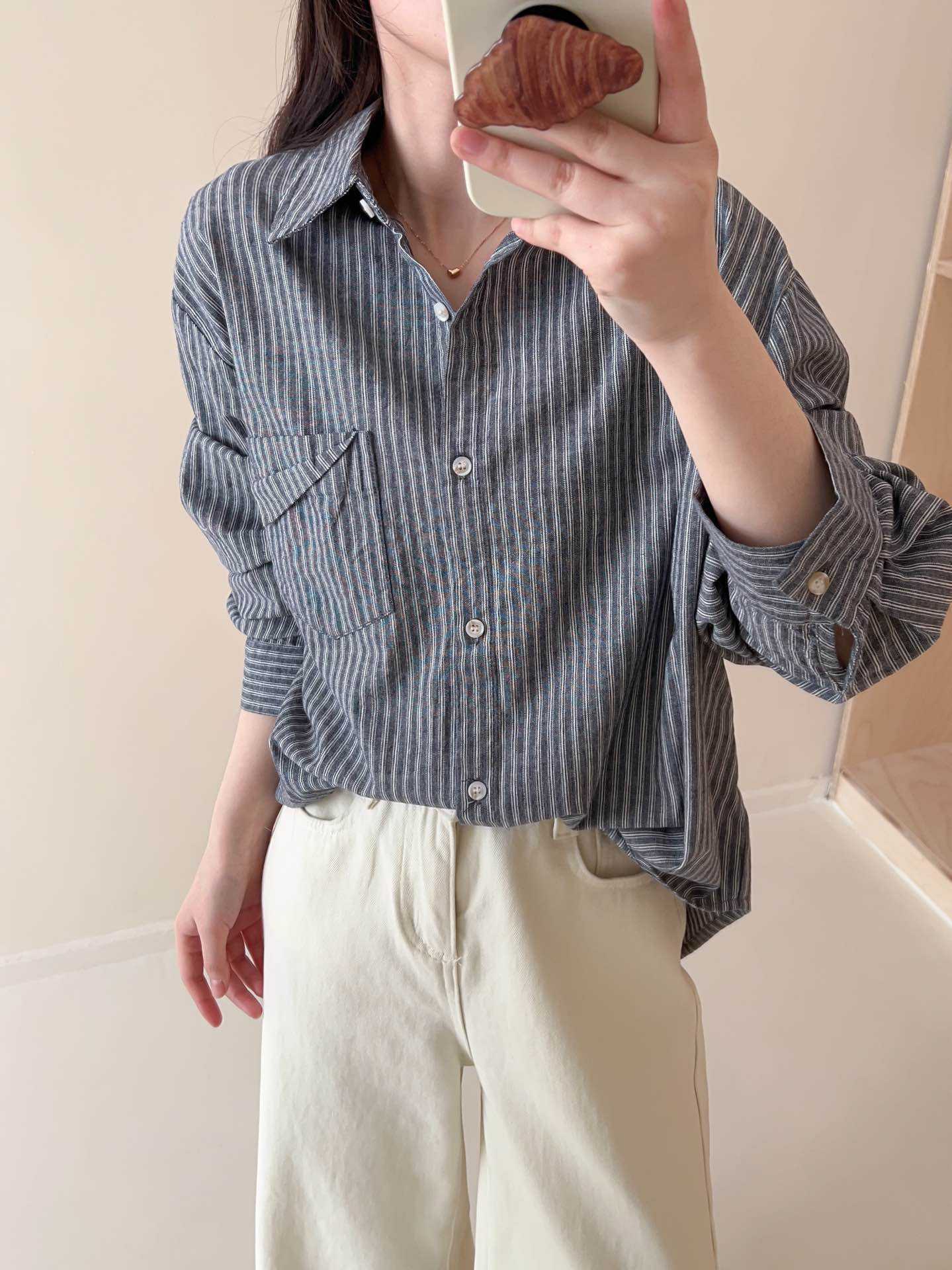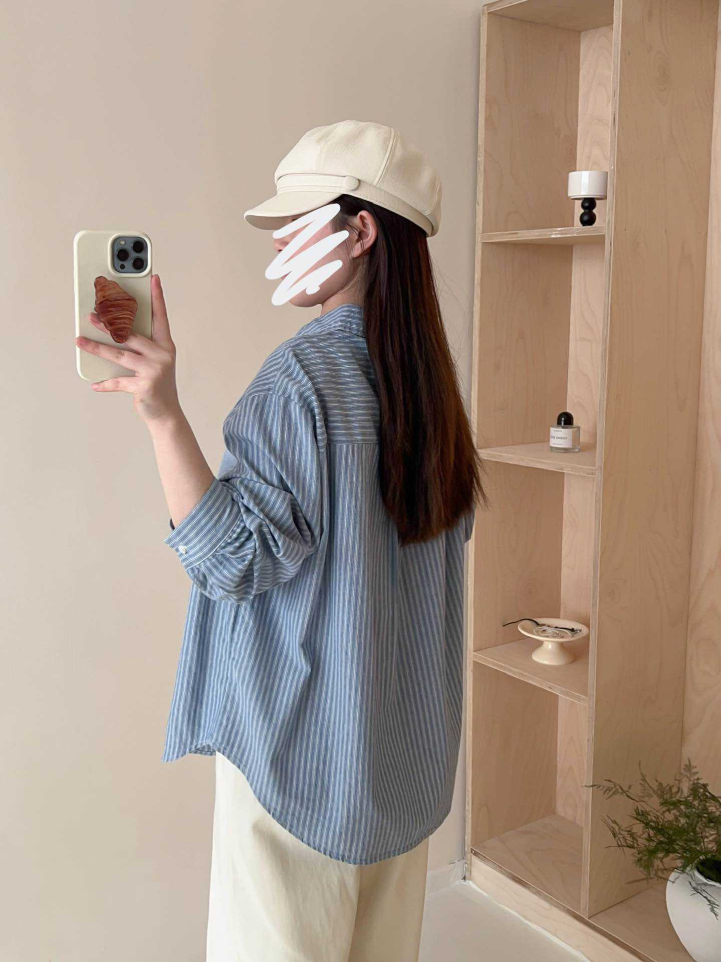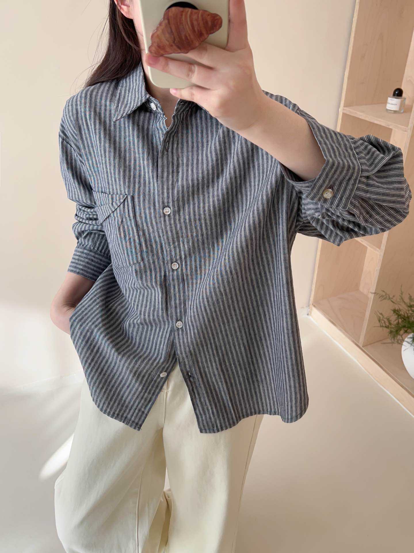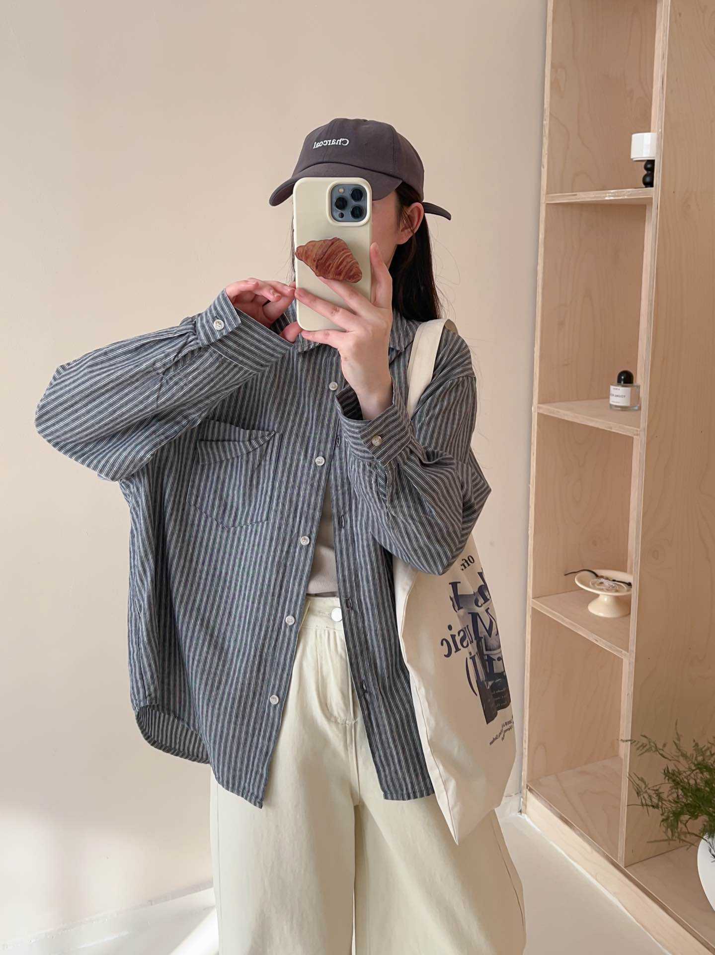 긴 소매 셔츠 2025 봄 새로운 한국 스타일 줄무늬 셔츠 여성 틈새 디자인 센스 포켓 탑스토어 가기