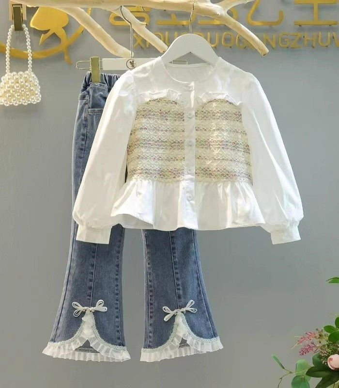 여자 가을 세트 2025 한국 스타일 스플라이스 페이크 투피스 러플 셔츠 유행 올매치 청바지