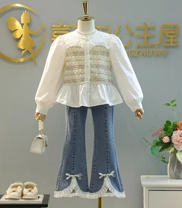여자 가을 세트 2025 한국 스타일 스플라이스 페이크 투피스 러플 셔츠 유행 올매치 청바지스토어 가기