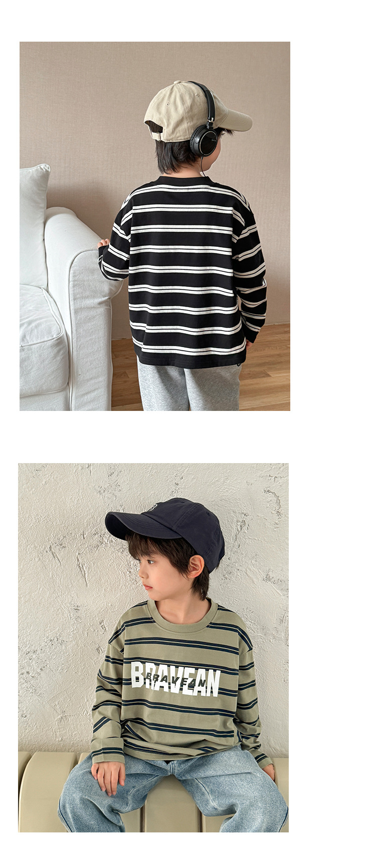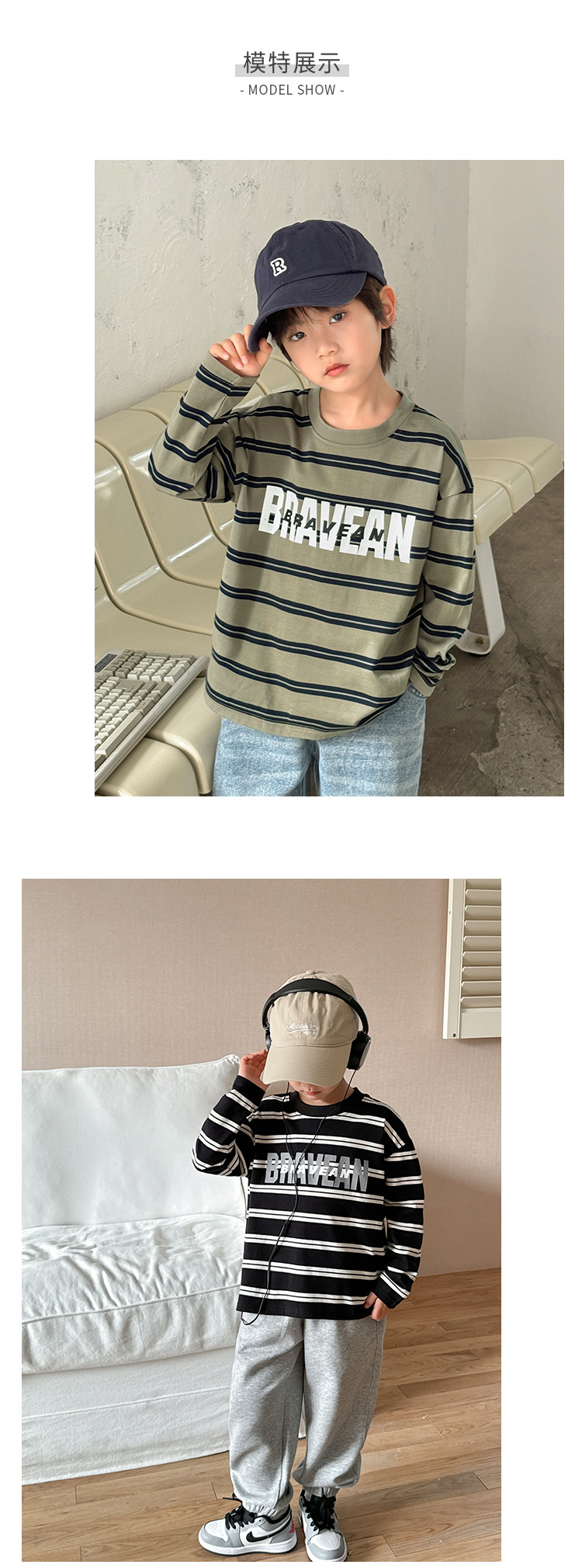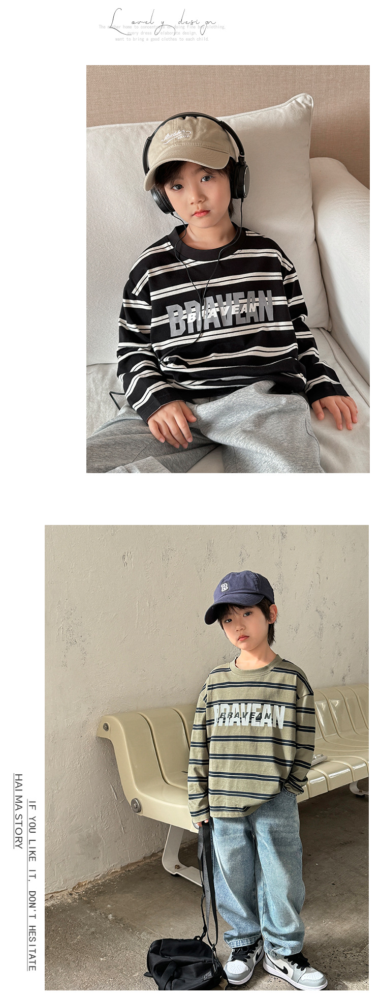 Haima 소년 2025 가을 새로운 긴팔 스트라이프 코튼 티셔츠 옷 아동 한국 스타일 아동 의류 가을 의류 트렌드스토어 가기
