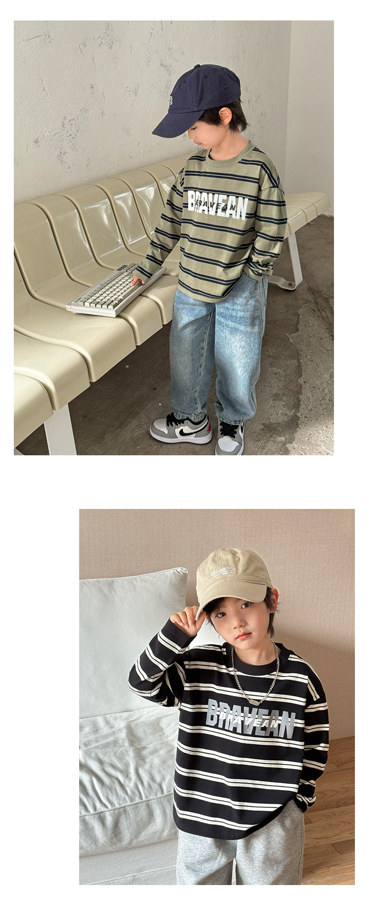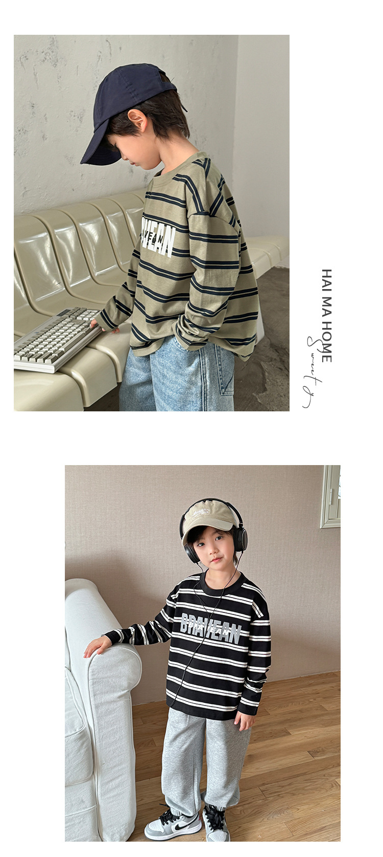 Haima 소년 2025 가을 새로운 긴팔 스트라이프 코튼 티셔츠 옷 아동 한국 스타일 아동 의류 가을 의류 트렌드