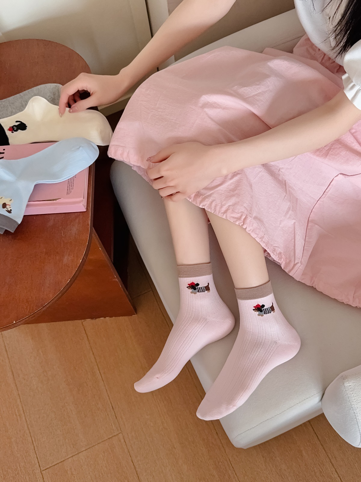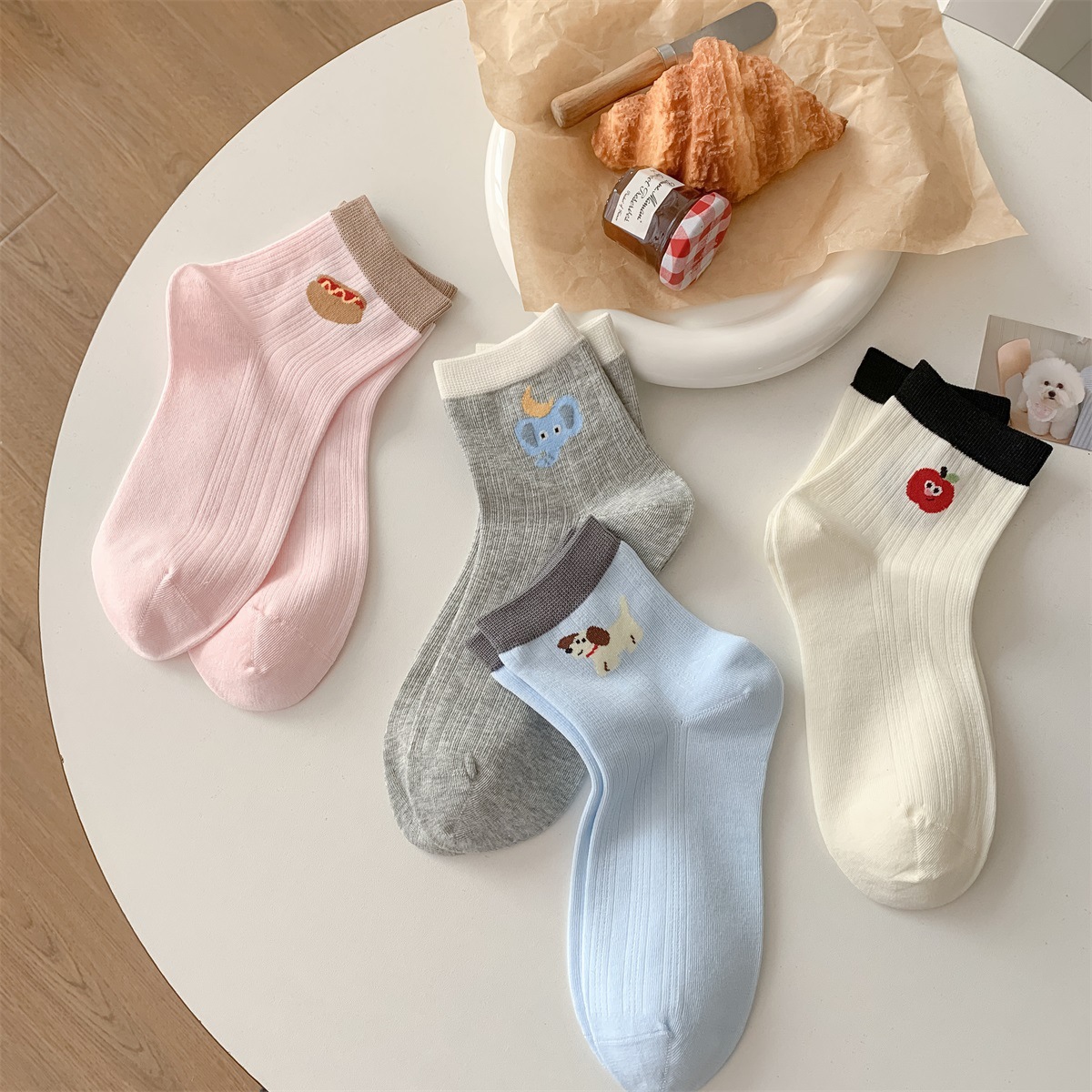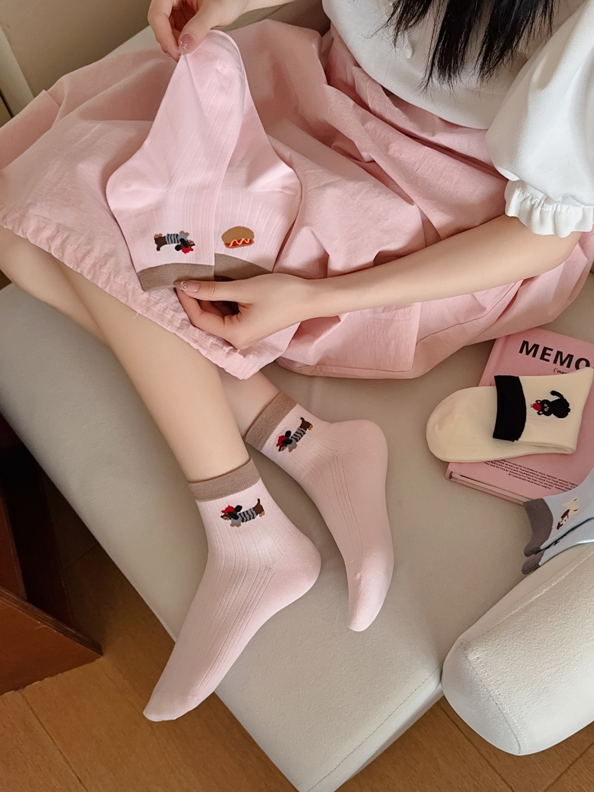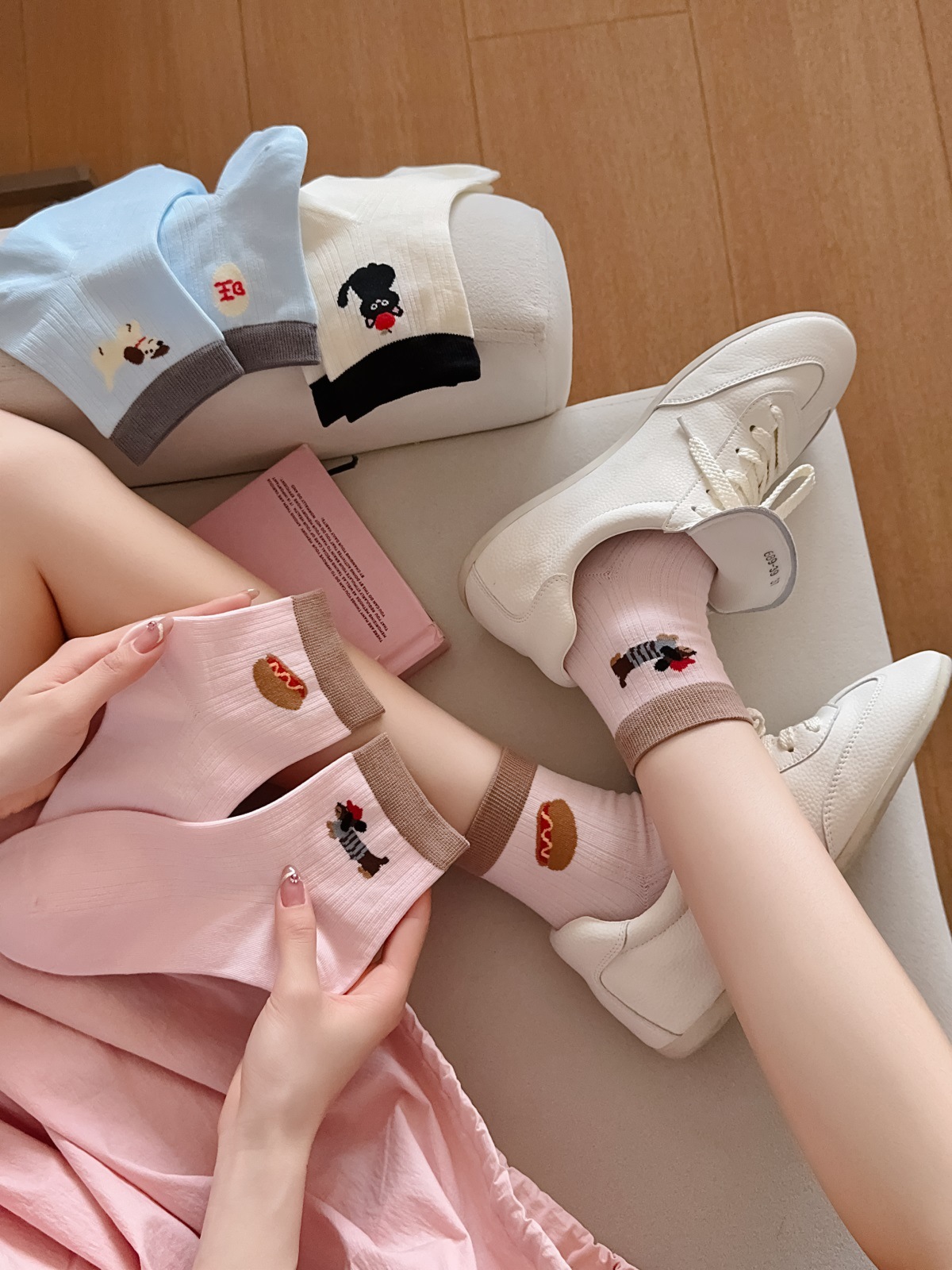 25 봄과 여름 얇은 AB 만화 강아지 짧은 튜브 낮은 양말 여성의면 양말 뼈없는 컬러 매칭 닥스 훈트 개 양말 한국어 버전