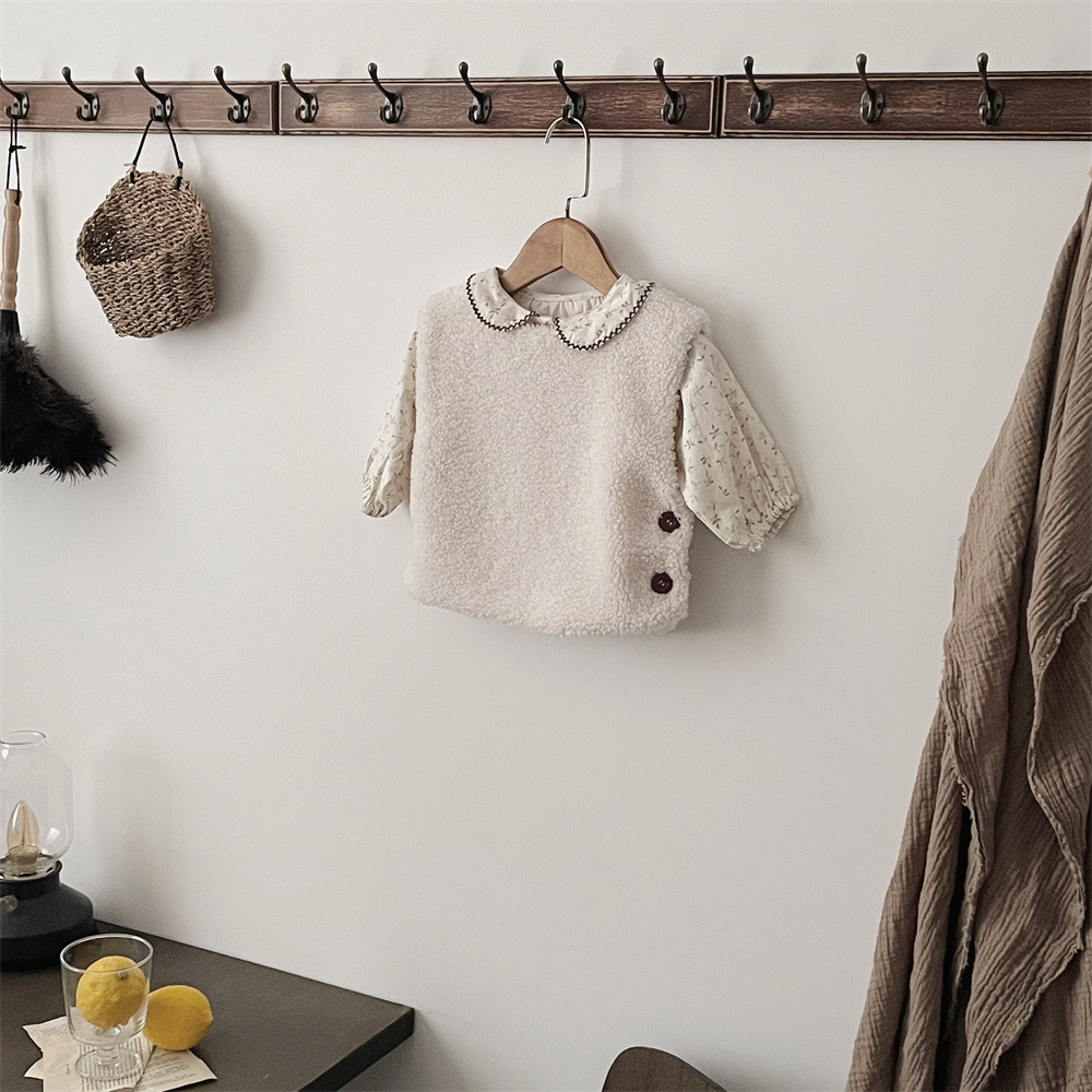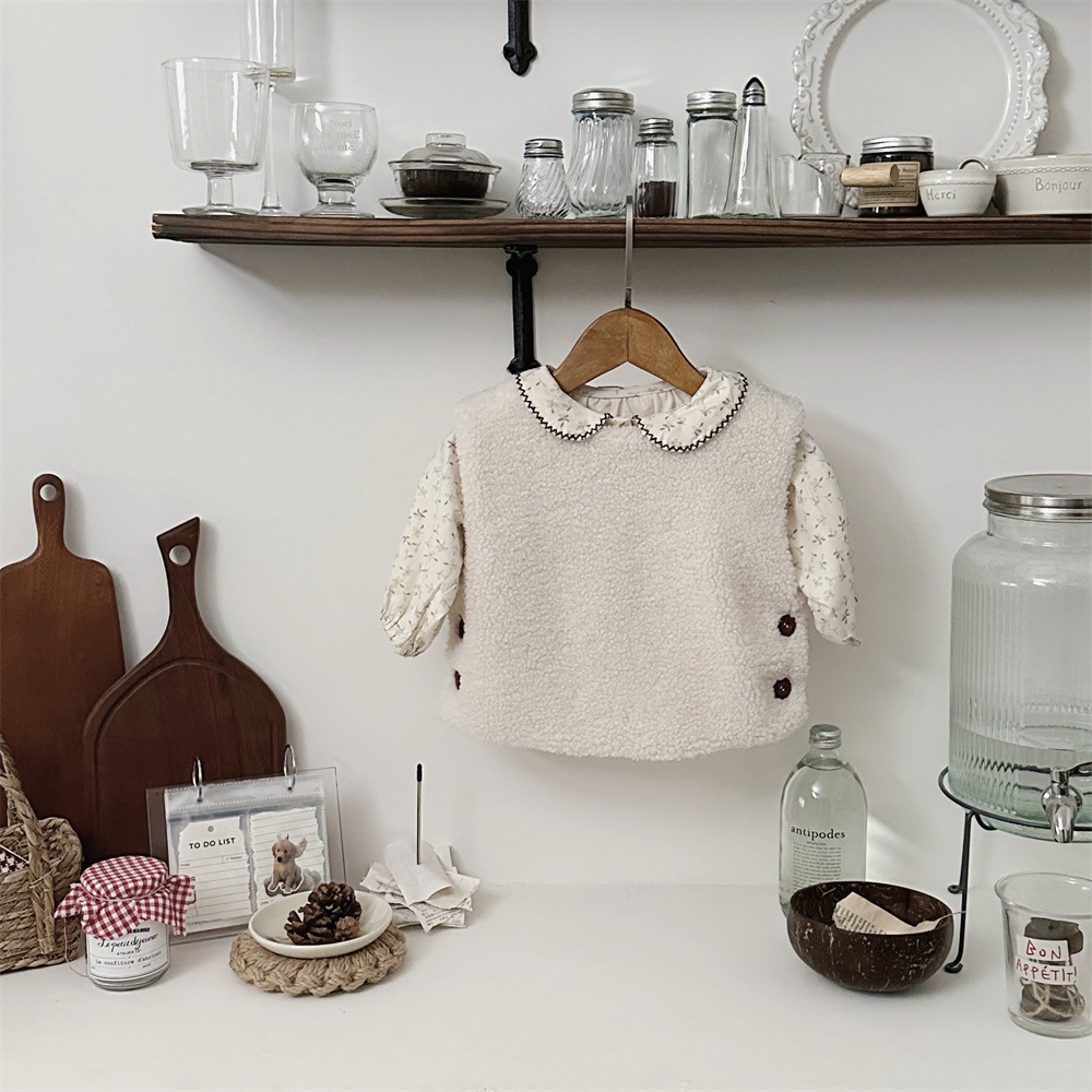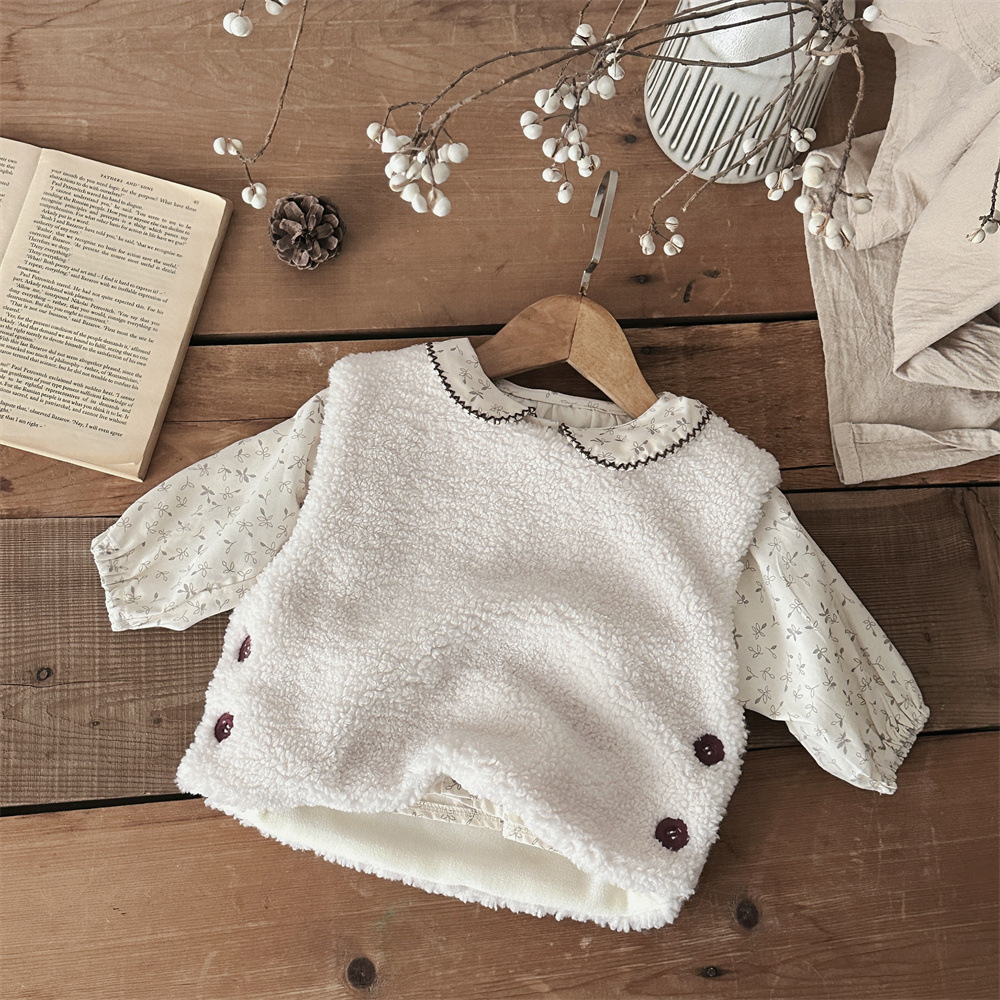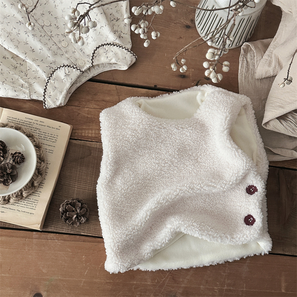 • 빨간색 단추가 달린 베이지색 양털 풀오버 민소매 조끼 - 더블 레이어 플러스 벨벳