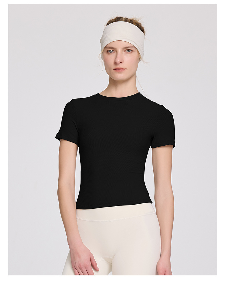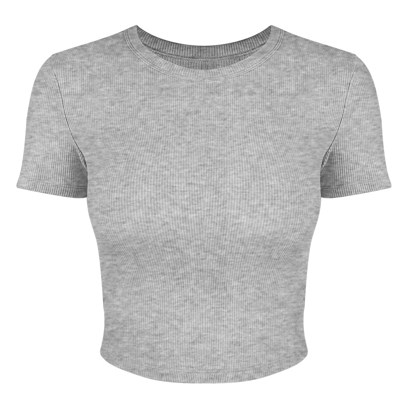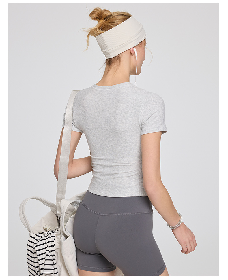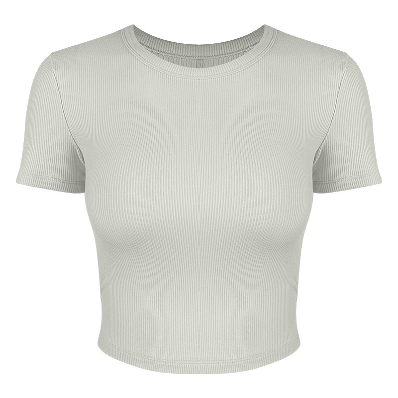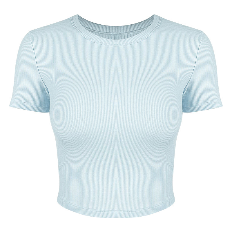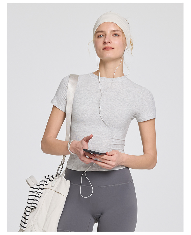 봄 여름 신상 여성용 요가복, 골지 스포츠 티셔츠, 섹시 슬림핏 라운드넥, 유럽풍 단색 상의, 피트니스복스토어 가기