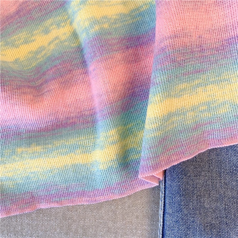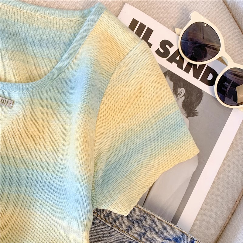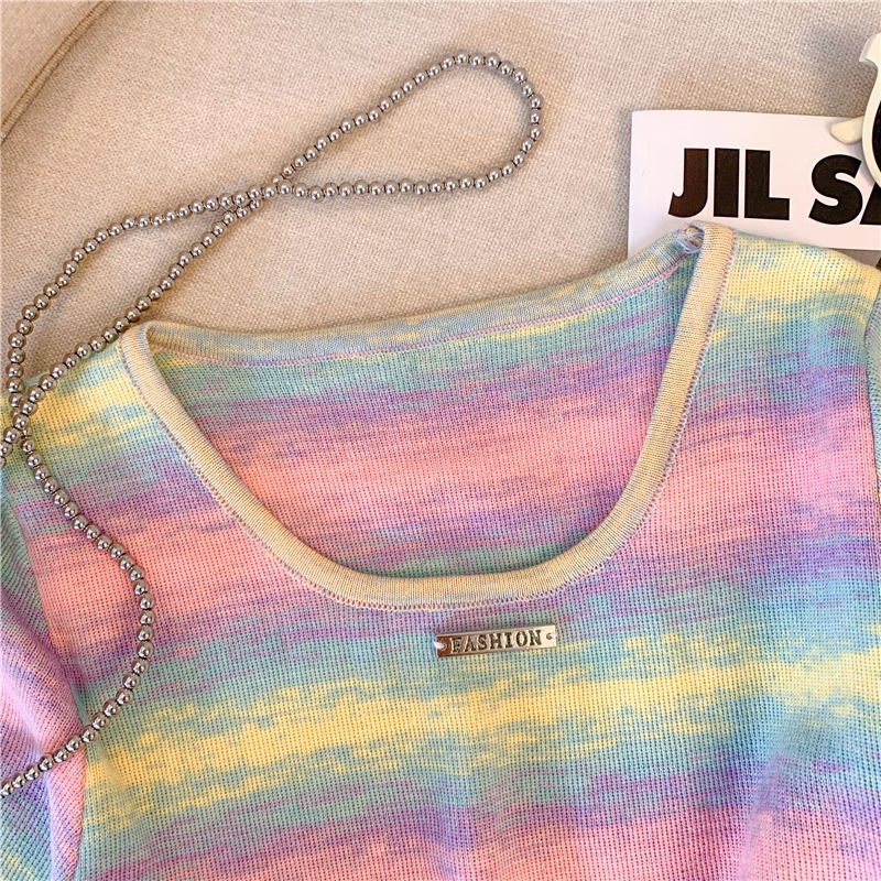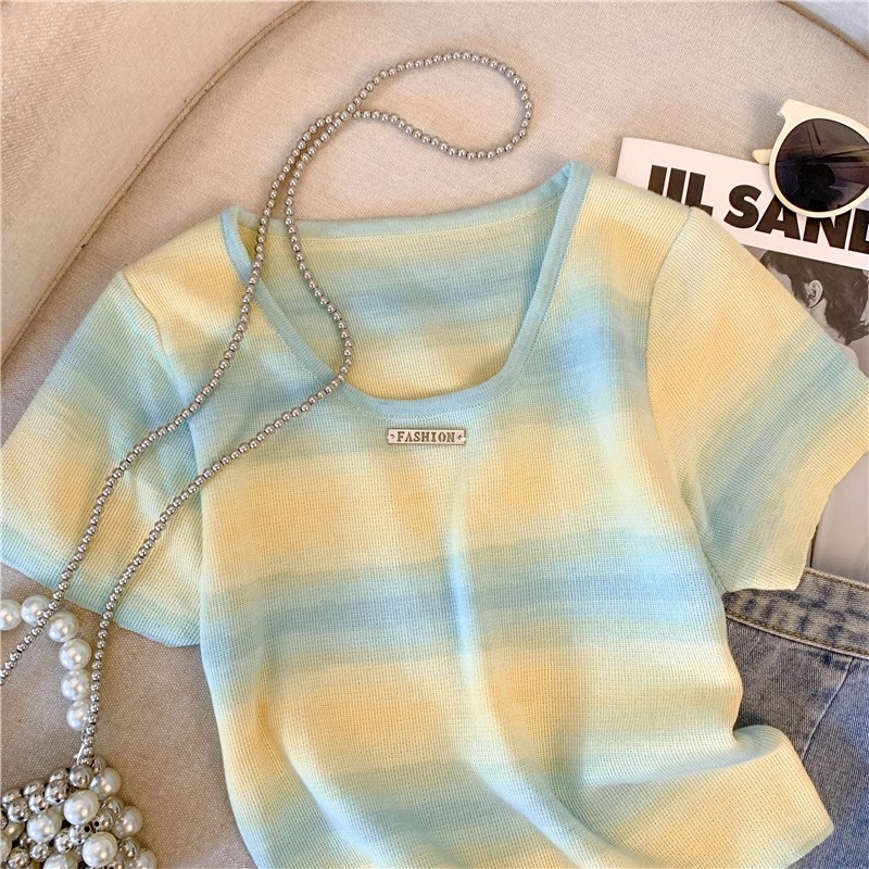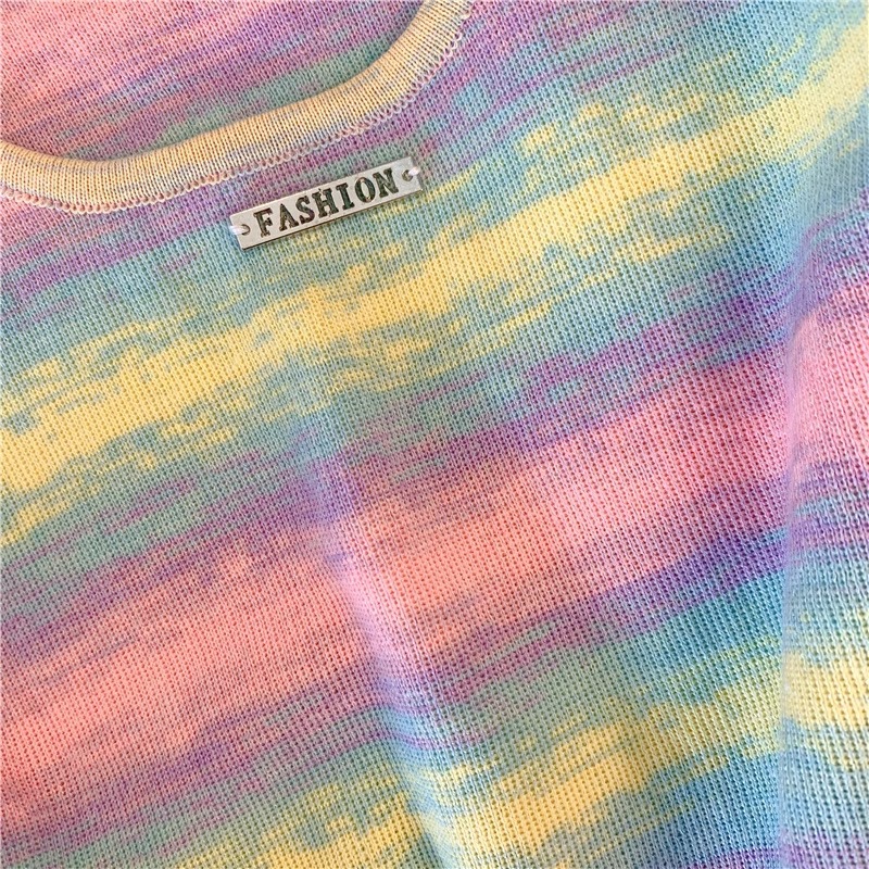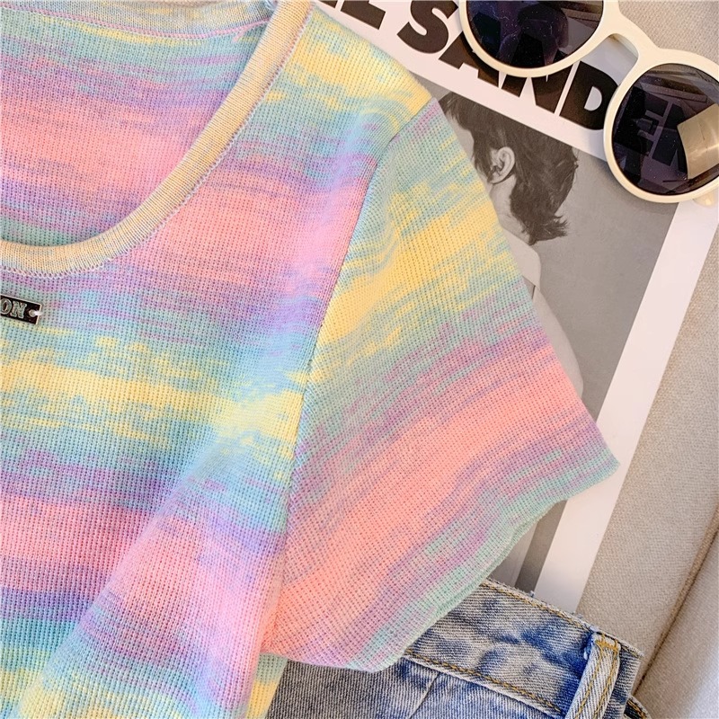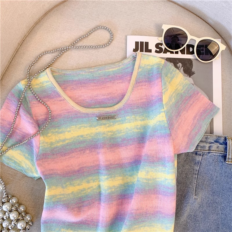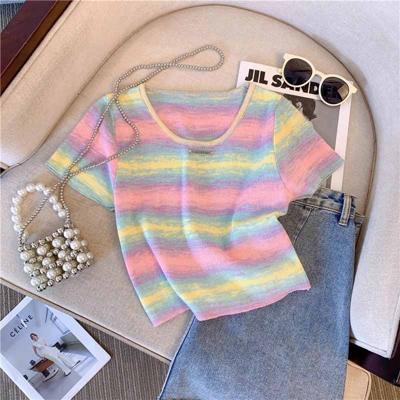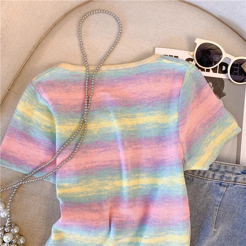 도파민 레인보우 스트라이프 스퀘어 칼라 니트 숄더 반팔 티셔츠 여성용 여름 달콤하고 뜨거운 짧은 탕람 탑스토어 가기