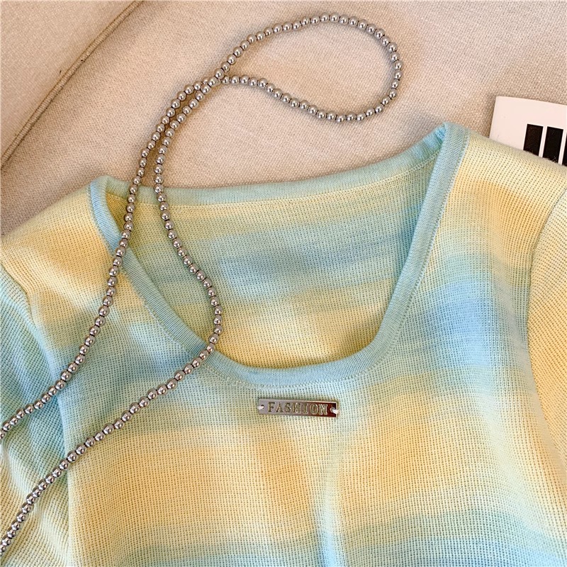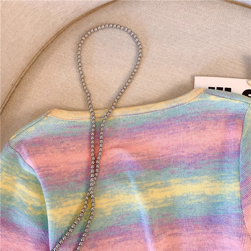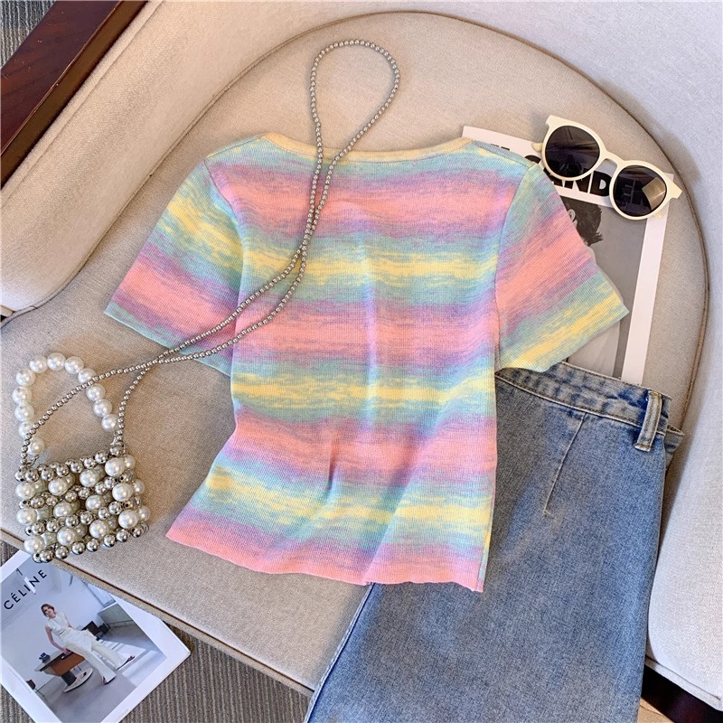도파민 레인보우 스트라이프 스퀘어 칼라 니트 숄더 반팔 티셔츠 여성용 여름 달콤하고 뜨거운 짧은 탕람 탑