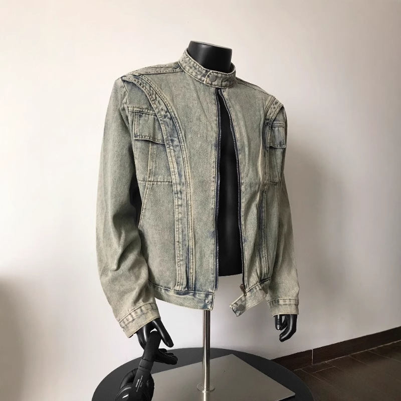 미국 스타일 하이 스트리트 해체 중공업 세척 어깨 패드 데님 재킷 남성 봄과 가을 느슨한 브랜드 바느질 프로필 재킷