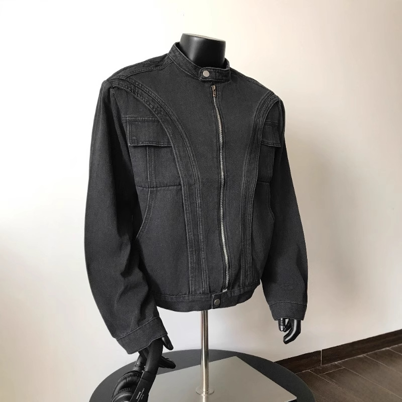 미국 스타일 하이 스트리트 해체 중공업 세척 어깨 패드 데님 재킷 남성 봄과 가을 느슨한 브랜드 바느질 프로필 재킷스토어 가기