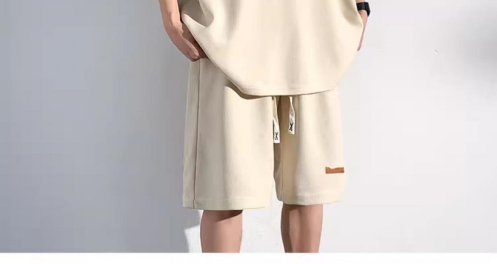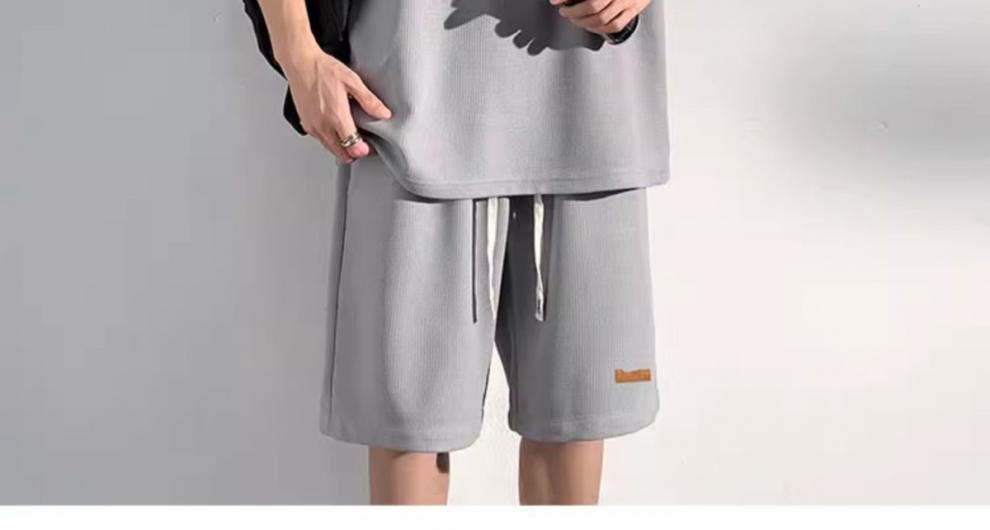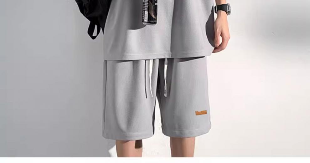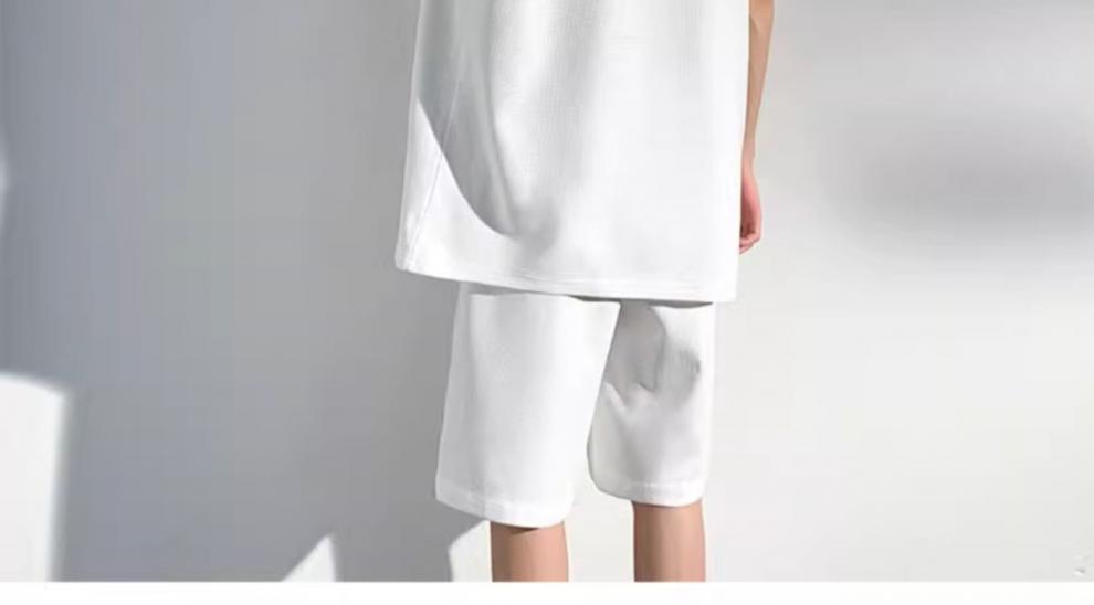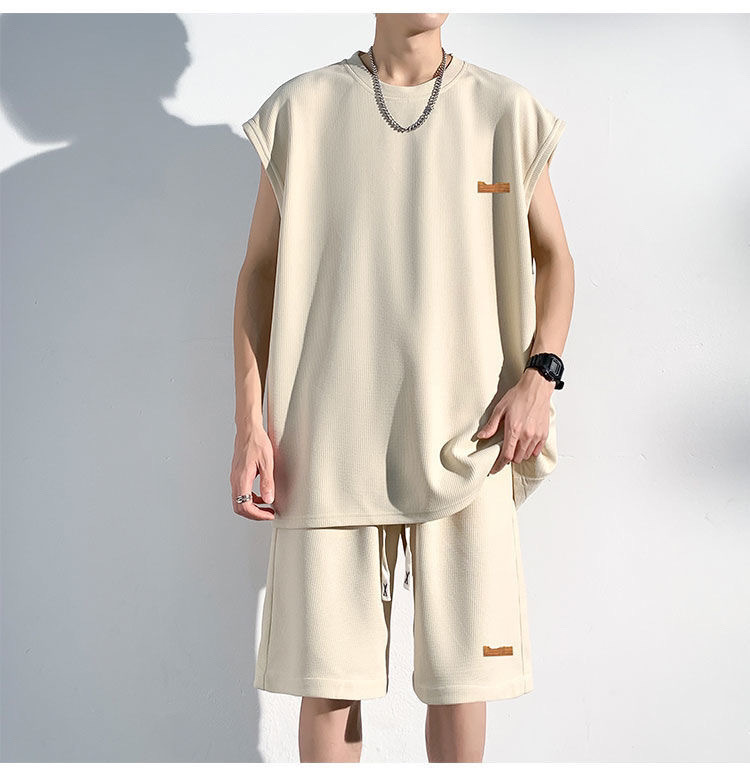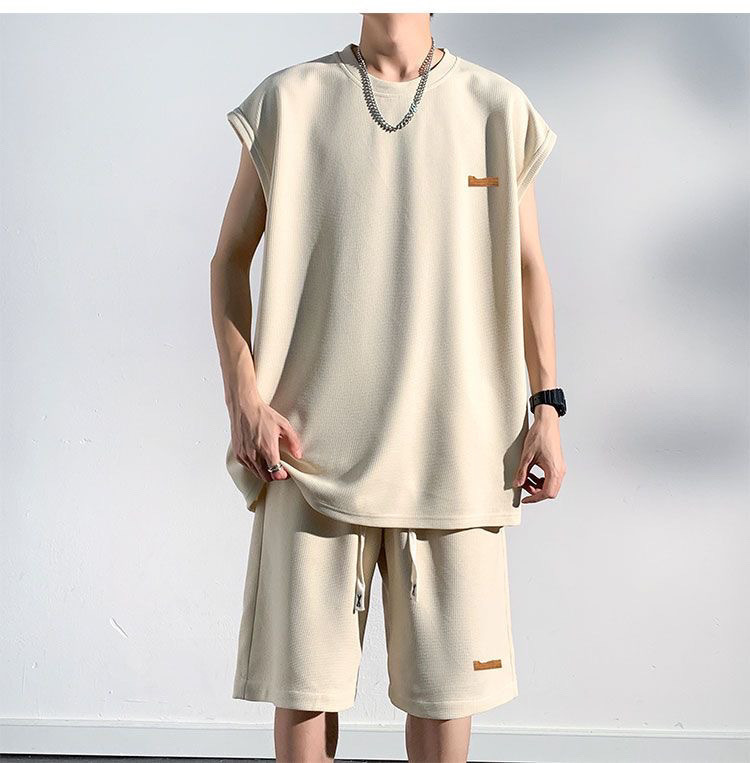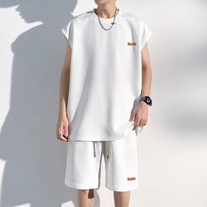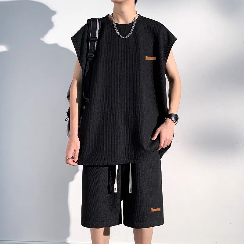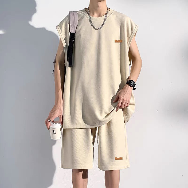 남성용 민소매 셔츠 여름 아이스 실크 빠른 건조 조끼 스포츠 세트 반바지 피트니스 러닝 느슨한 반소매 웨이스트 코트