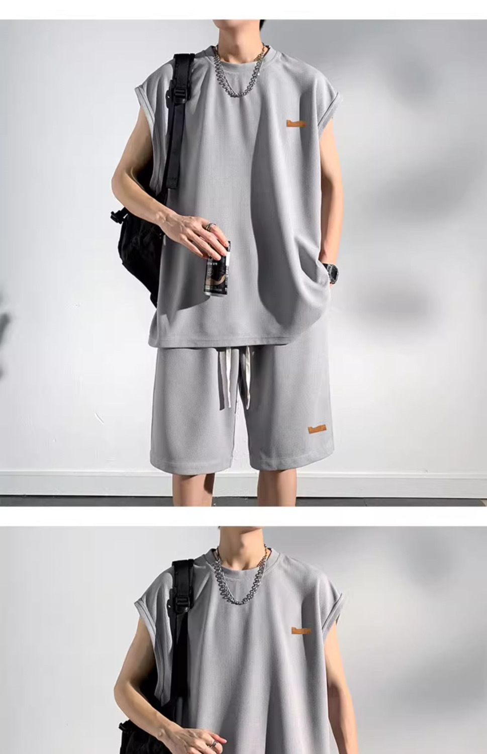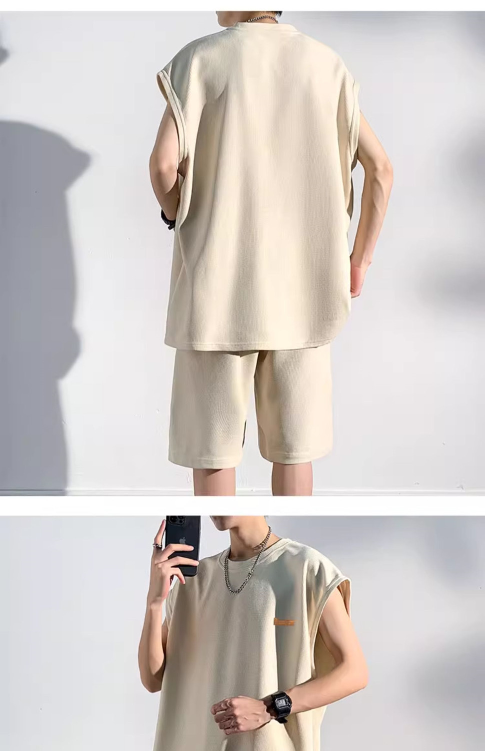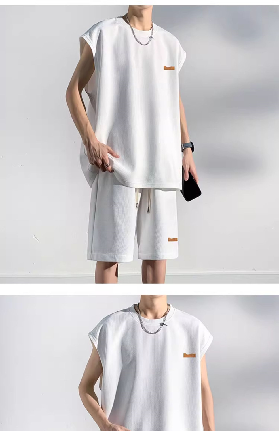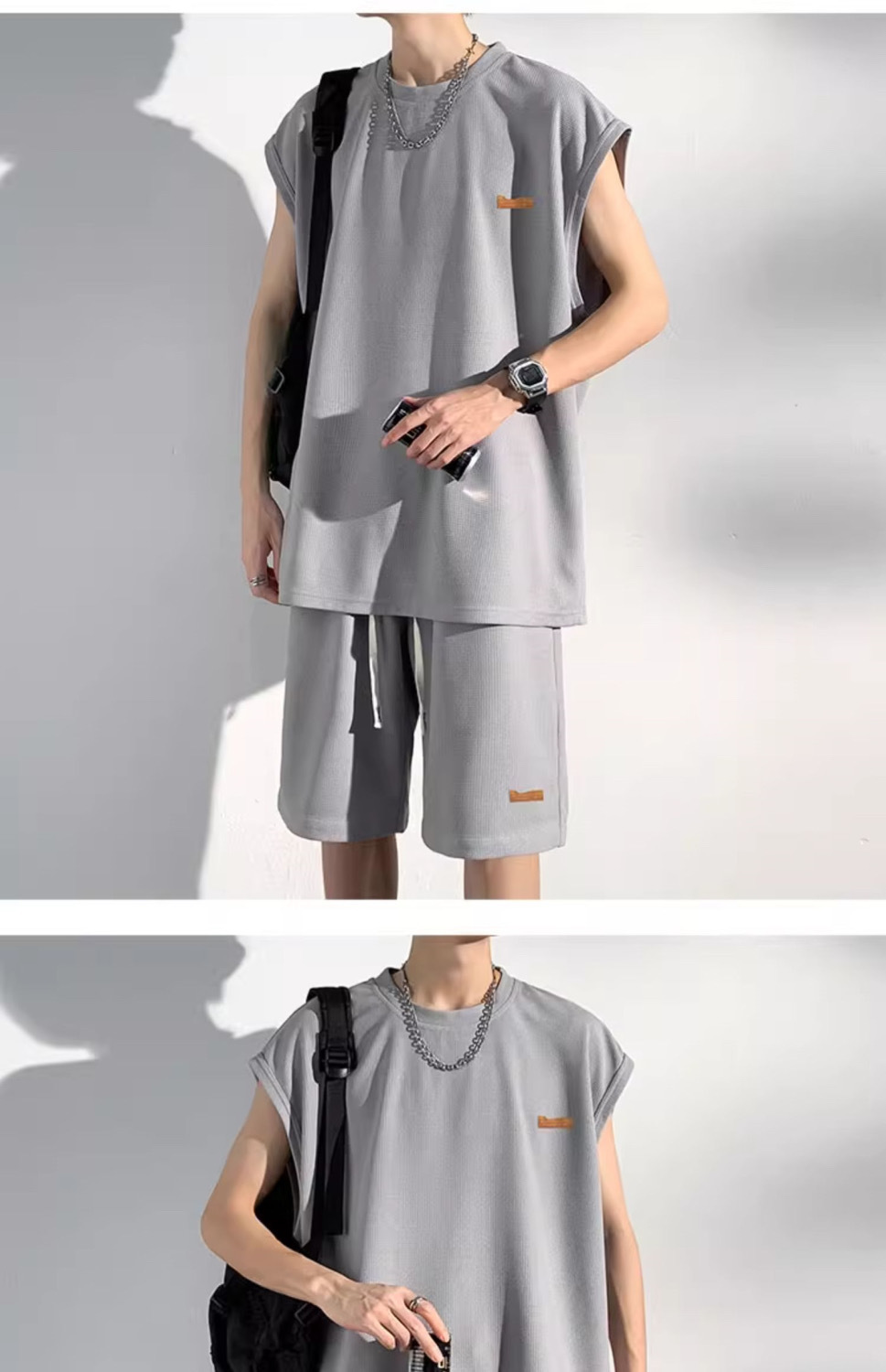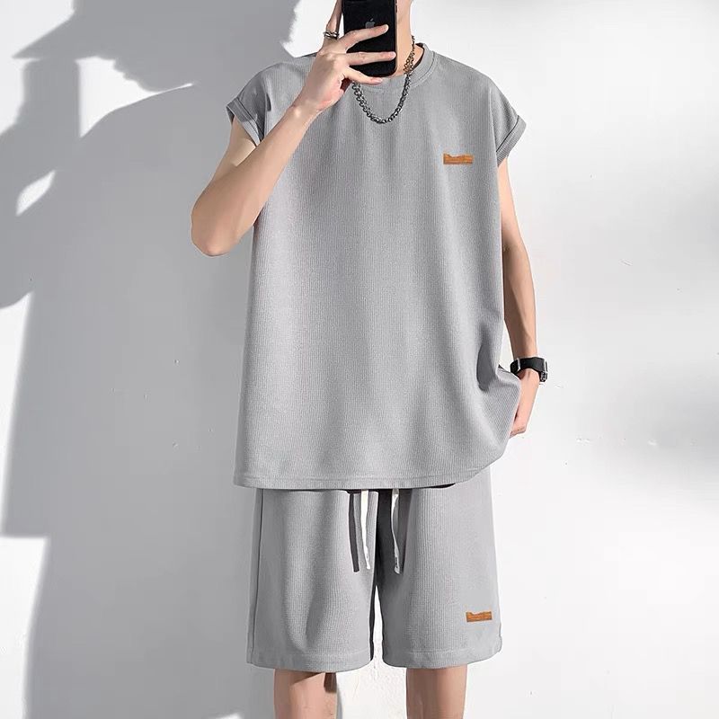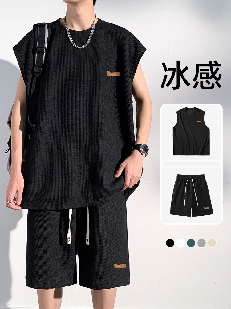 남성용 민소매 셔츠 여름 아이스 실크 빠른 건조 조끼 스포츠 세트 반바지 피트니스 러닝 느슨한 반소매 웨이스트 코트스토어 가기