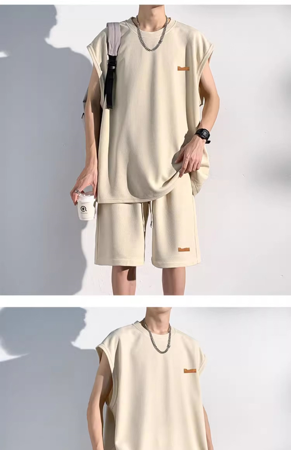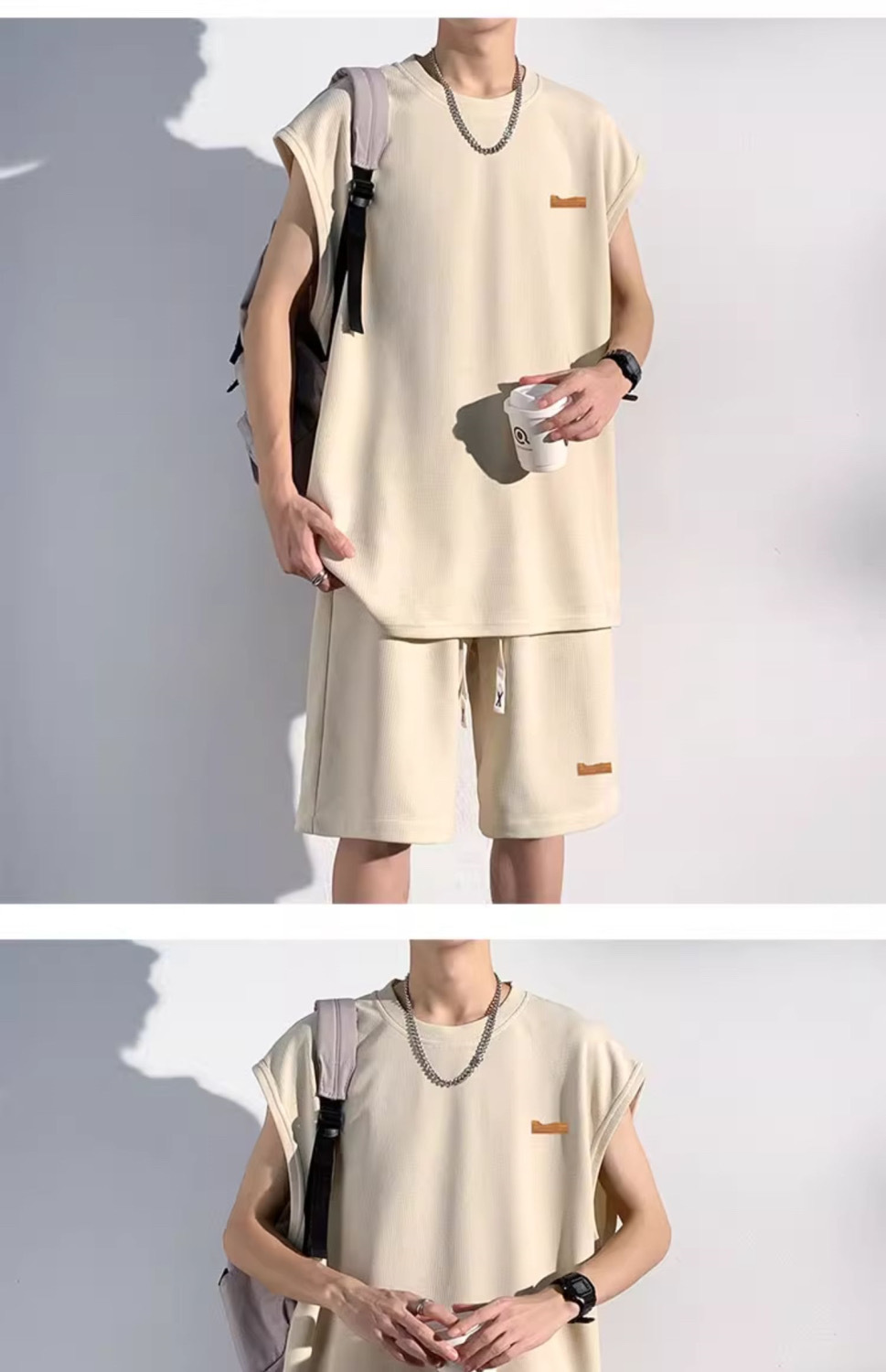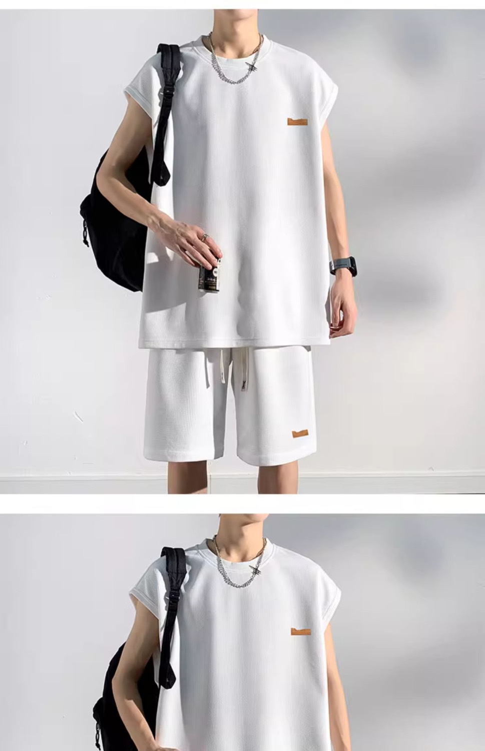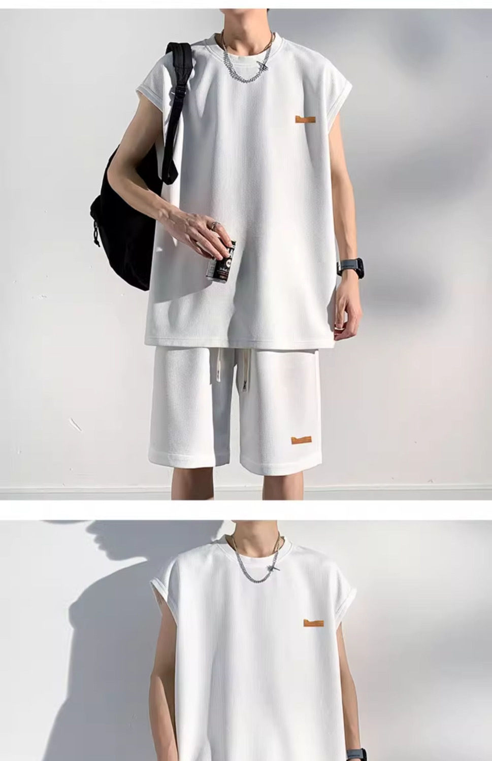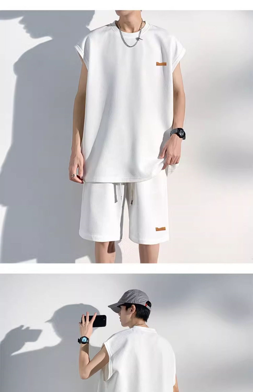 남성용 민소매 셔츠 여름 아이스 실크 빠른 건조 조끼 스포츠 세트 반바지 피트니스 러닝 느슨한 반소매 웨이스트 코트스토어 가기