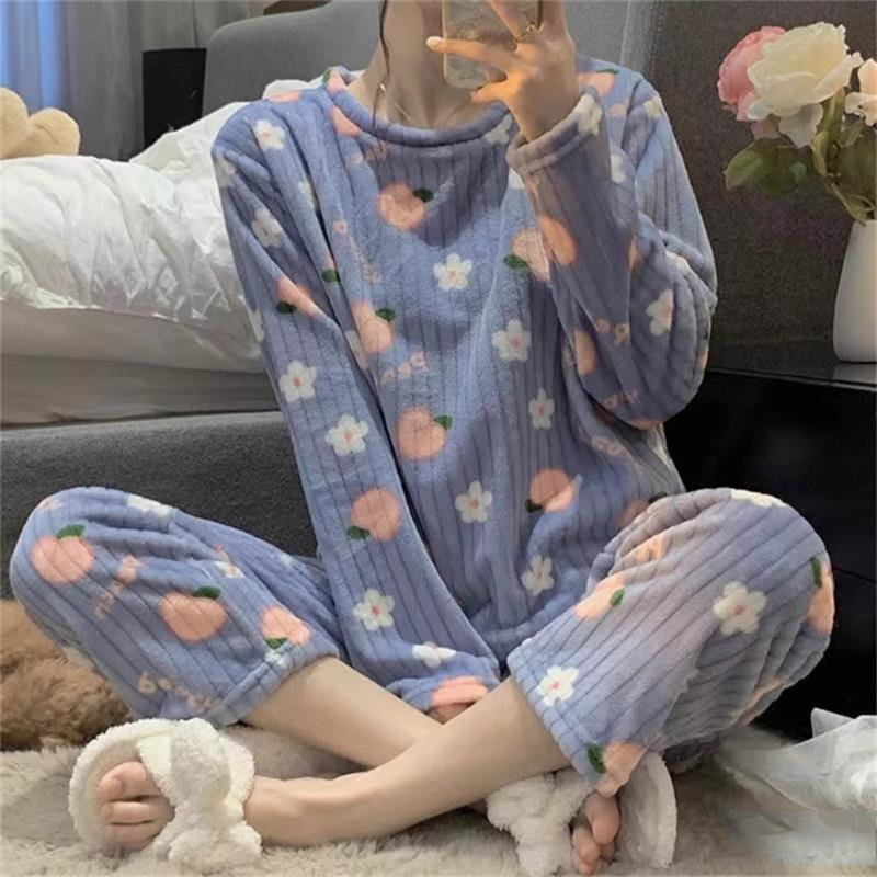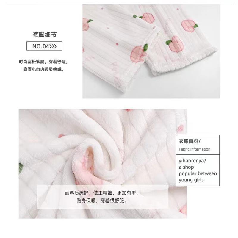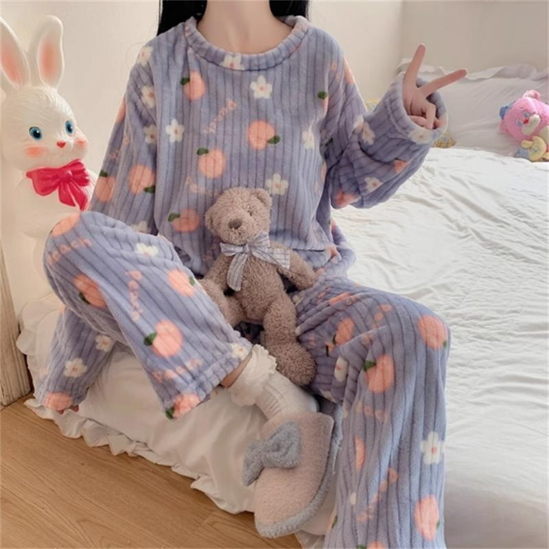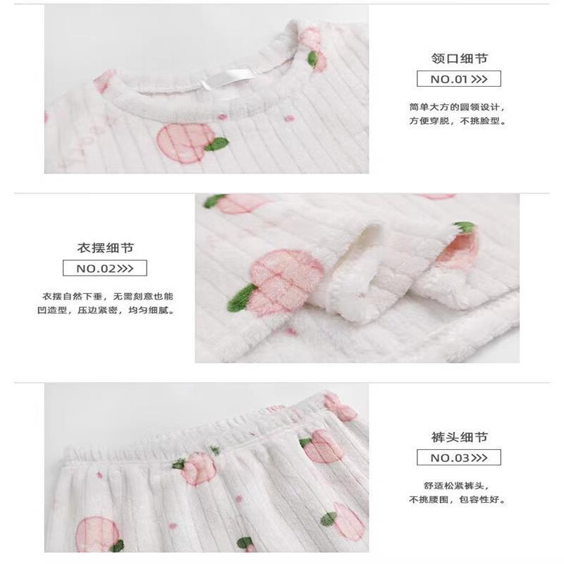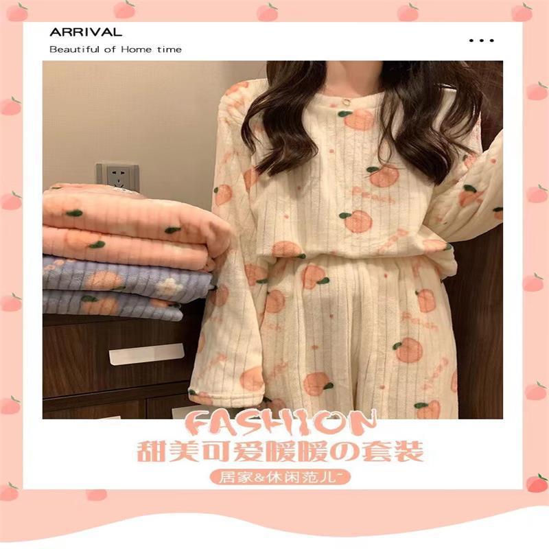 가을과 겨울 새로운 따뜻한 색 여성 잠옷 세트 복숭아 만화 곰 달콤한 공주 스타일 둥근 목 산호 양털