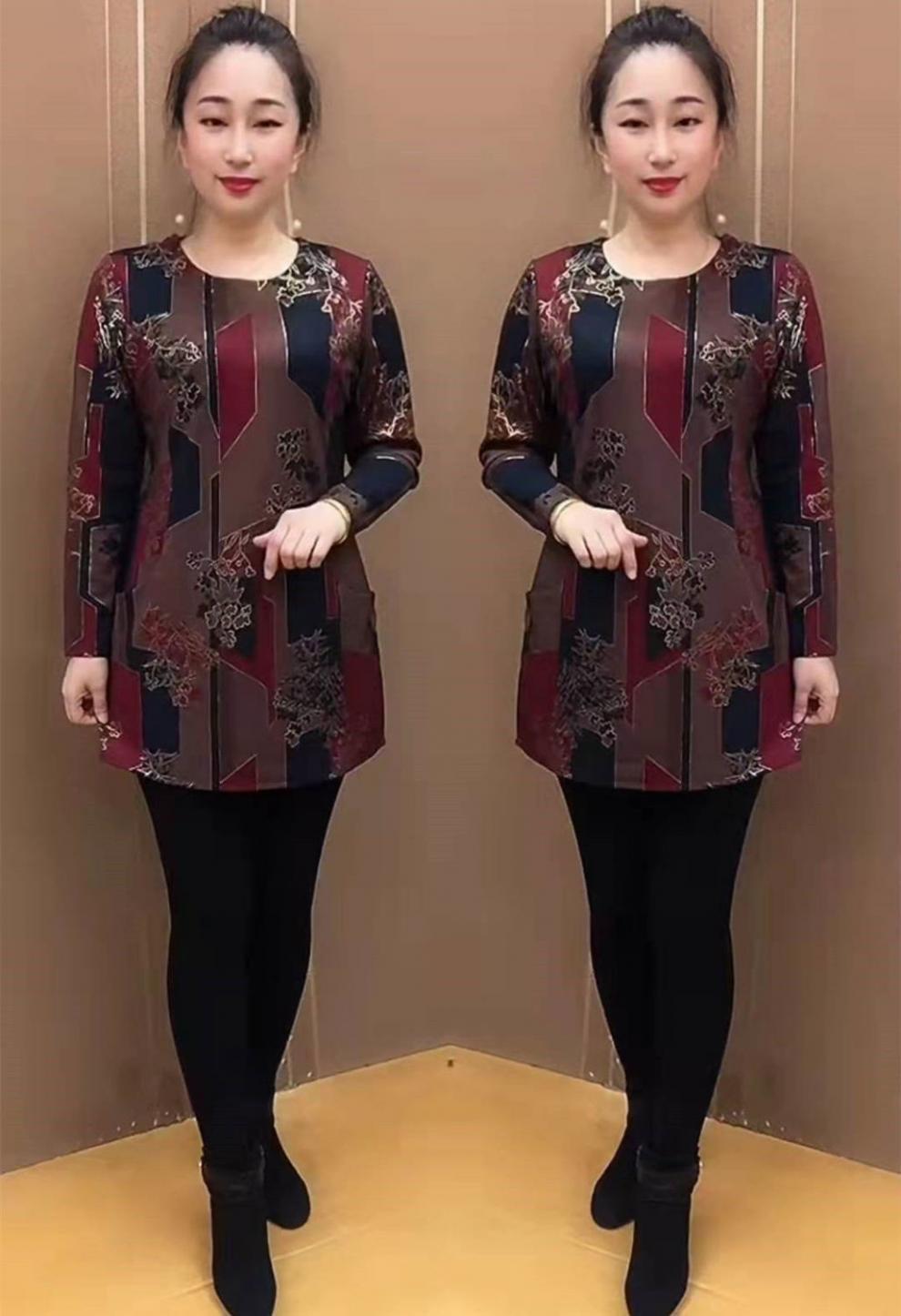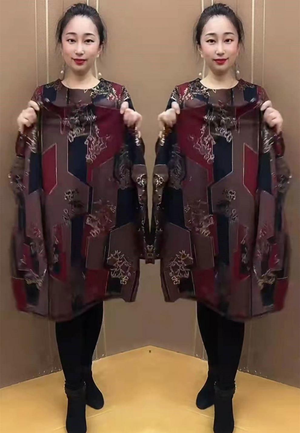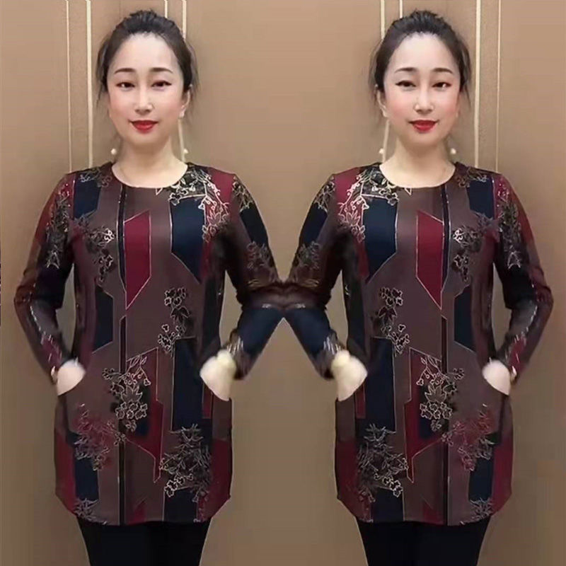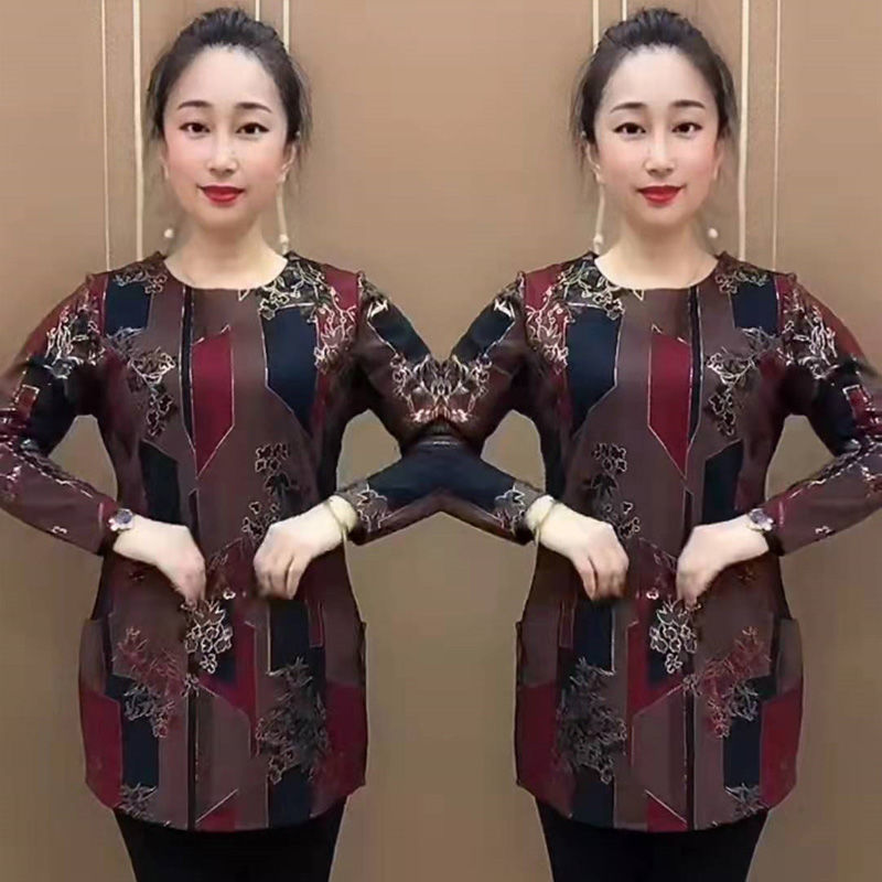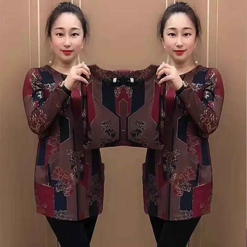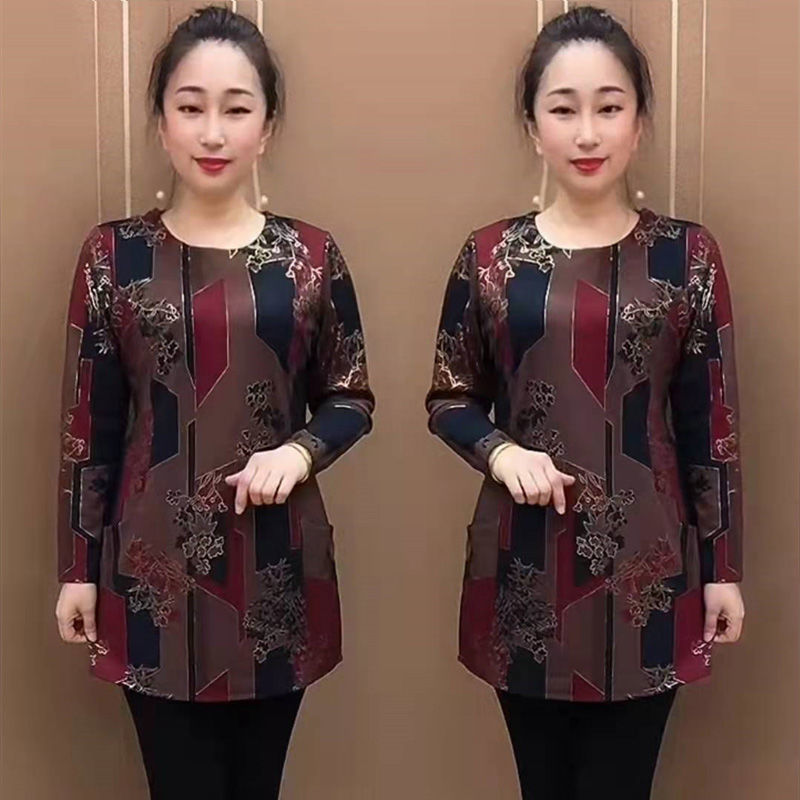2025 년 봄과 가을 새로운 배꼽 인쇄 된베이스 셔츠 플러스 사이즈 여성의 중년 어머니 느슨한 브론징 긴팔 원피스스토어 가기