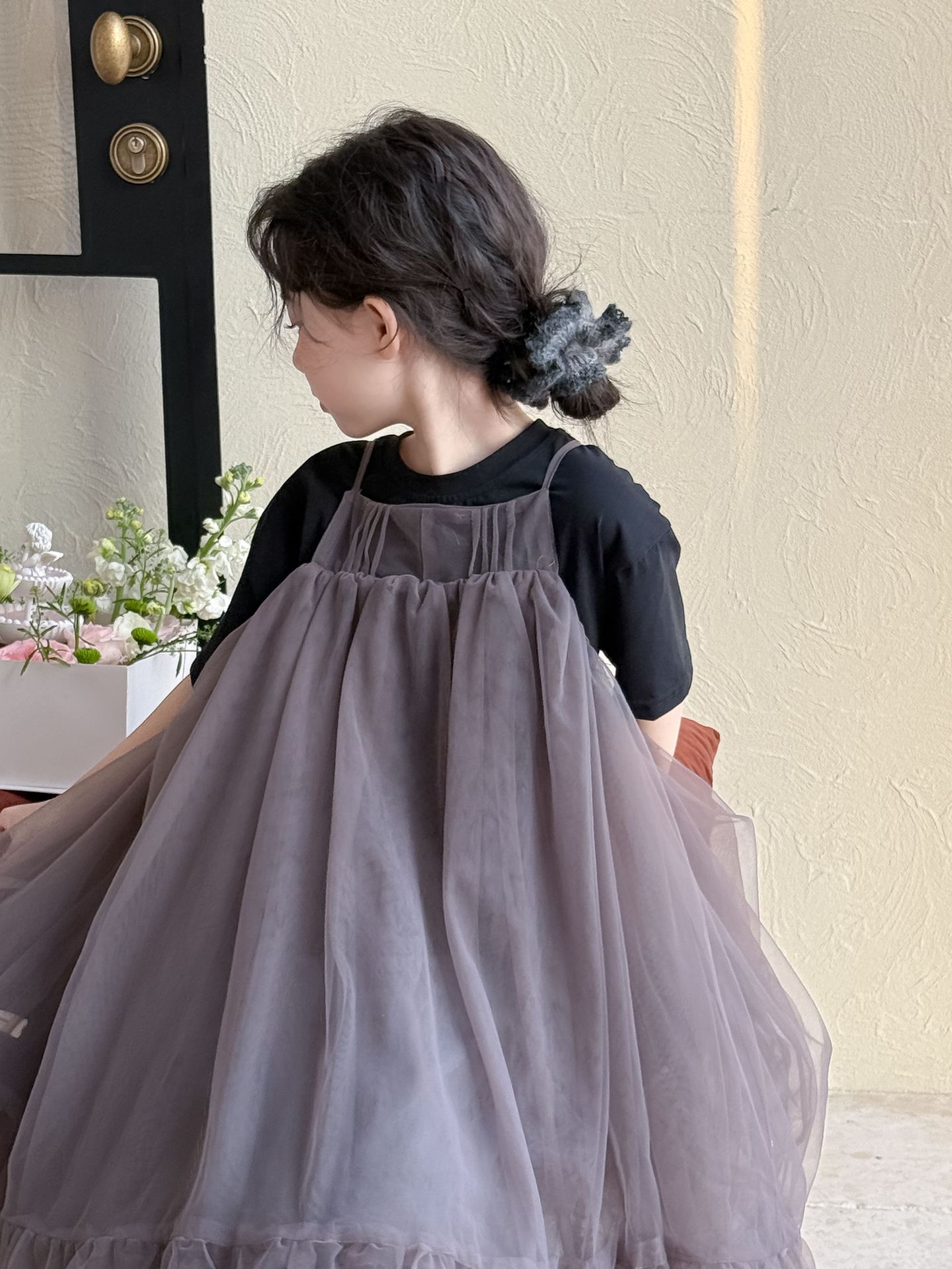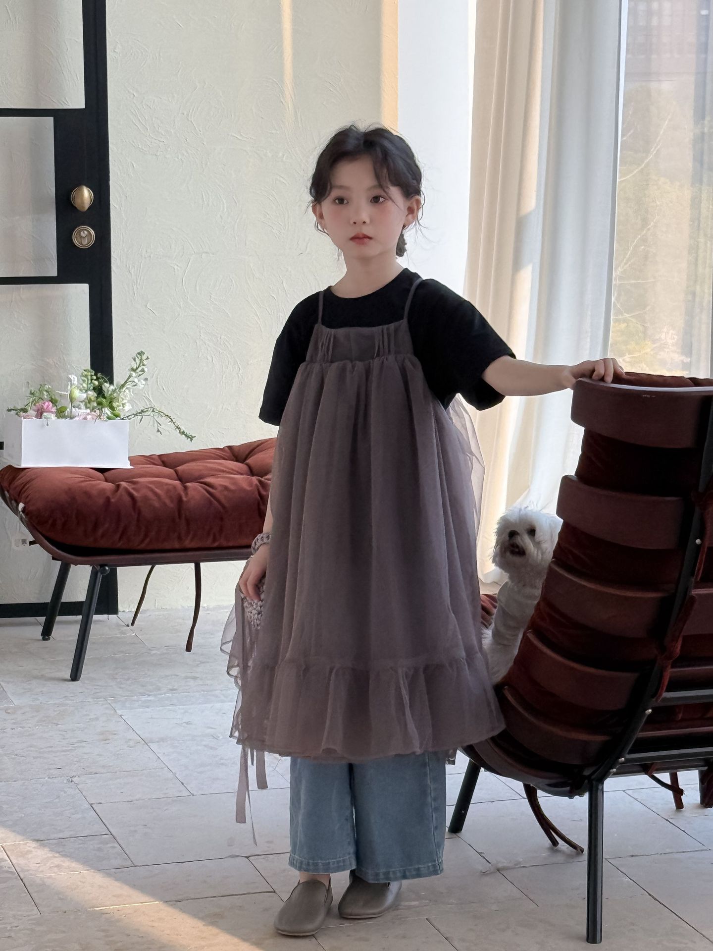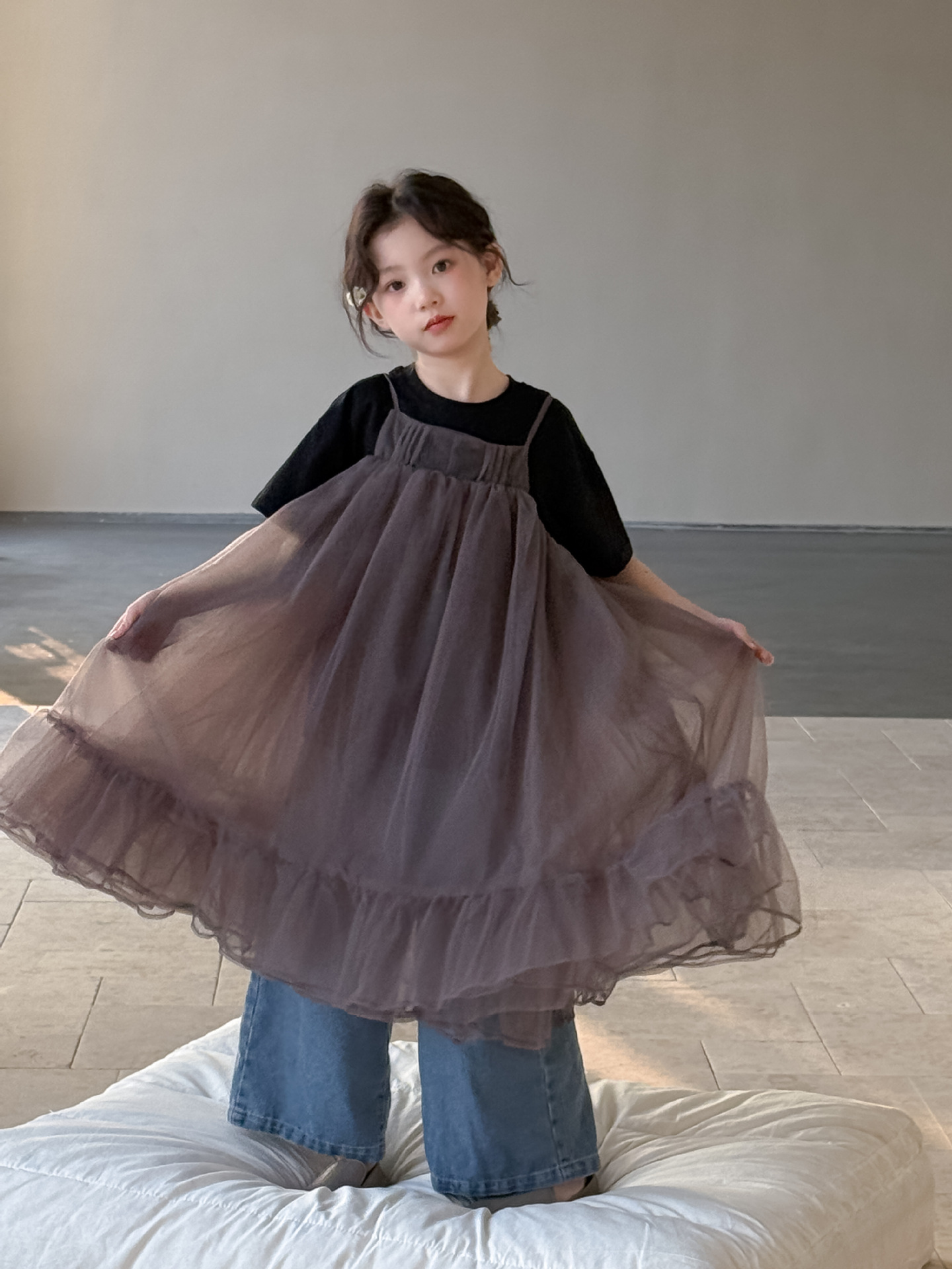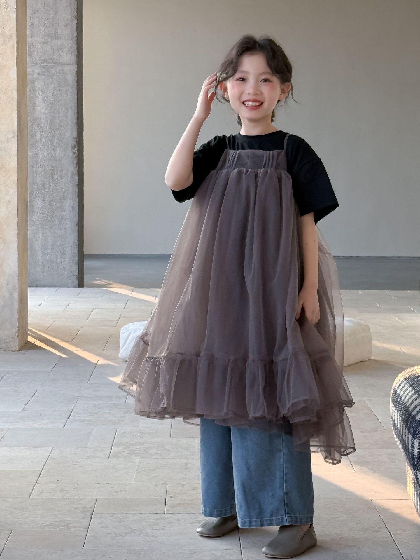 어린이 세트 2025 여름 새 소녀베이스 셔츠 슬링 거즈 스커트 청바지 3 피스 세트 여성 한국식 세트