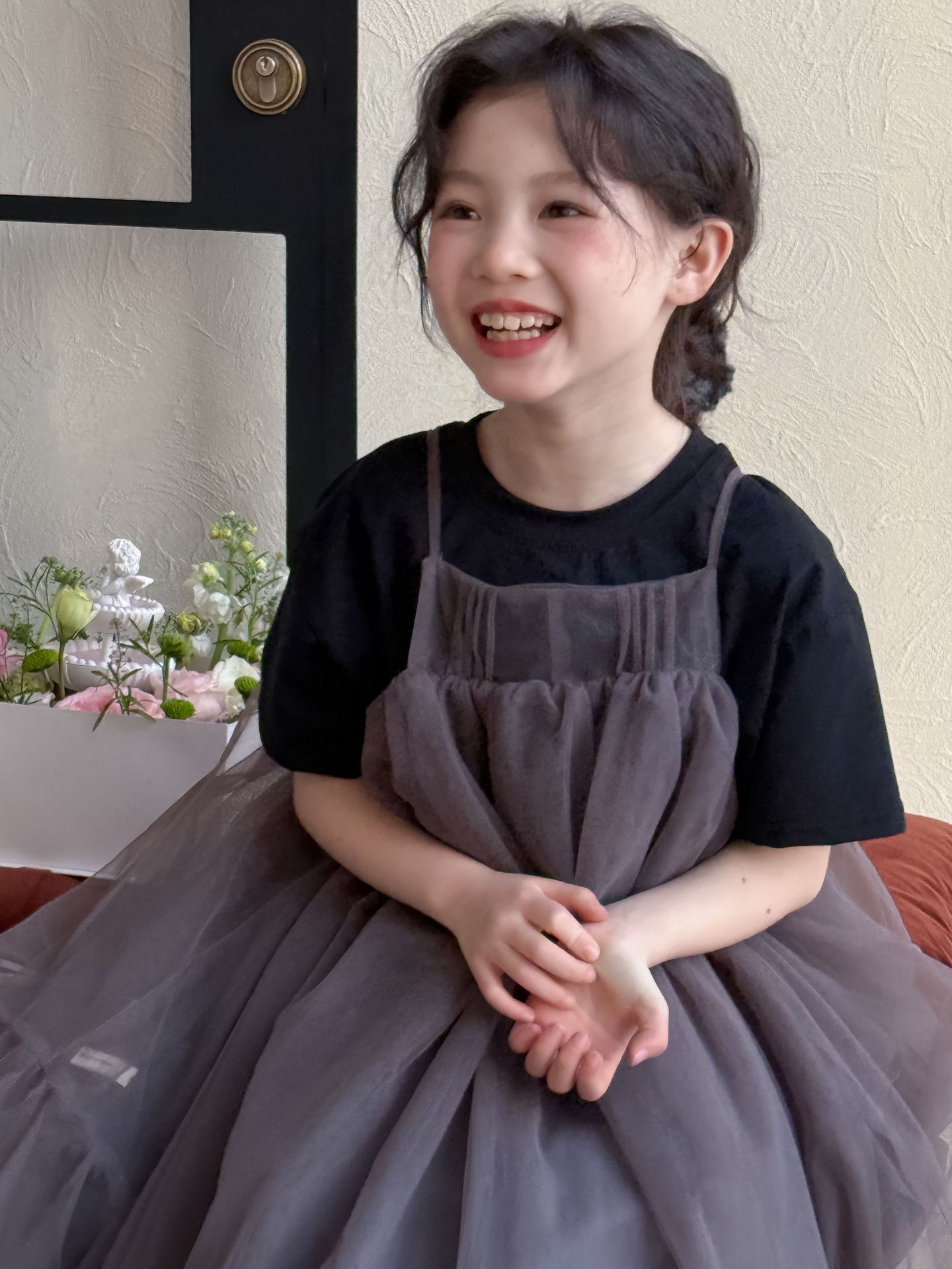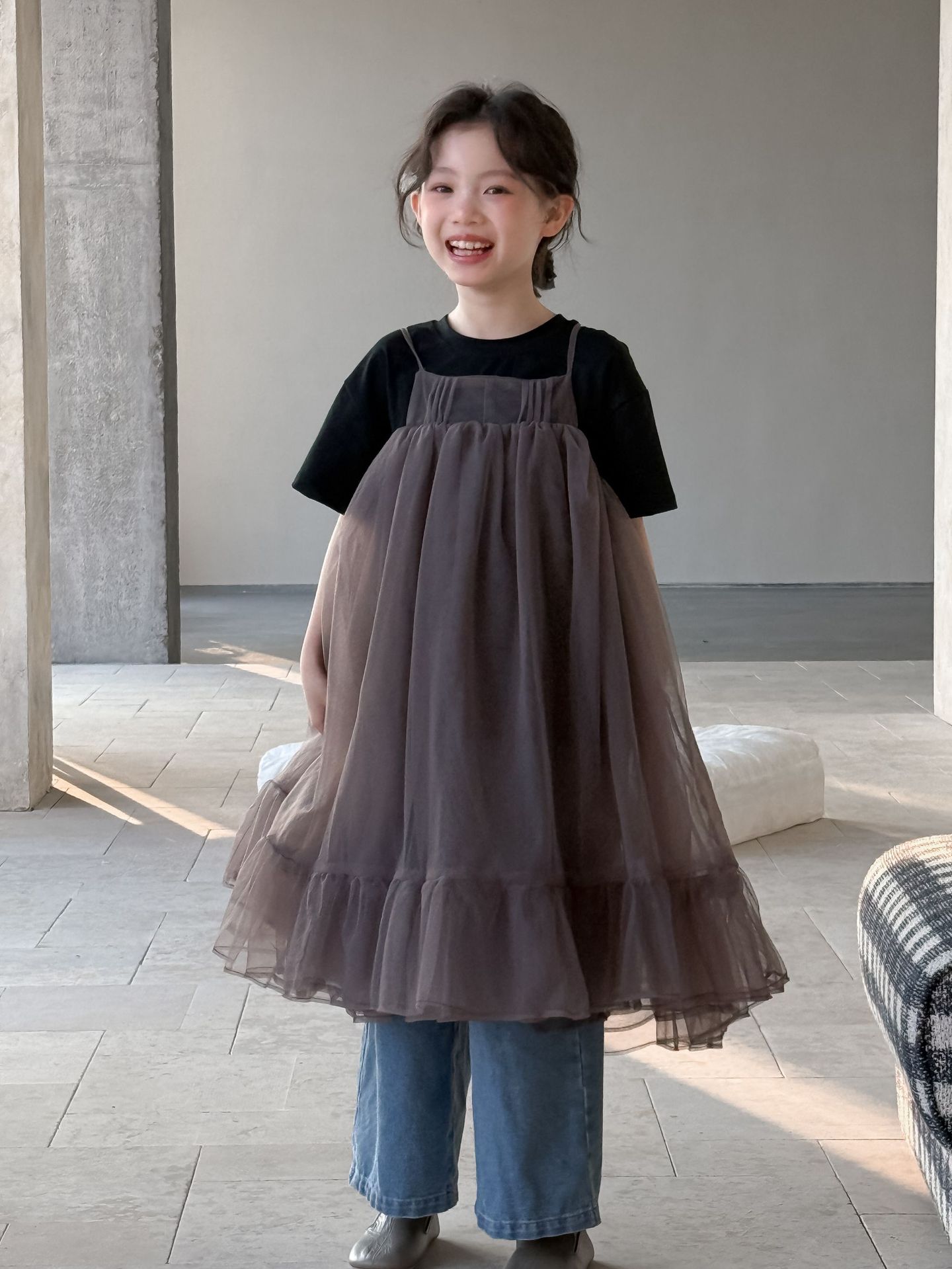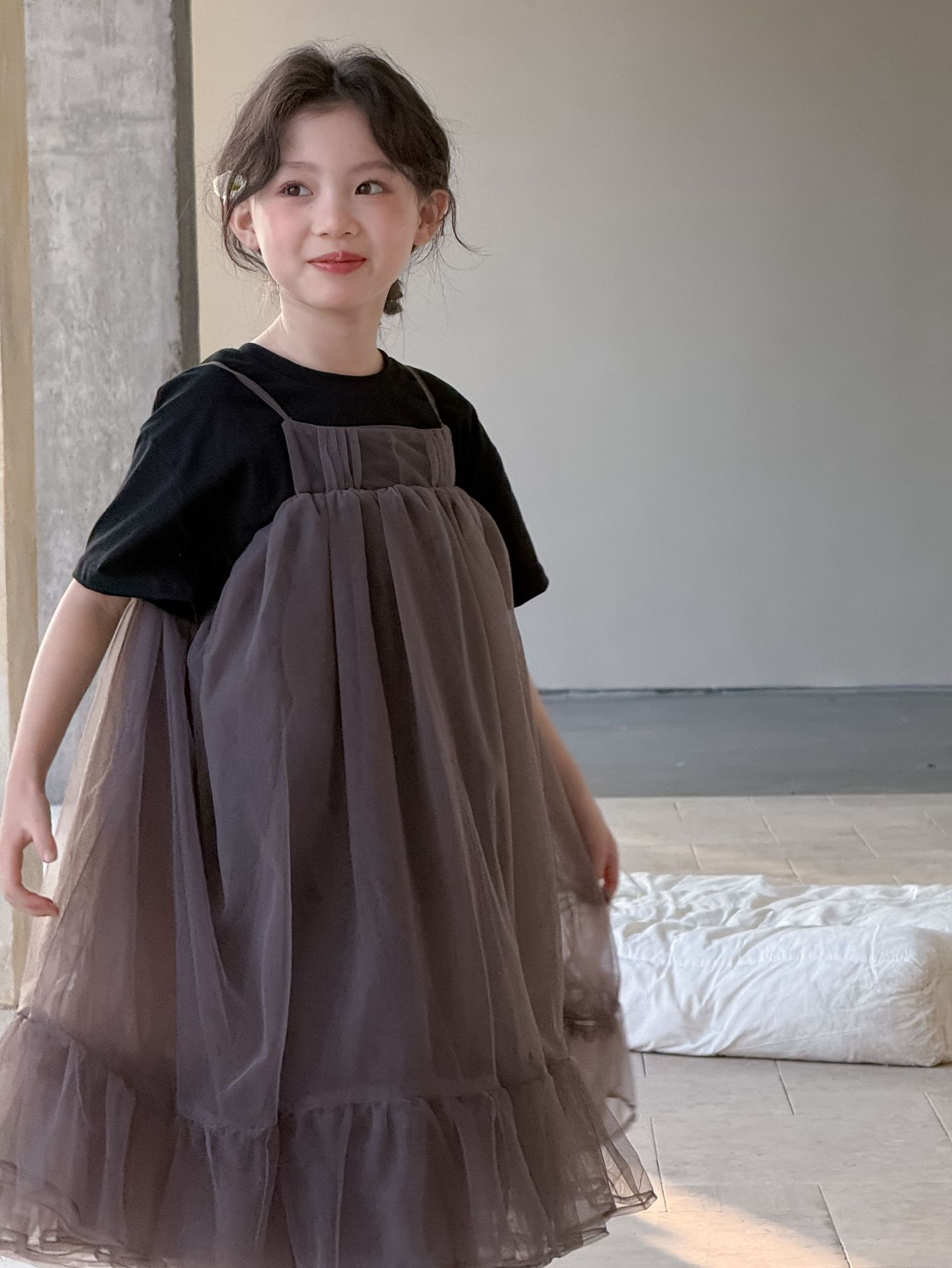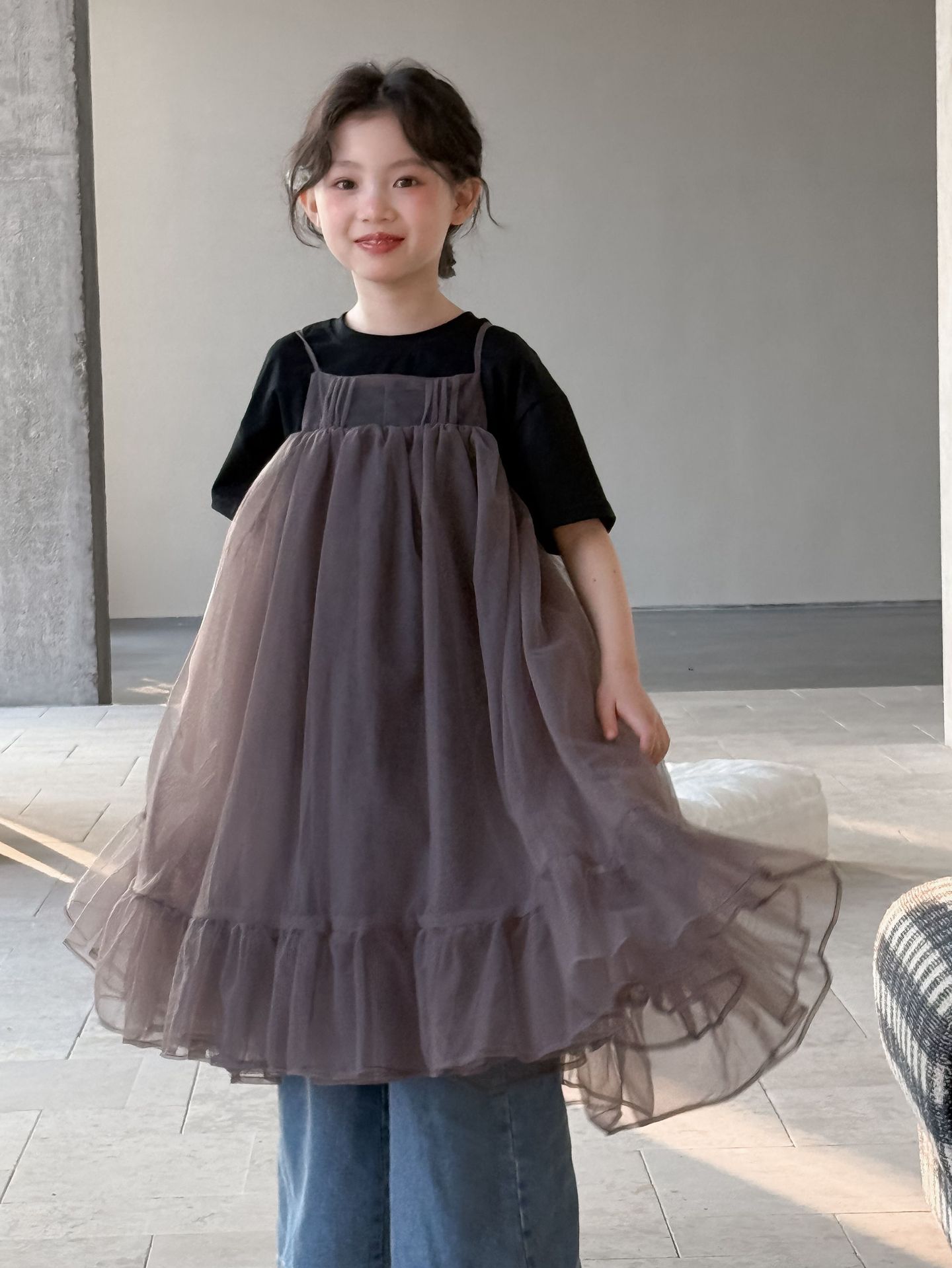 어린이 세트 2025 여름 새 소녀베이스 셔츠 슬링 거즈 스커트 청바지 3 피스 세트 여성 한국식 세트