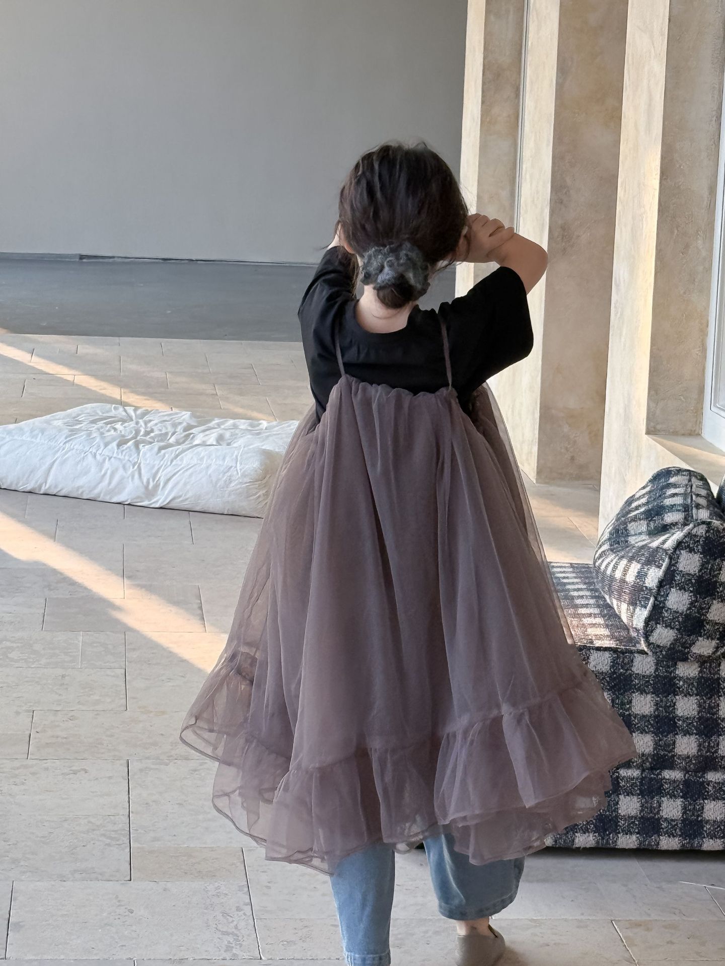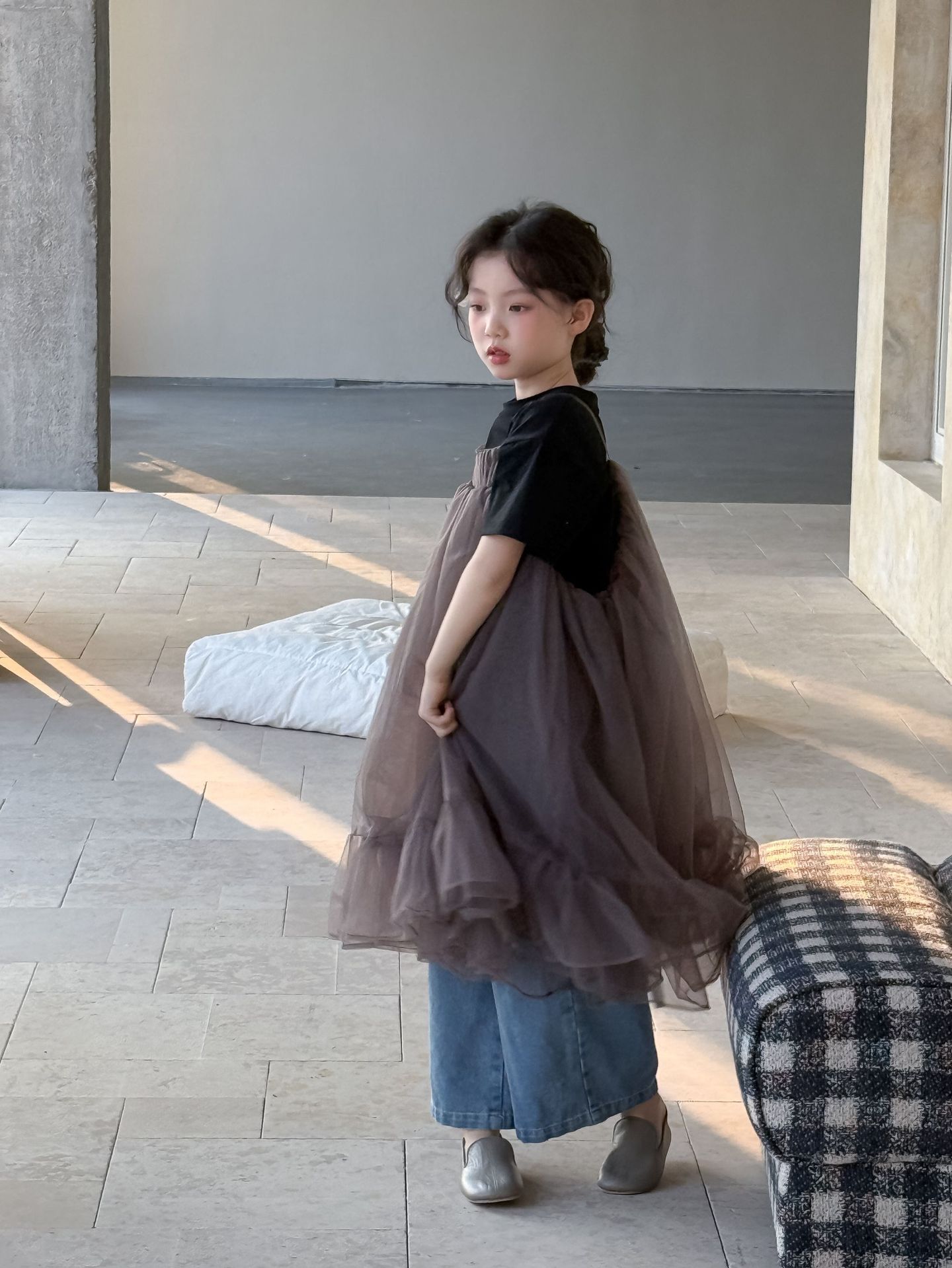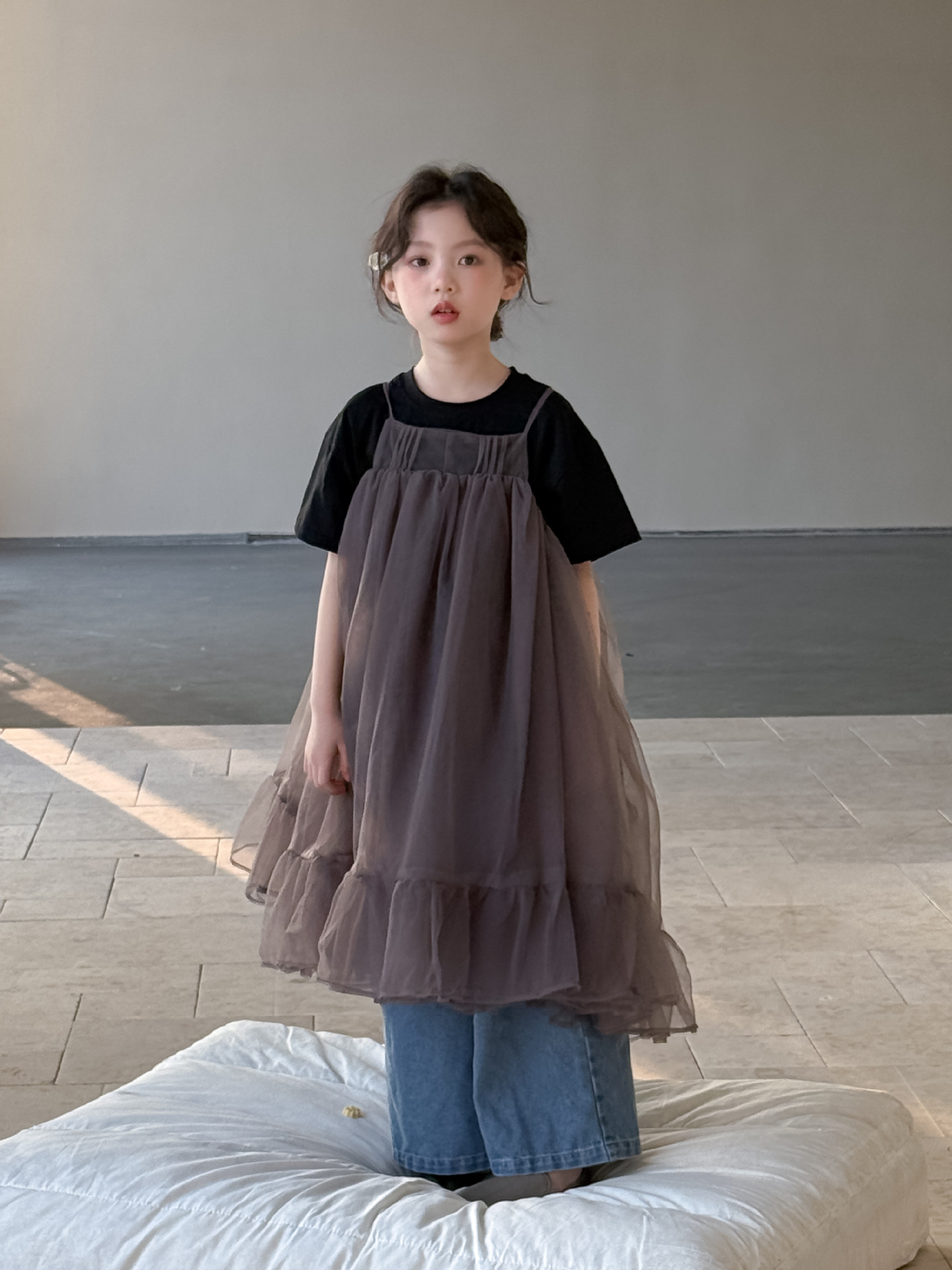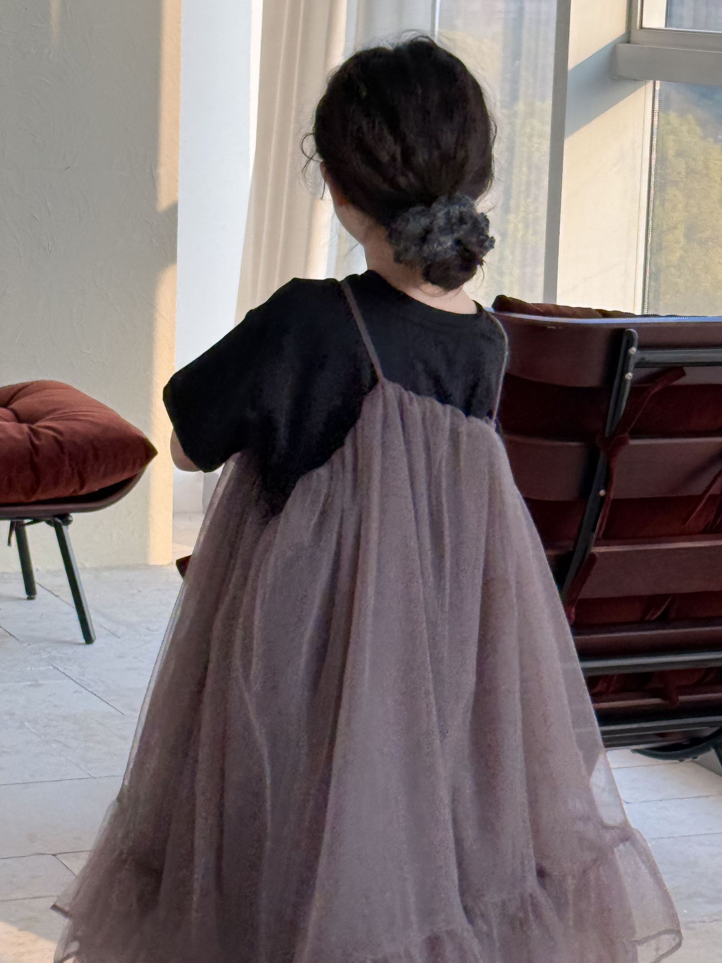 어린이 세트 2025 여름 새 소녀베이스 셔츠 슬링 거즈 스커트 청바지 3 피스 세트 여성 한국식 세트
