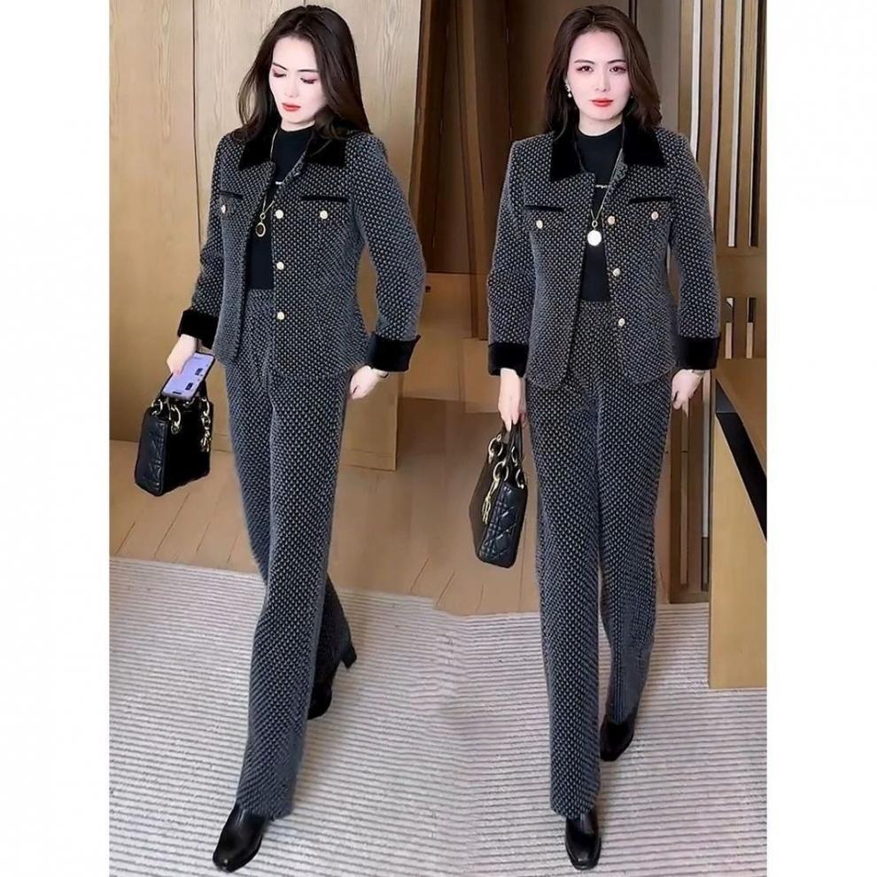 작은 향기로운 스타일의 패션 세트 여성 2025 봄 새로운 기질 두꺼운 코트 넓은 다리 바지 투피스 어머니 복장스토어 가기