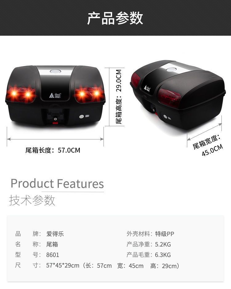 LED 브레이크 라이트로 두껍게 확대 된 Edelor 초대형 범용 오토바이 트렁크 테일 박스