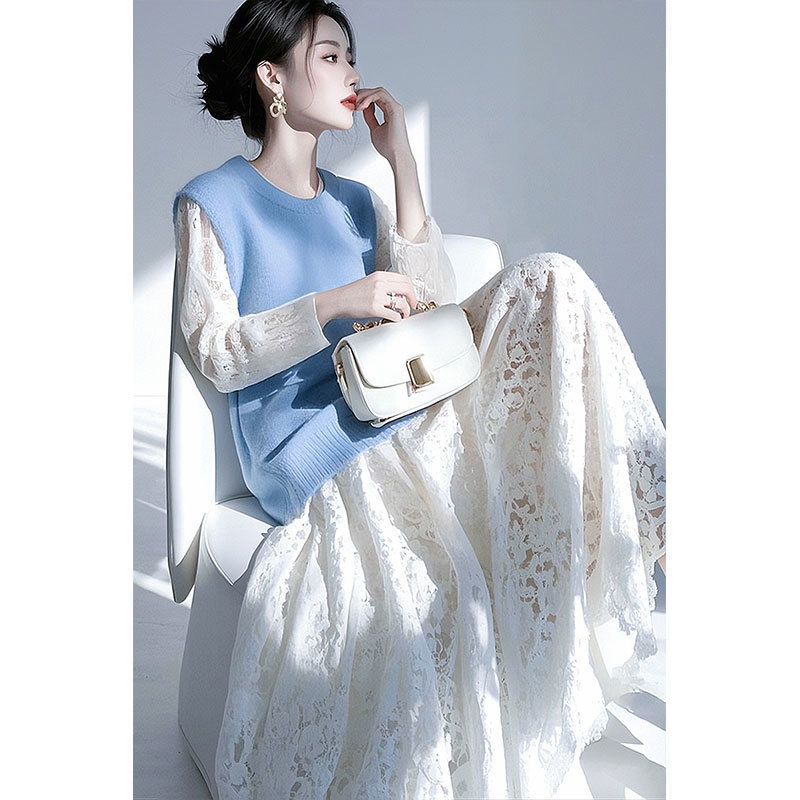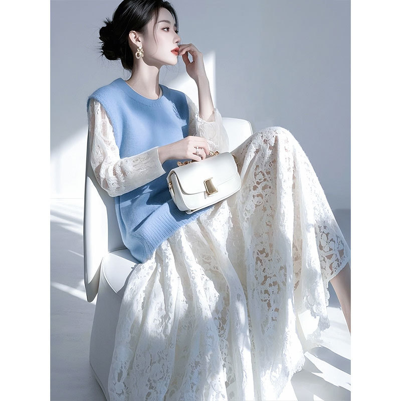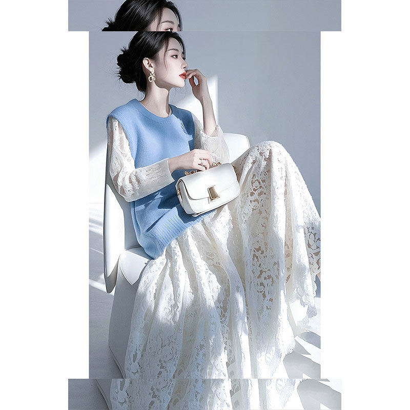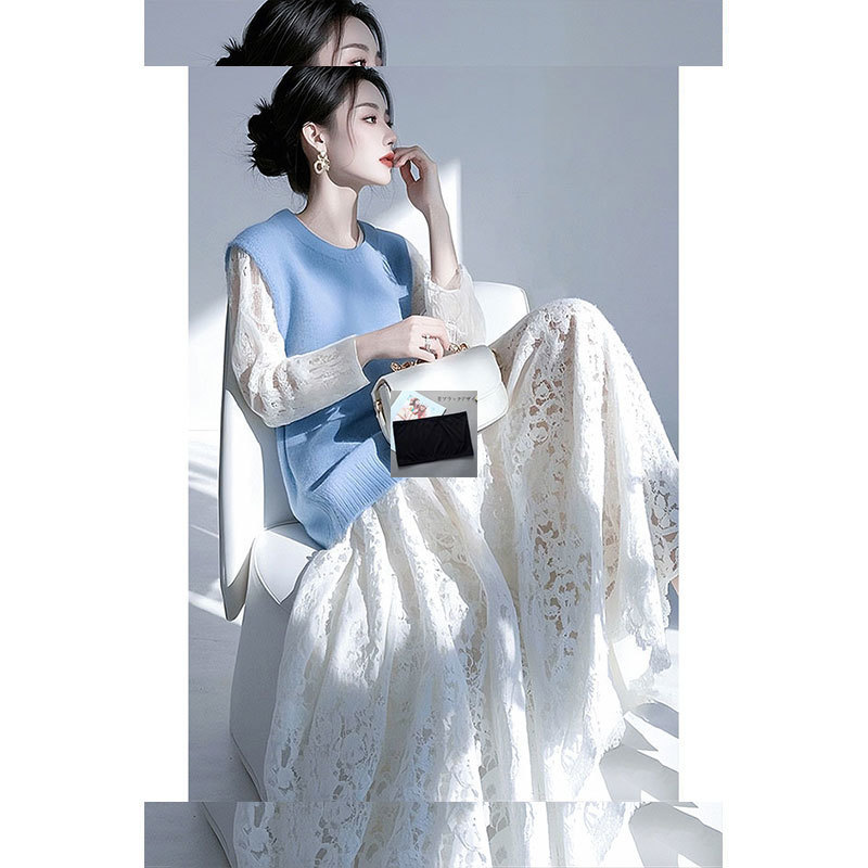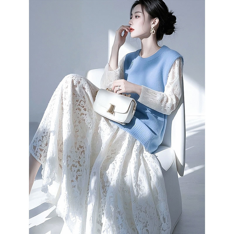 2025 초봄은 세련된 여성 독특하고 아름다운 흰색 레이스 원피스 니트 조끼 세트 착용합니다.스토어 가기
