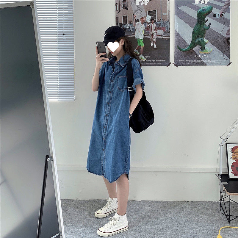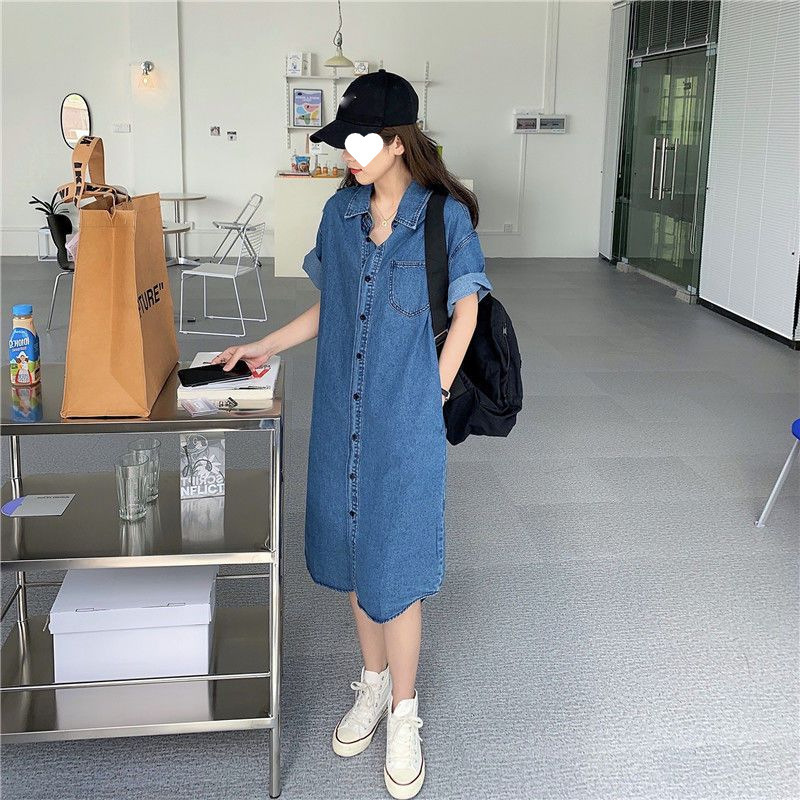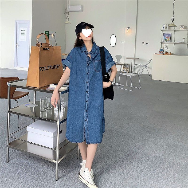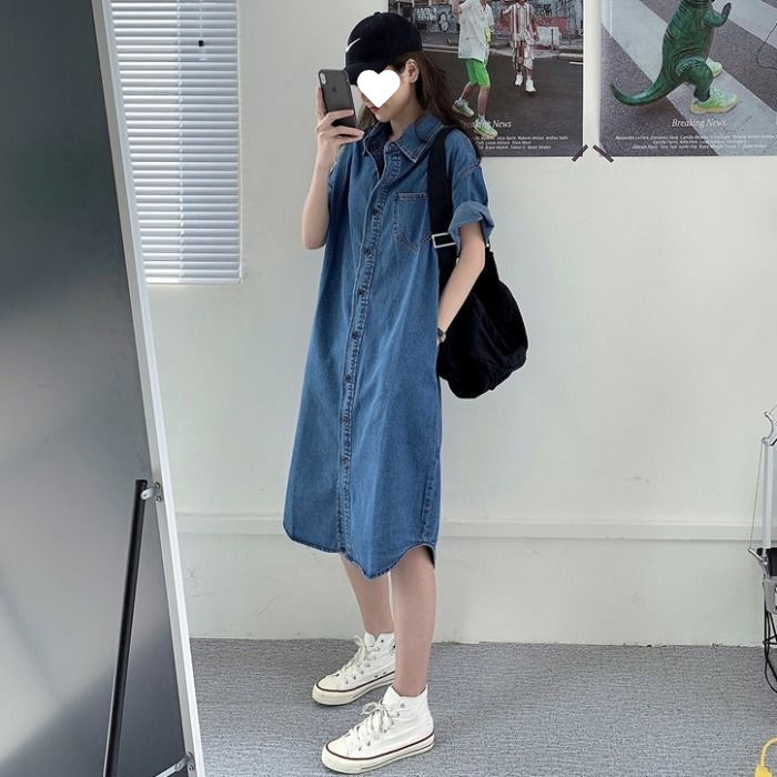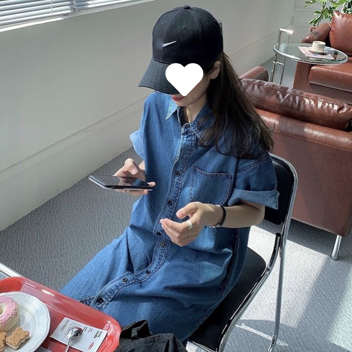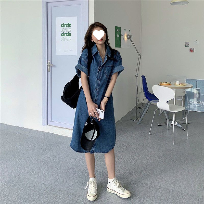 데님 원피스 여성의 봄과 가을 다크 블루 셔츠 원피스 2024 새로운 온라인 인기 한국 느슨한 캐주얼 원피스 트렌디스토어 가기